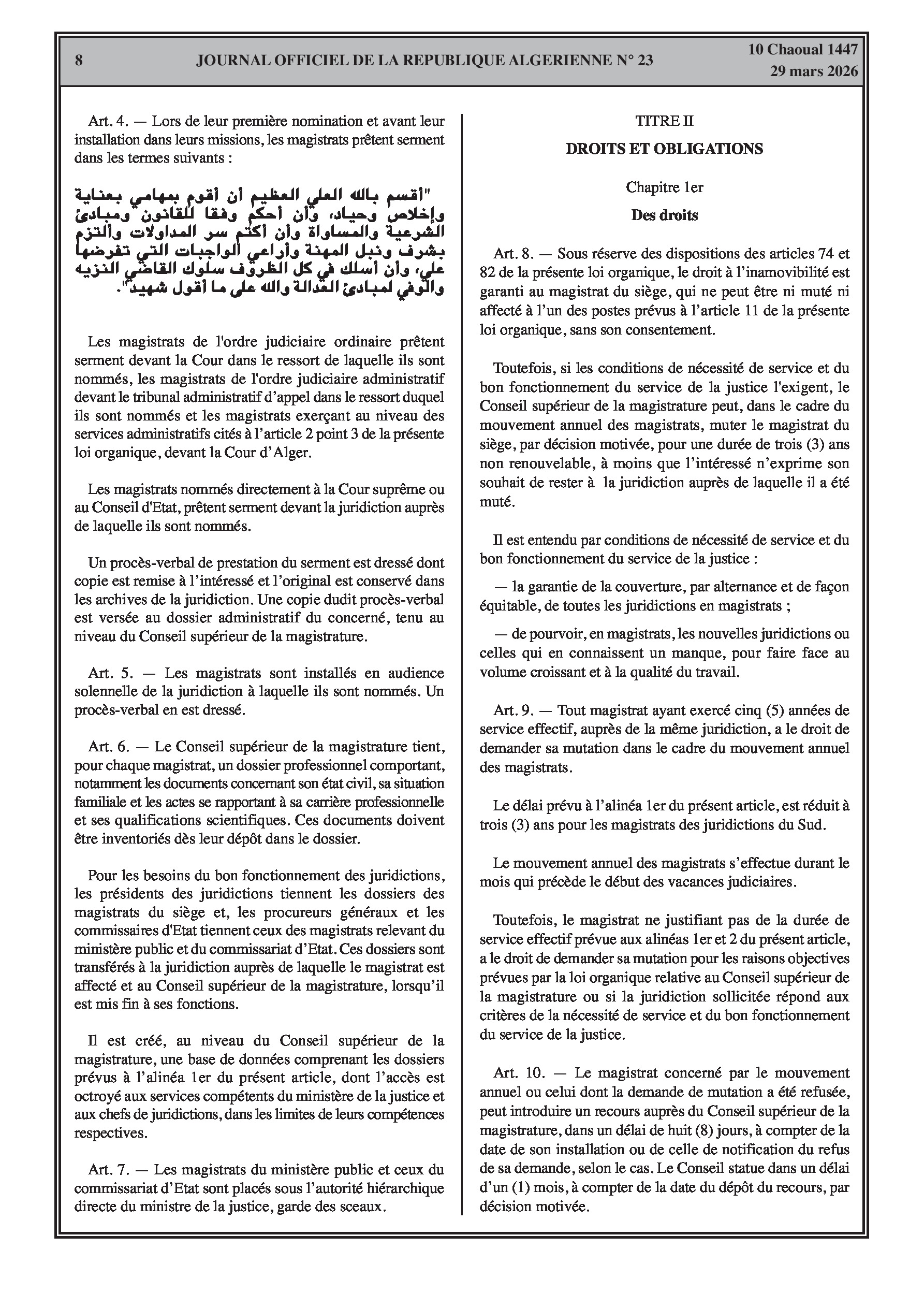 • Définition des droits, obligations et parcours de carrière des magistrats. • Inamovibilité garantie pour les magistrats du siège. • Réglementation stricte des mutations, promotions et de la discipline. • Obligation de déclaration de patrimoine pour les magistrats.