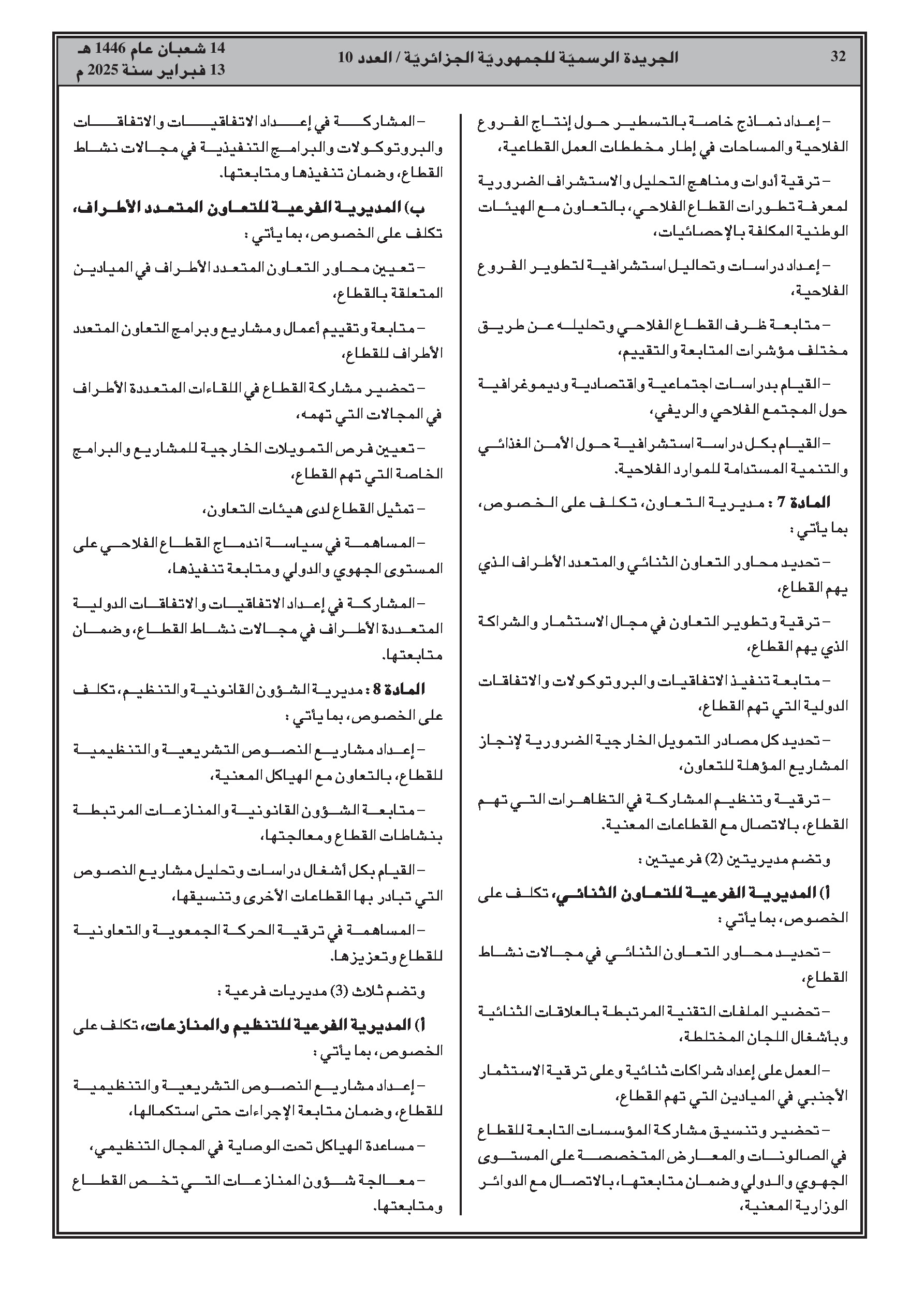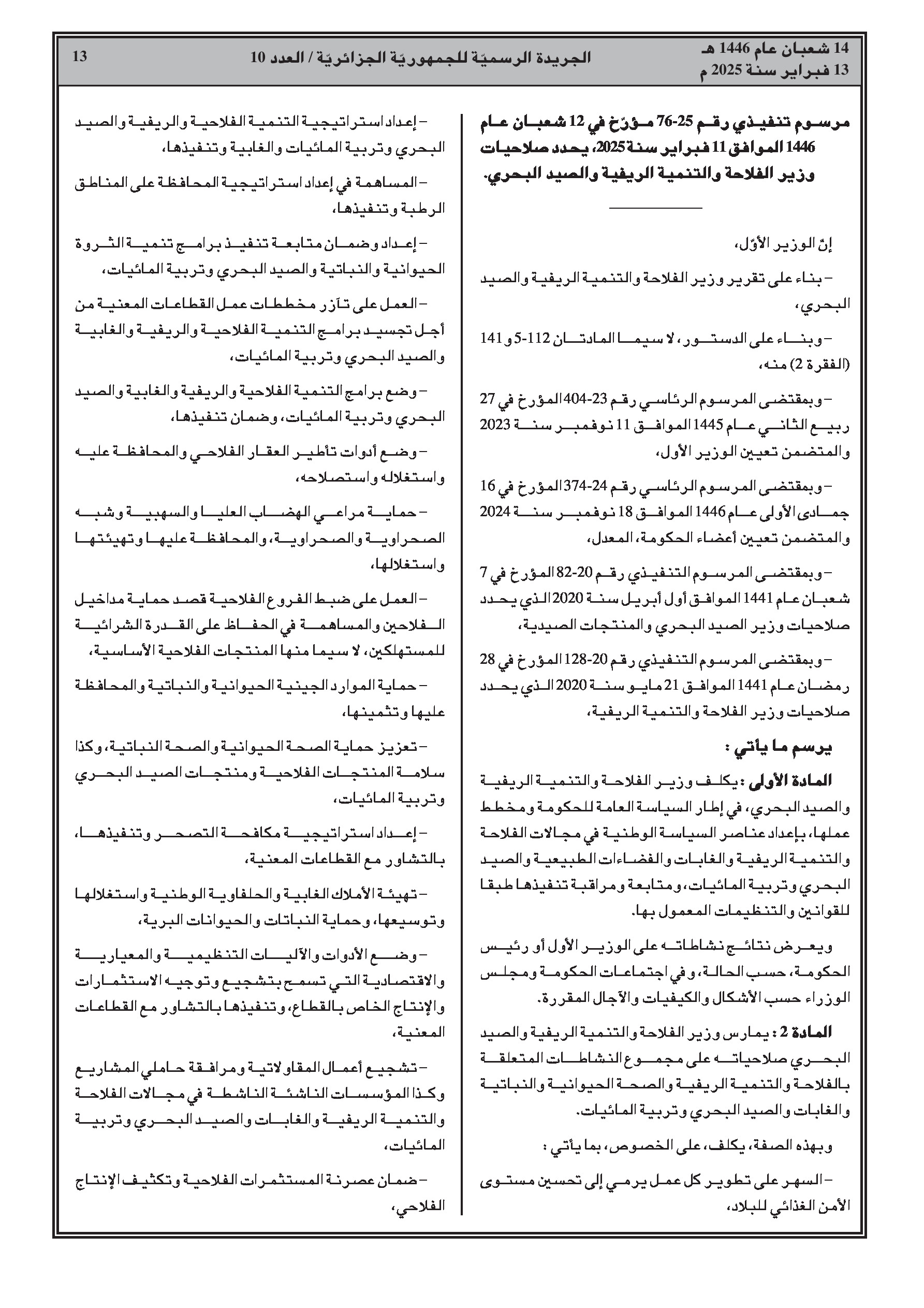 المرسوم التنفيذي رقم 25-76 يحدد صلاحيات وزير الفلاحة والتنمية الريفية والصيد البحري، وتشمل الفلاحة، التنمية الريفية، الغابات، الصيد البحري، وتربية المائيات.