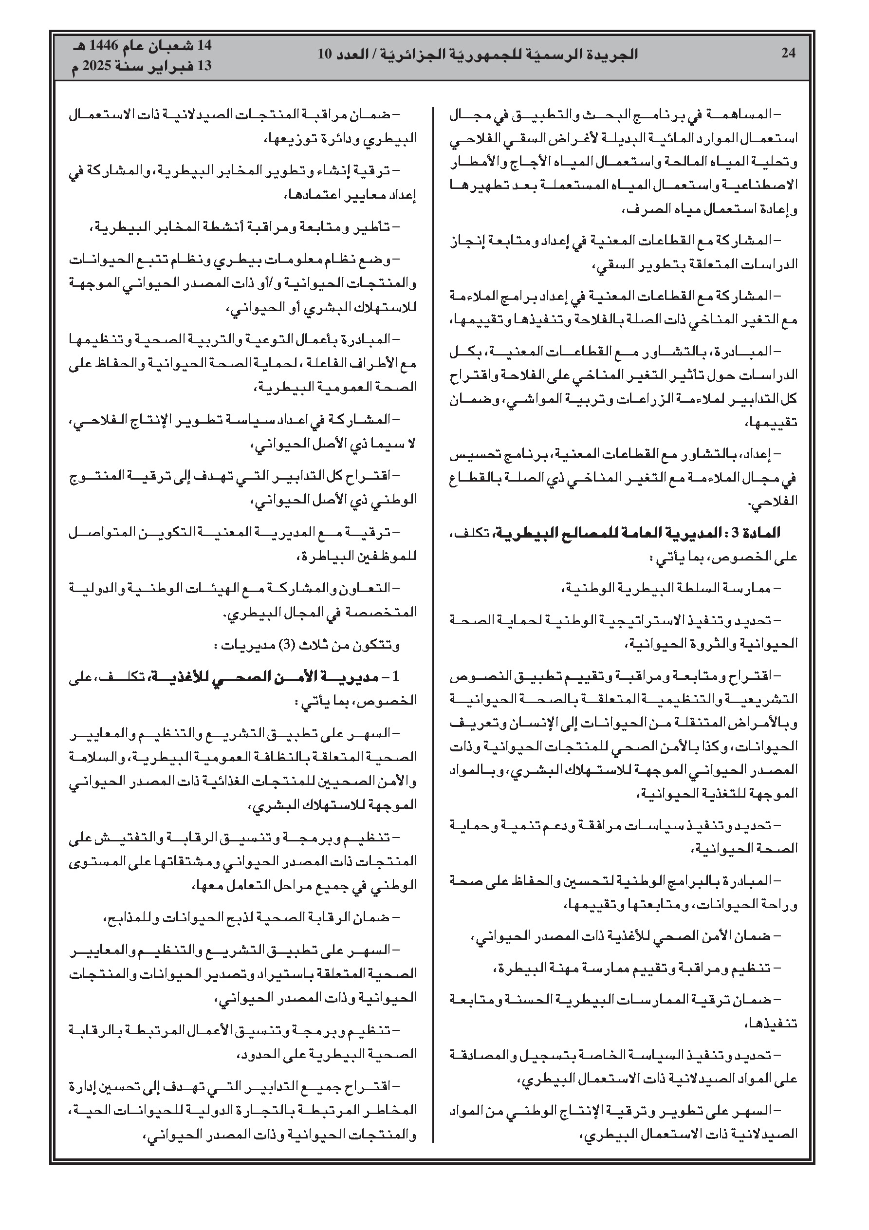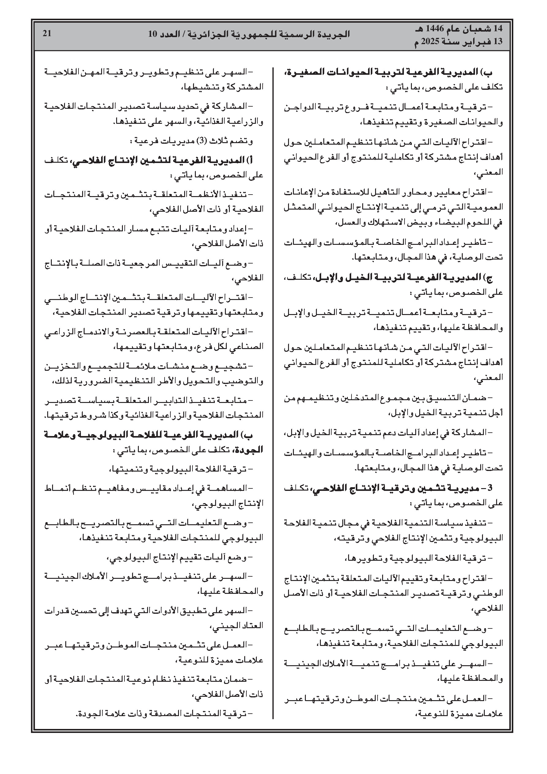 يفصل مسؤوليات الوزير في السياسة الوطنية في مجالات الفلاحة، التنمية الريفية، الغابات، الصيد البحري، وتربية المائيات، بما في ذلك الأمن الغذائي، إدارة الموارد، وتنمية القطاع. يلغي المرسومين 20-82 (الصيد البحري) و 20-128 (الفلاحة).