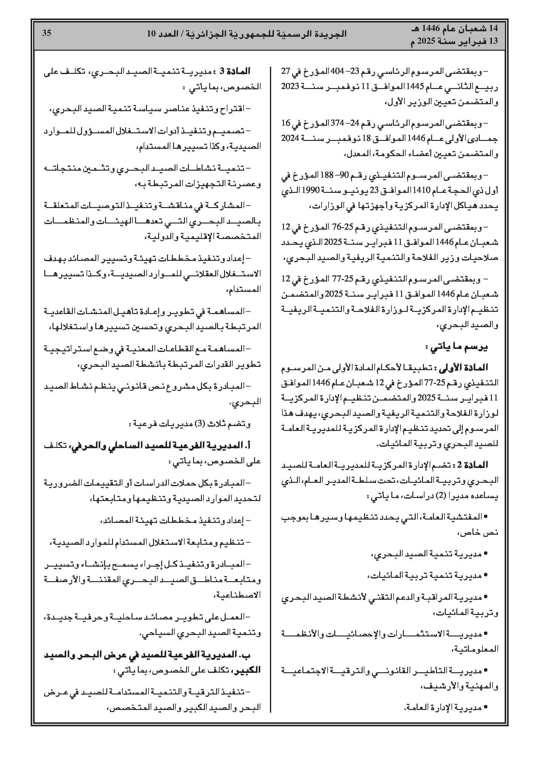المرسوم التنفيذي رقم 25-78 يحدد تنظيم الإدارة المركزية للمديرية العامة للصيد البحري وتربية المائيات.