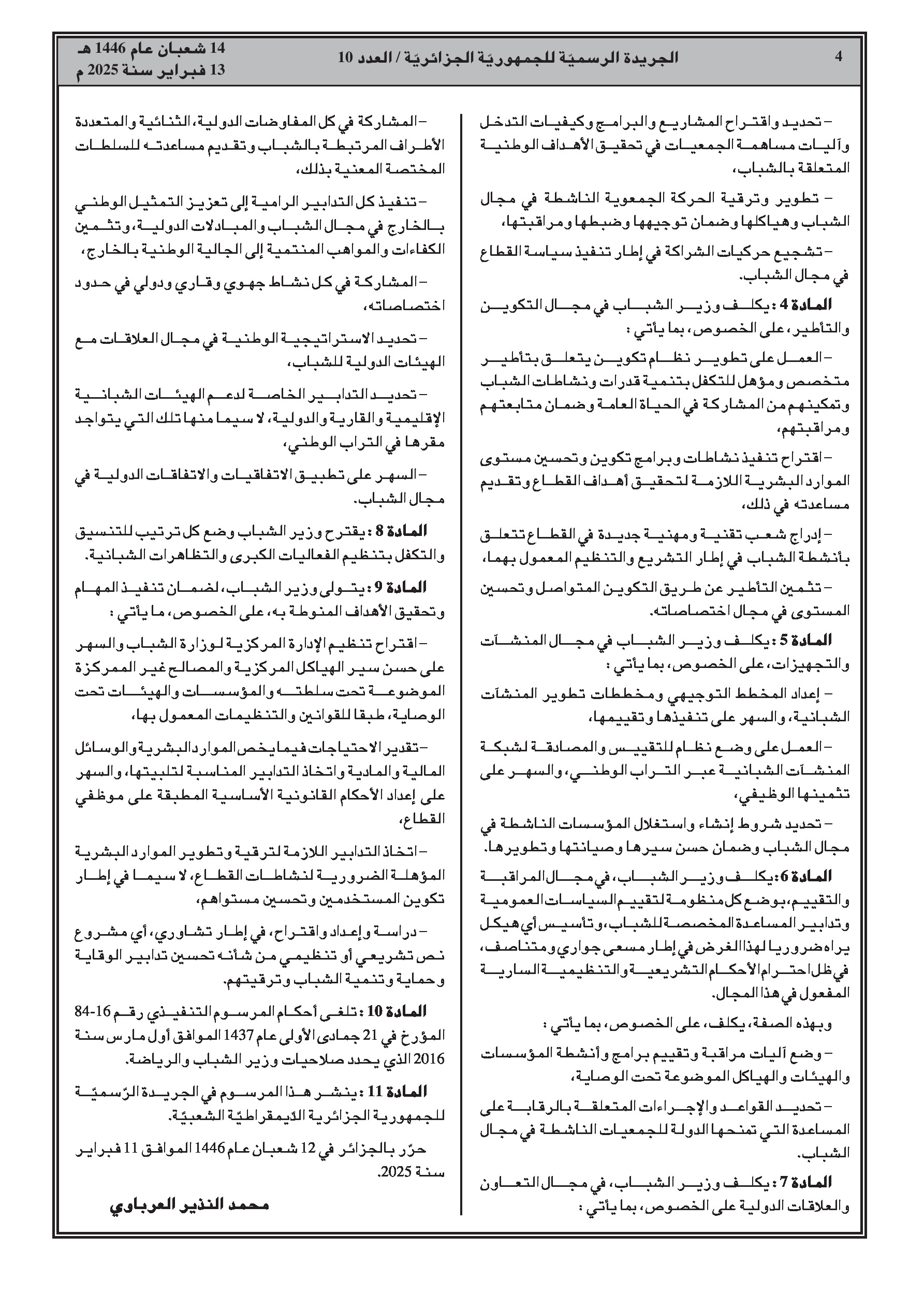 المرسوم التنفيذي رقم 25-74 يحدد صلاحيات ومسؤوليات وزير الشباب، مع التركيز على تمكين الشباب وتنمية الأنشطة.
