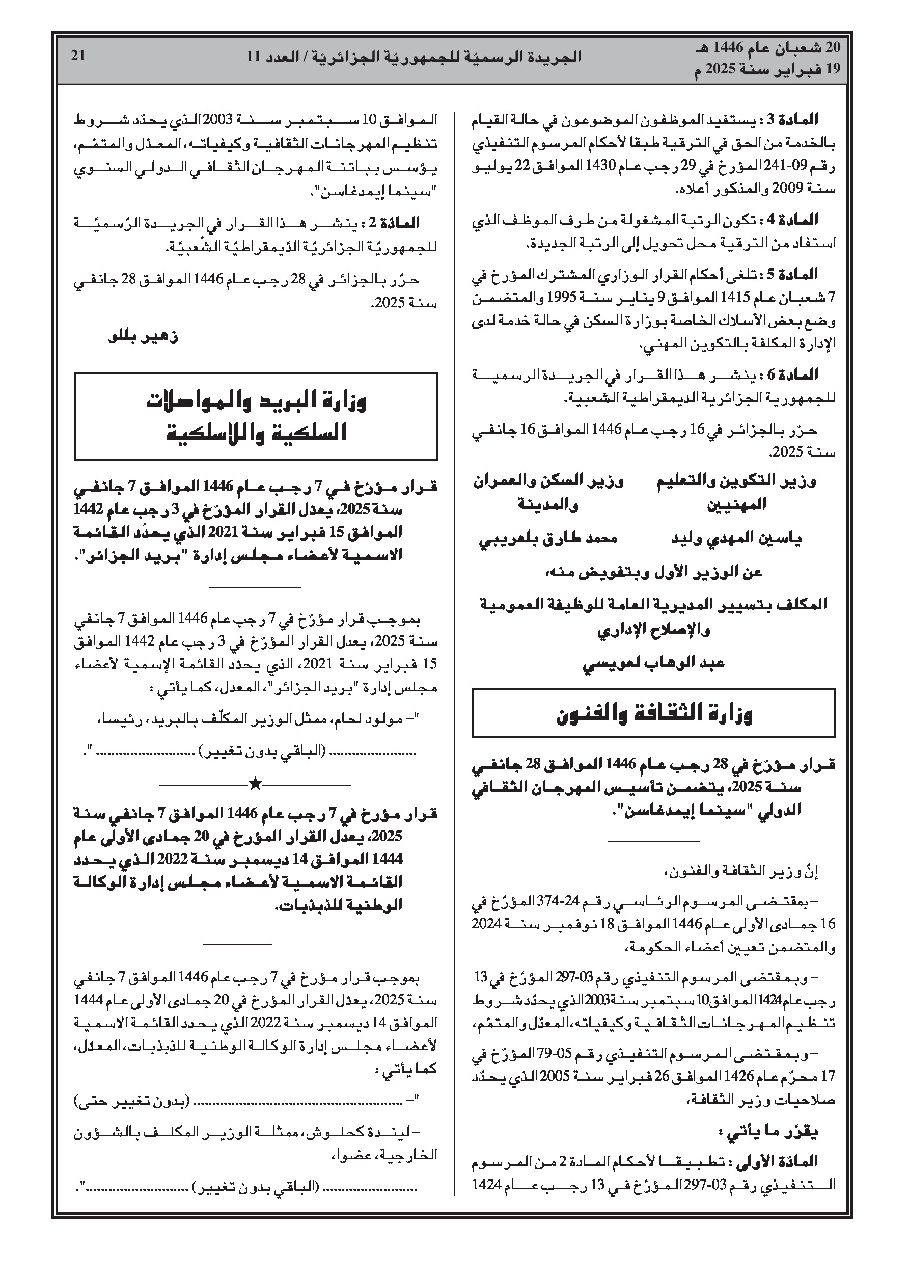 - قرار يعدل قائمة أعضاء مجلس إدارة «بريد الجزائر». - قرار يعدل قائمة أعضاء مجلس إدارة الوكالة الوطنية للذبذبات. - قرار يعدل قائمة أعضاء مجلس إدارة الوكالة الوطنية لترقية وتطوير الحظائر التكنولوجية.