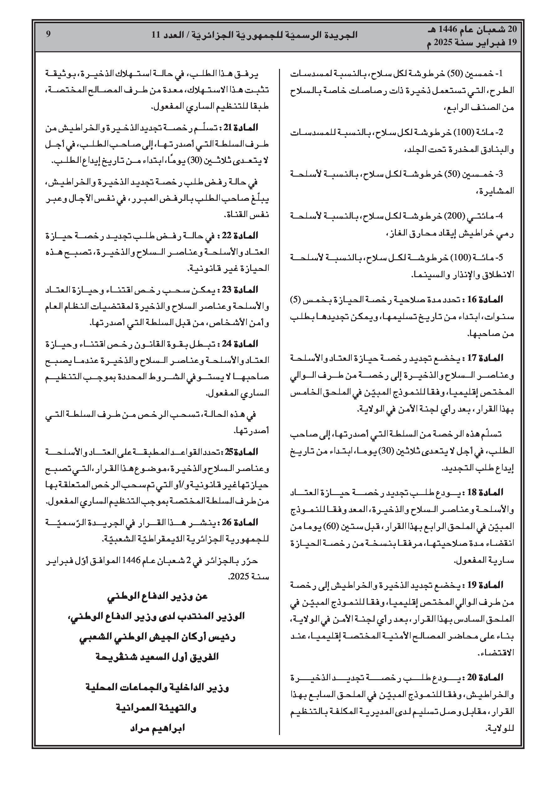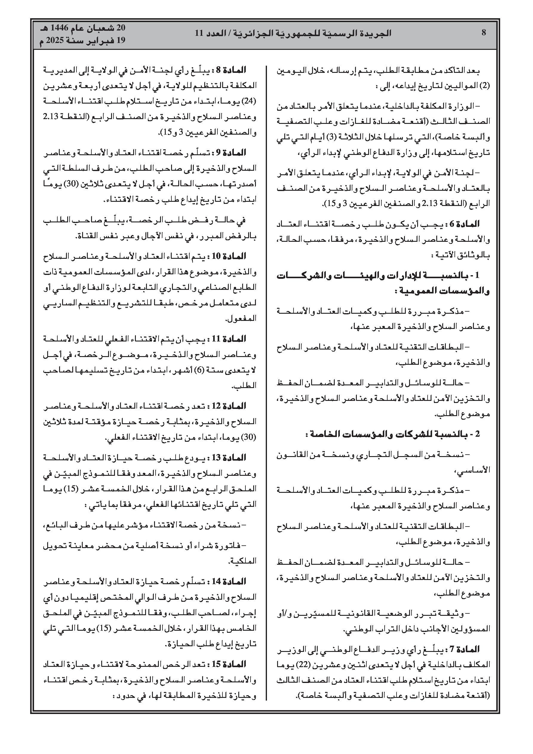 - قرار وزاري مشترك يحدد شروط حيازة وحمل بعض العتاد والأسلحة وعناصر الأسلحة والذخائر من الصنفين 3 و4.