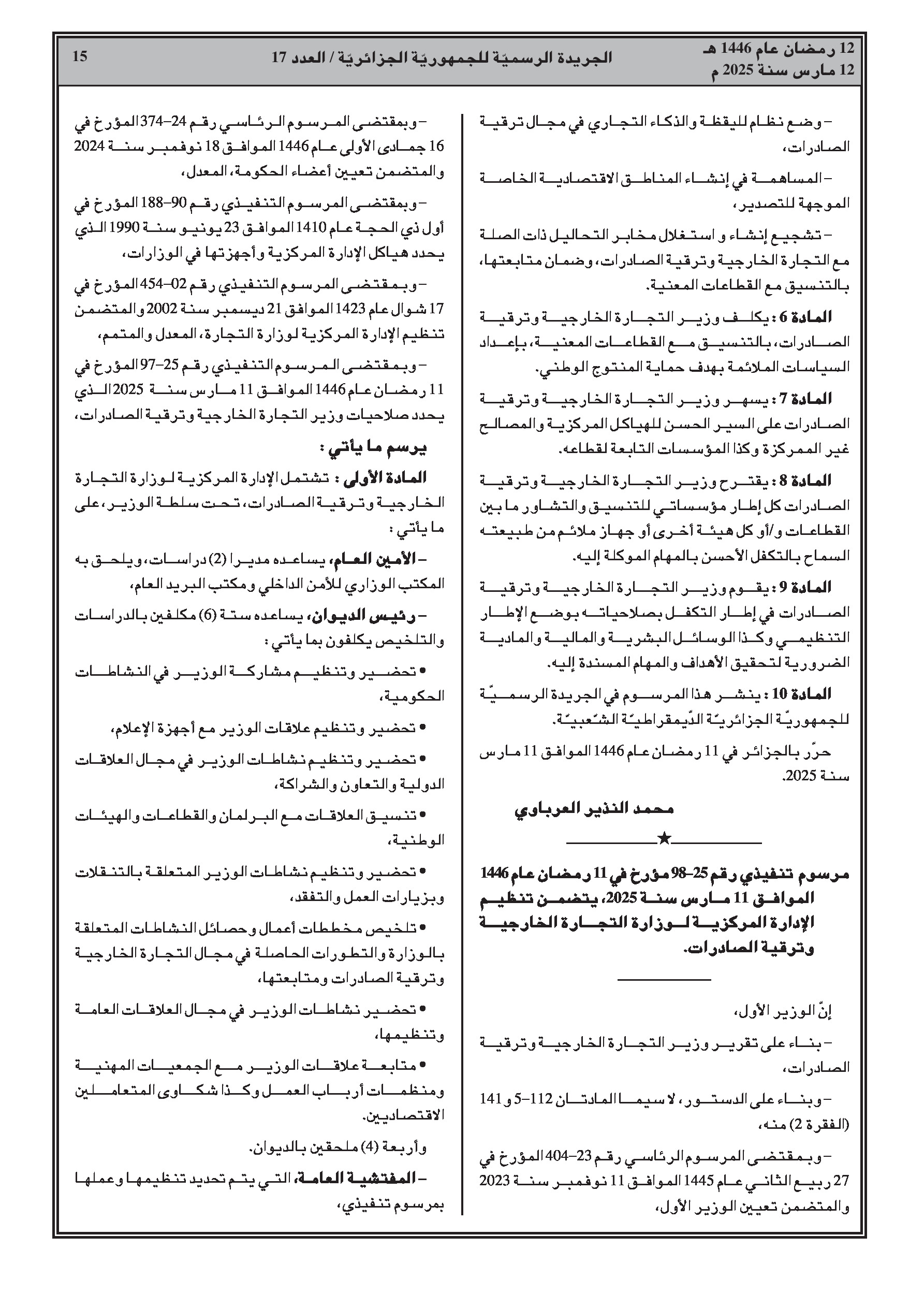 مرسوم تنفيذي رقم 25-97 يحدد صلاحيات وزير التجارة الخارجية وترقية الصادرات، المتعلقة بالسياسة الوطنية للتجارة الخارجية، الاتفاقيات الدولية، دعم المصدرين، وحماية المنتوج الوطني.