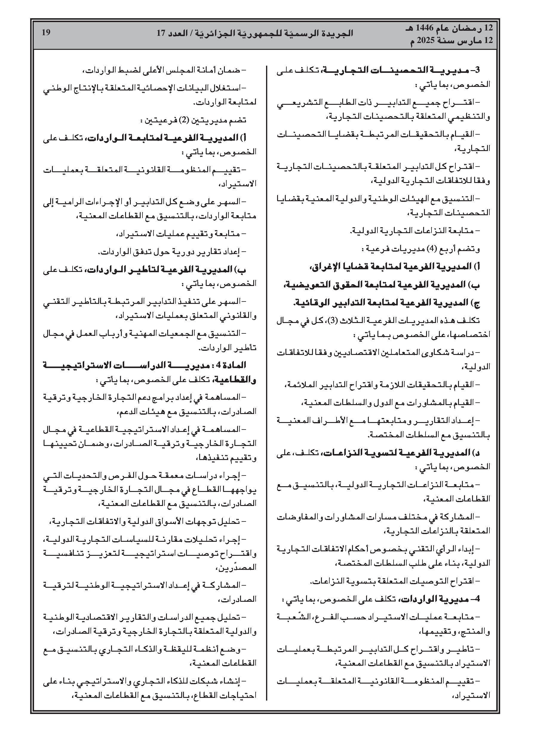 تحديد صلاحيات وزير التجارة الخارجية وترقية الصادرات وهيكلة إدارته المركزية لتعزيز التجارة الخارجية ودعم الصادرات الوطنية.