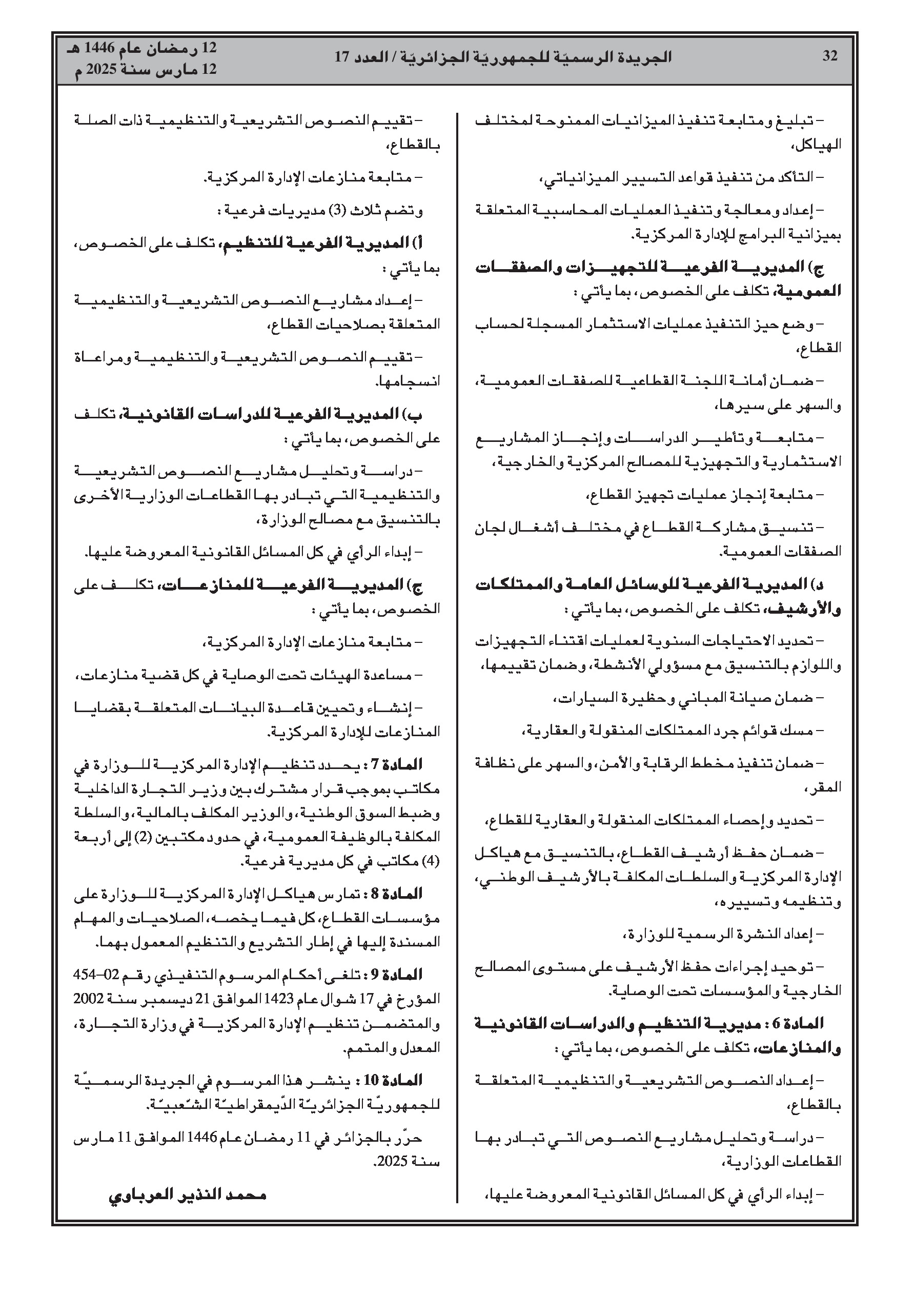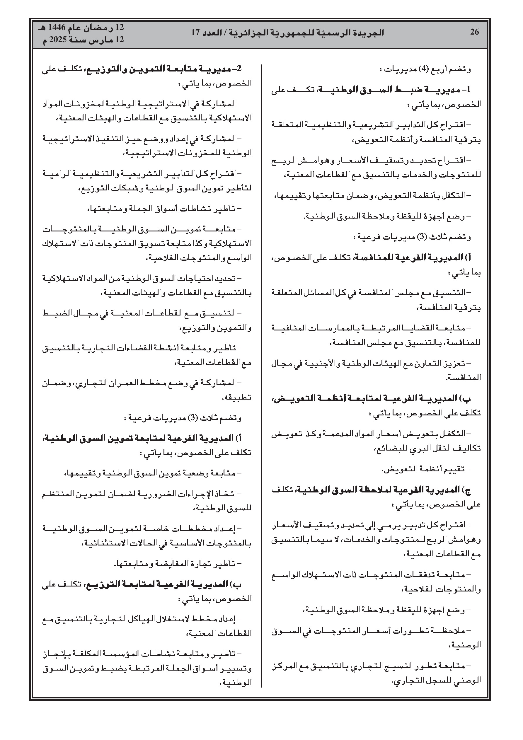 مرسوم تنفيذي رقم 25-100 يحدد تنظيم الإدارة المركزية لوزارة التجارة الداخلية وتنظيم السوق الوطنية، وتضم الأمانة العامة، ديوان الوزير، المفتشية العامة، ومديريتين عامتين (مديرية عامة لضبط وتنظيم السوق الوطنية؛ مديرية عامة للمراقبة الاقتصادية وقمع الغش) و3 مديريات أخرى.
