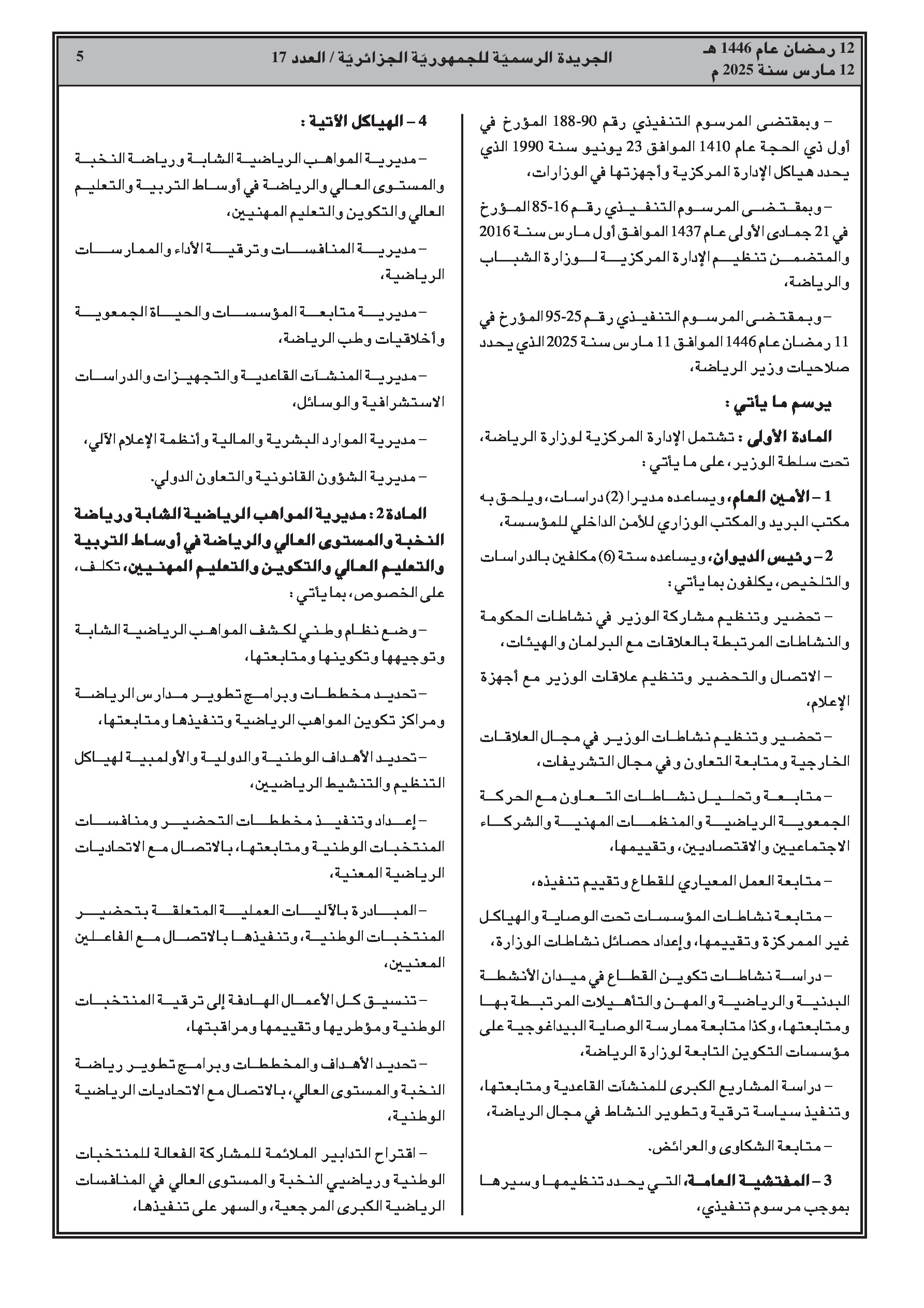 مرسوم تنفيذي رقم 25-96 يحدد تنظيم الإدارة المركزية لوزارة الرياضة، وتضم الأمانة العامة، ديوان الوزير، المفتشية العامة، و6 مديريات مركزية: مديرية المواهب الرياضية الشابة ورياضة النخبة والمستوى العالي والرياضة في أوساط التربية والتكوين؛ مديرية المنافسات وترقية الأداء والممارسات الرياضية؛ مديرية متابعة المؤسسات والحياة الجمعوية والأخلاقيات وطب الرياضة؛ مديرية الهياكل القاعدية والتجهيزات والدراسات الاستشرافية والوسائل؛ مديرية الموارد البشرية والمالية وأنظمة الإعلام؛ مديرية الشؤون القانونية والتعاون الدولي.