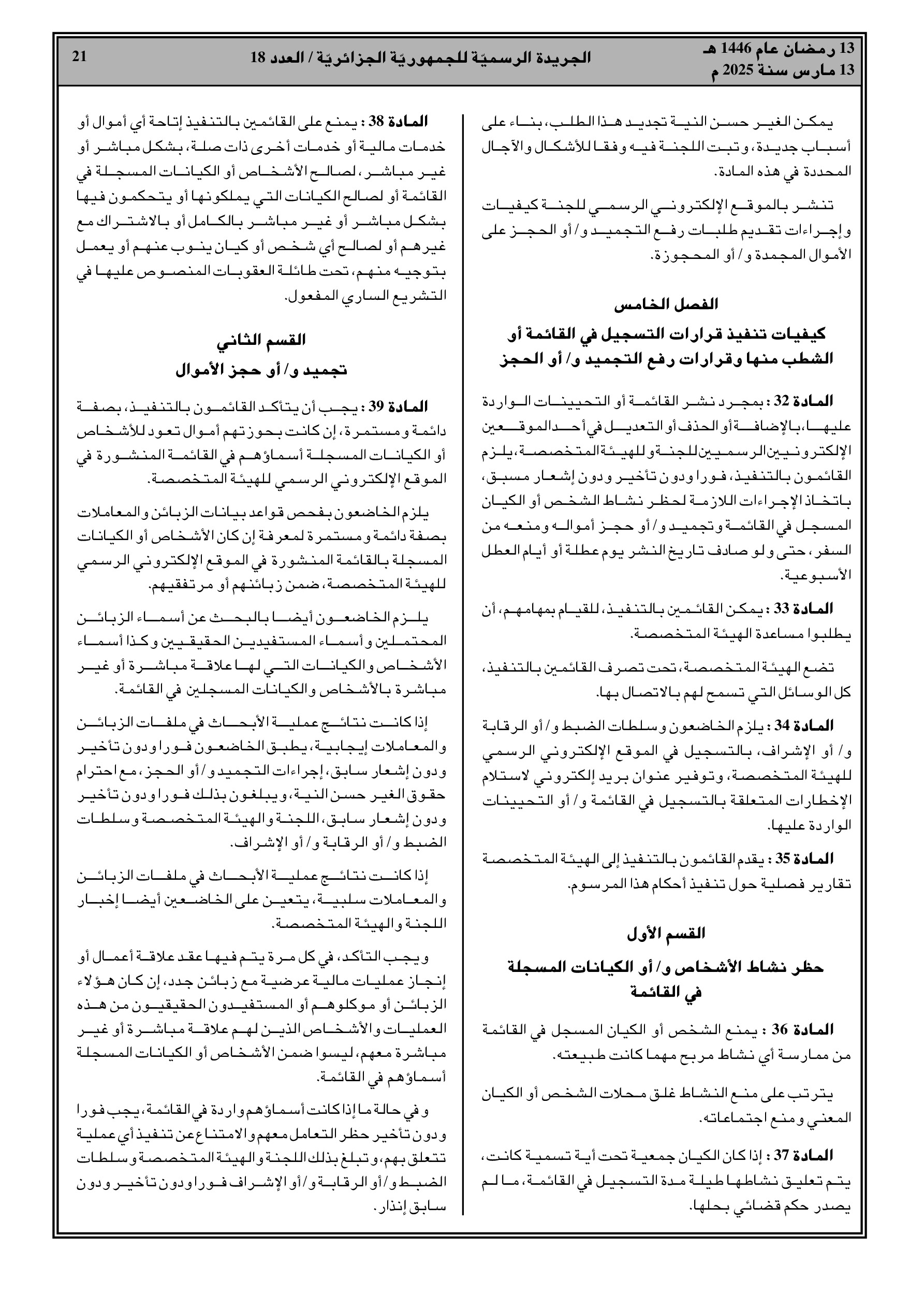 يحدد هذا المرسوم كيفيات تجميد و/أو حجز الأموال تطبيقًا لقرارات مجلس الأمن الأممي ذات الصلة بمكافحة تمويل الإرهاب وتمويل انتشار أسلحة الدمار الشامل.