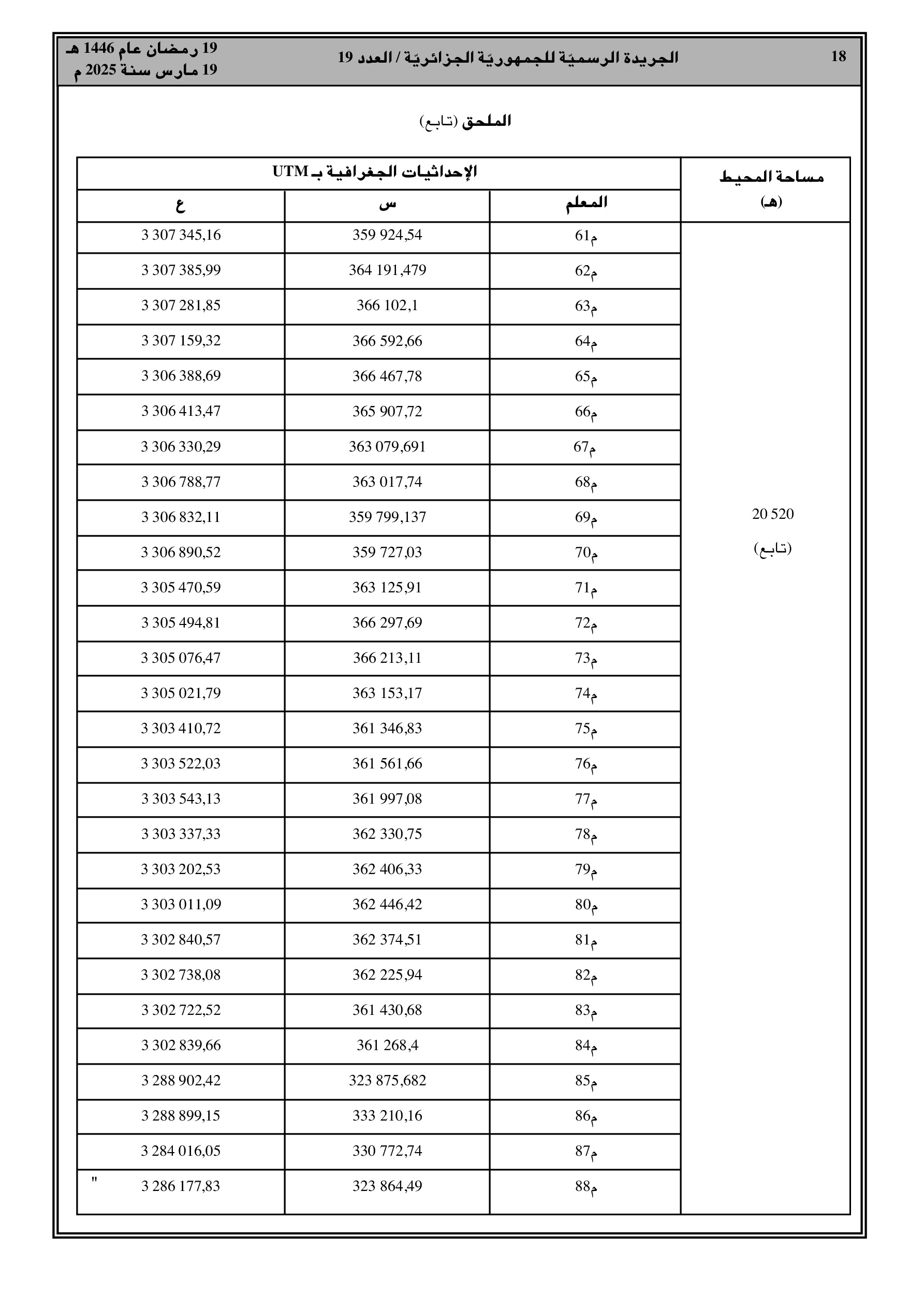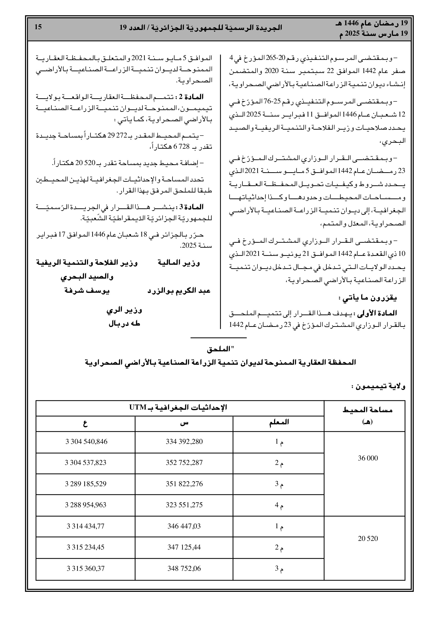 يكمل هذا القرار الوزاري المشترك (المالية، الفلاحة، الري) الملحق الخاص بالقرار الوزاري المشترك المؤرخ في 5 ماي 2021. يضيف مساحة 6728 هكتارًا إلى محيط 29272 هكتارًا، ومحيطًا جديدًا بمساحة 20520 هكتارًا بولاية تيميمون، لفائدة ديوان تنمية الفلاحة الصناعية بالأراضي الصحراوية. يتضمن القرار الإحداثيات الجغرافية لهذه المساحات.