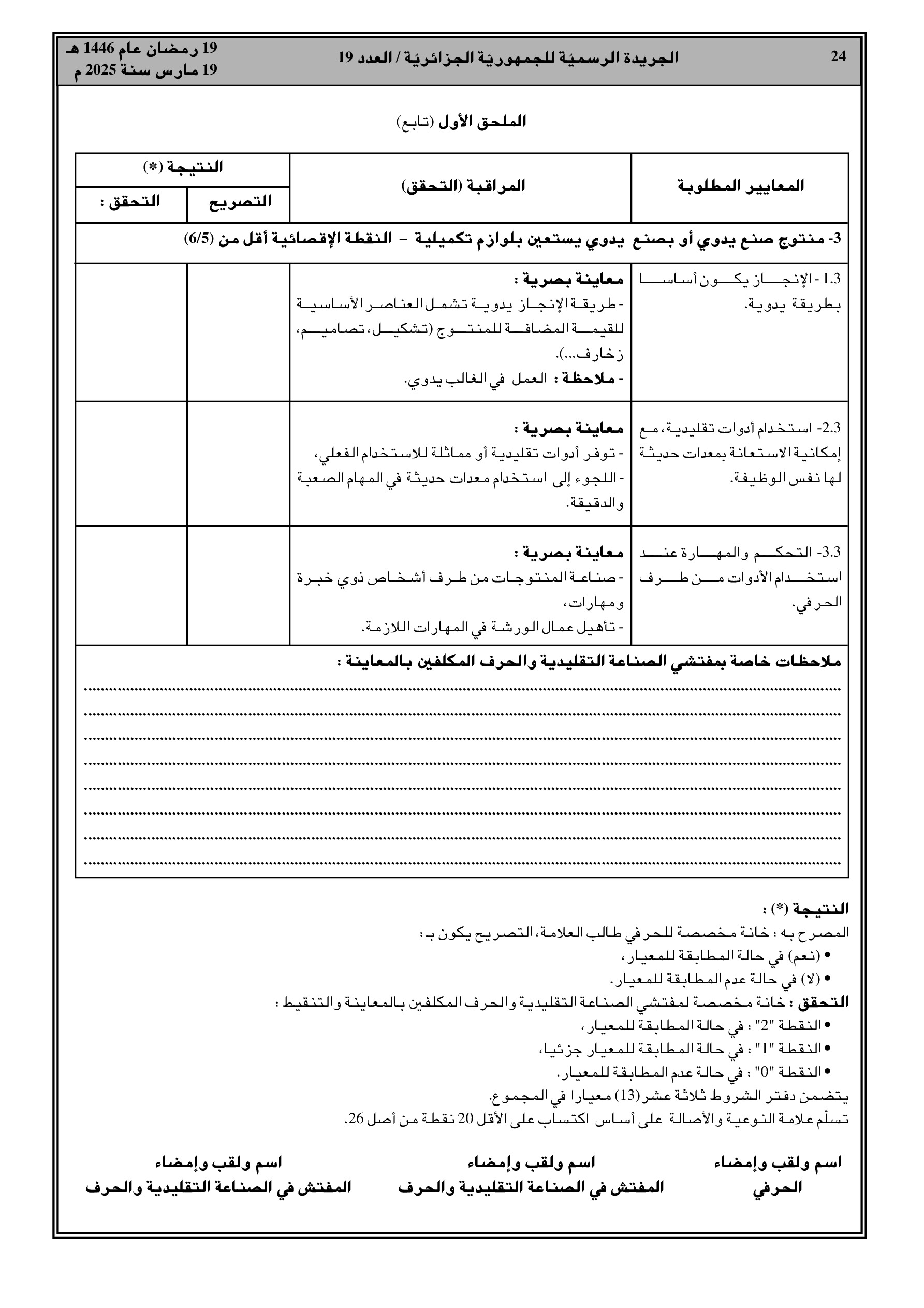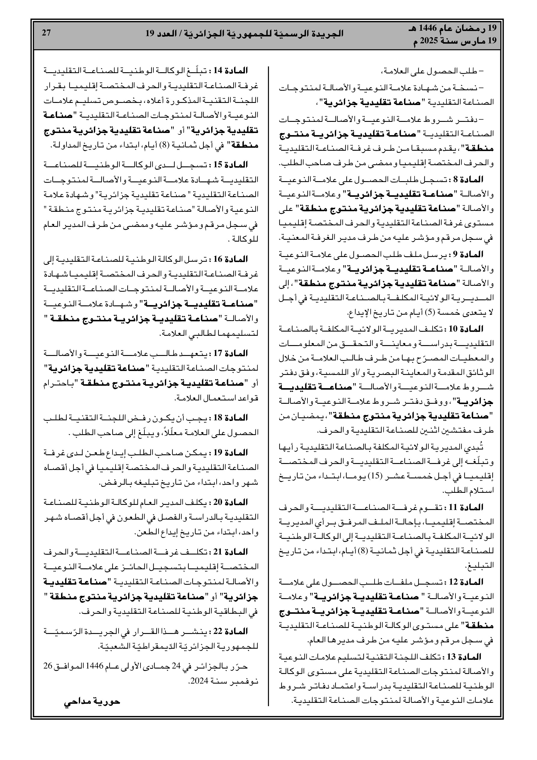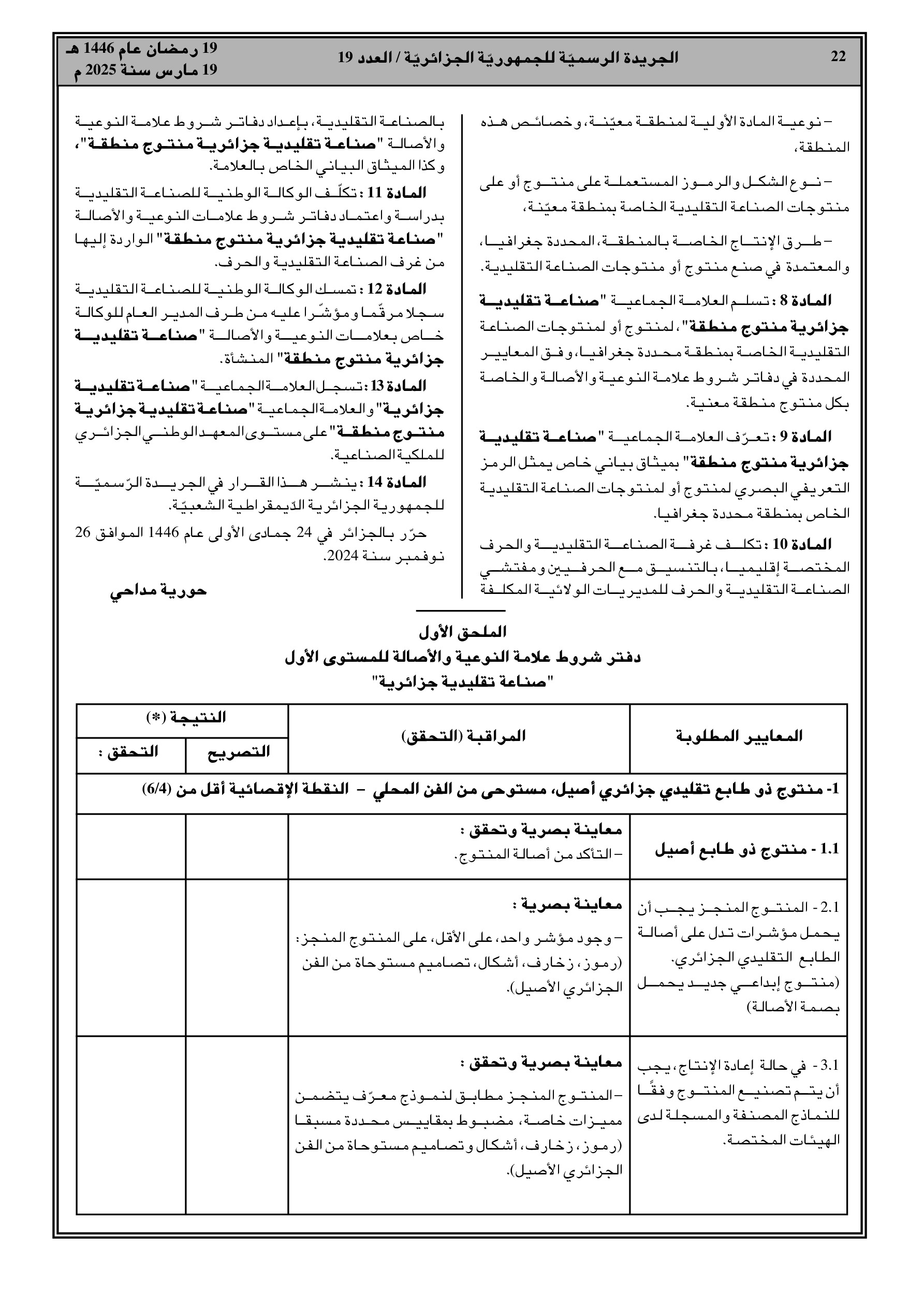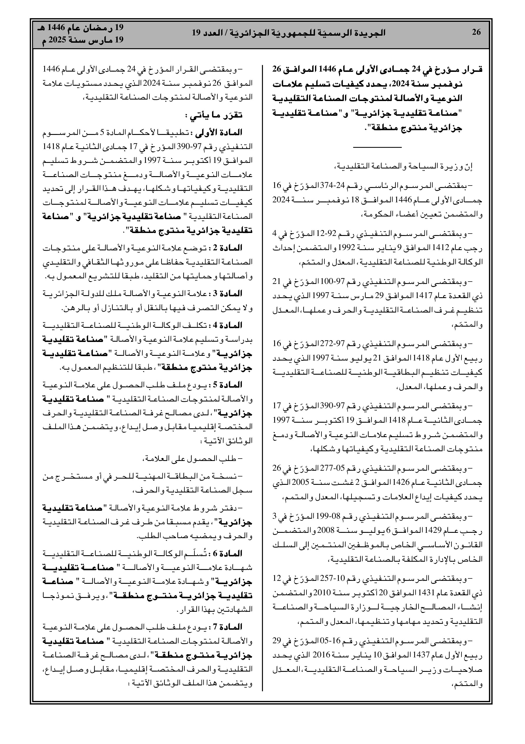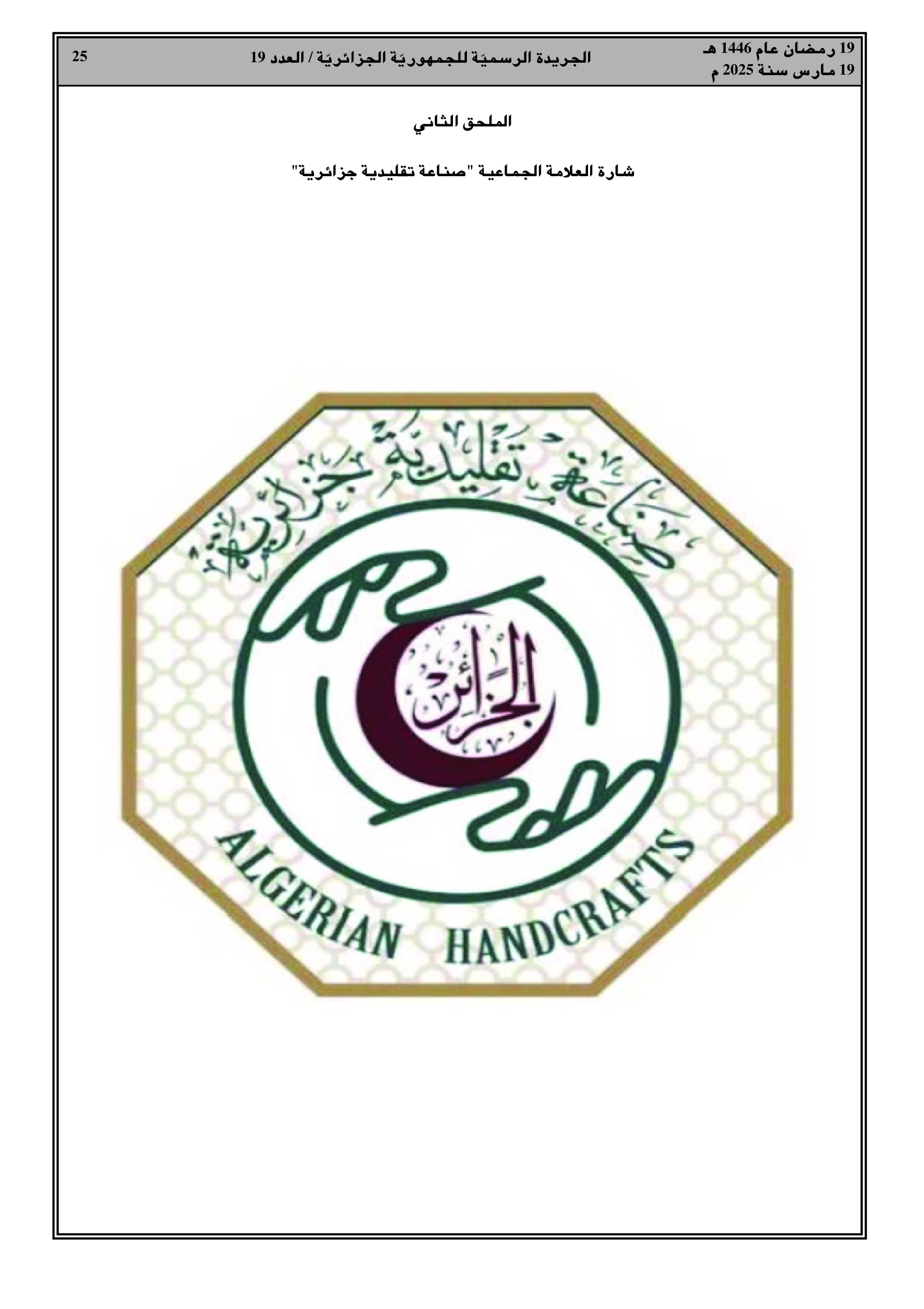 قرار يحدد كيفيات وإجراءات منح علامتي الجودة والأصالة "صناعة تقليدية جزائرية" و"صناعة تقليدية جزائرية منتوج منطقة".