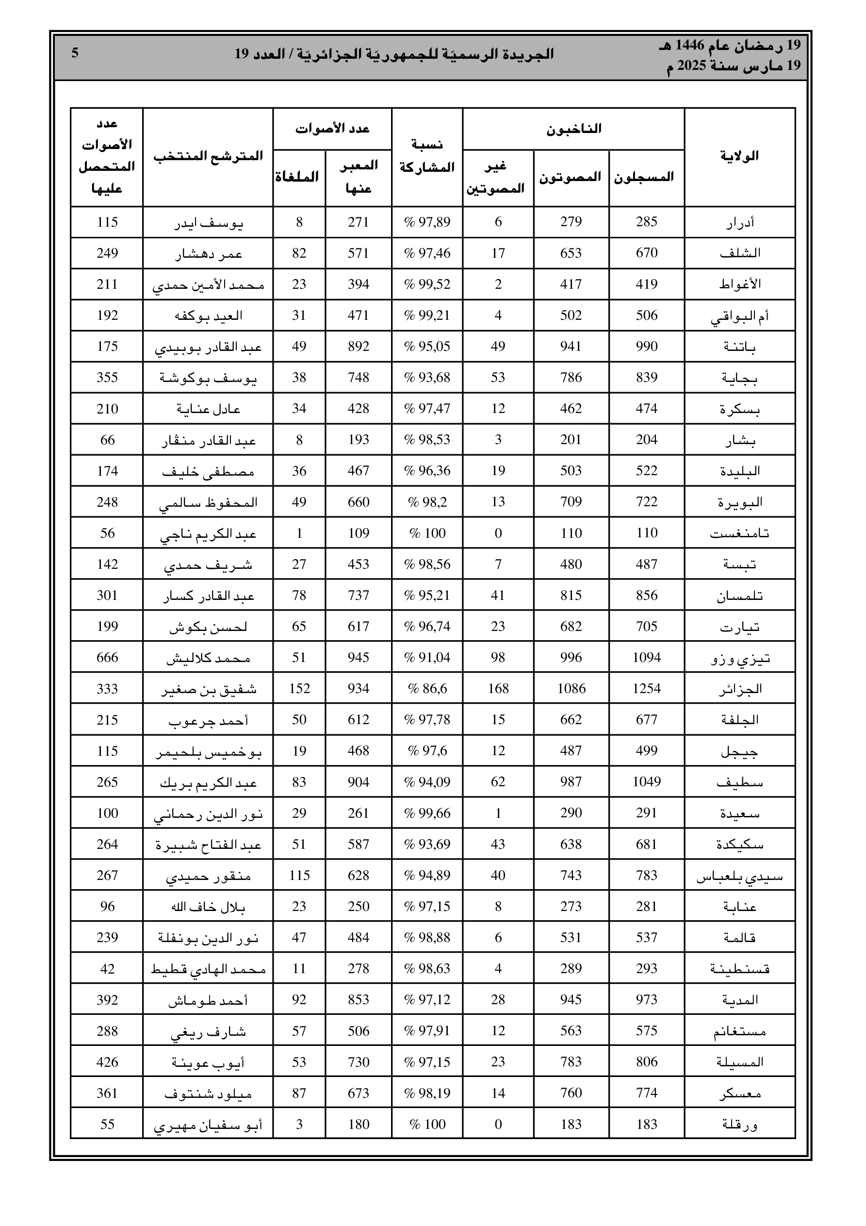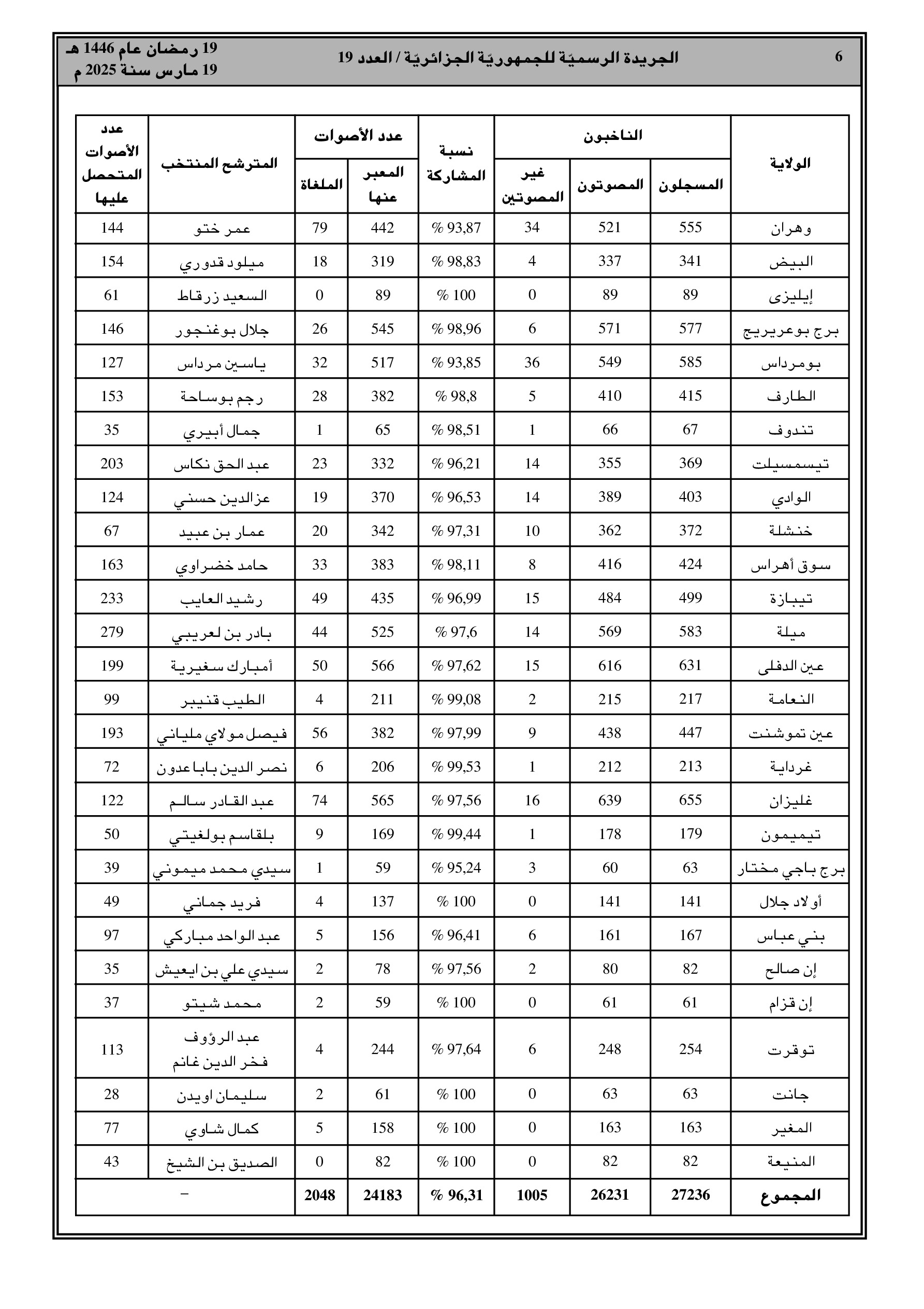 يتضمن الإعلان النتائج الإجمالية للانتخابات: عدد الولايات (58)، عدد المترشحين (426)، عدد الناخبين المسجلين (27236)، عدد المصوتين (26231)، نسبة المشاركة (96.31%)، الأصوات المعبر عنها (24183)، والأوراق الملغاة (2048). كما يتضمن النتائج المفصلة حسب الولايات وقائمة بأسماء الفائزين وانتماءاتهم السياسية.