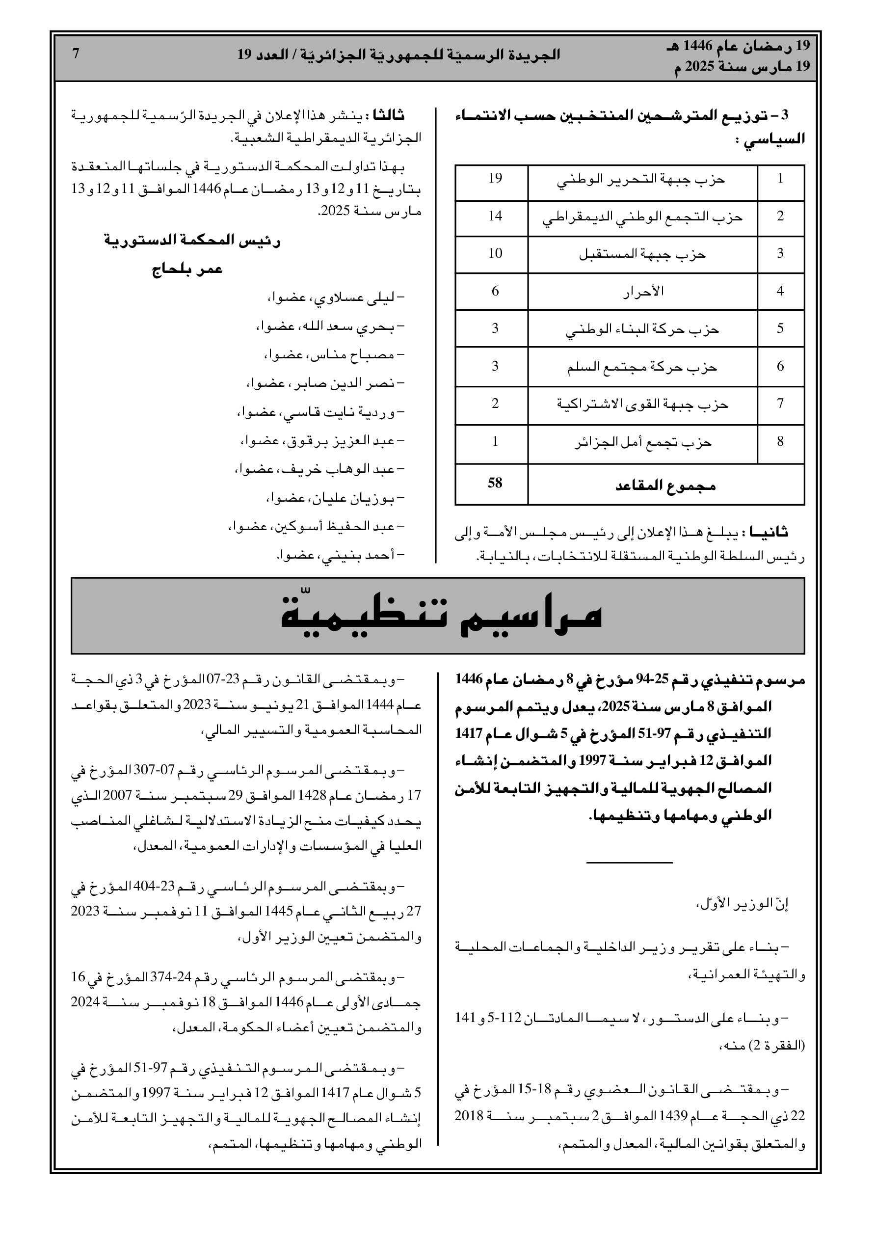 إعلان النتائج النهائية لانتخابات تجديد نصف أعضاء مجلس الأمة التي جرت في 9 مارس 2025.