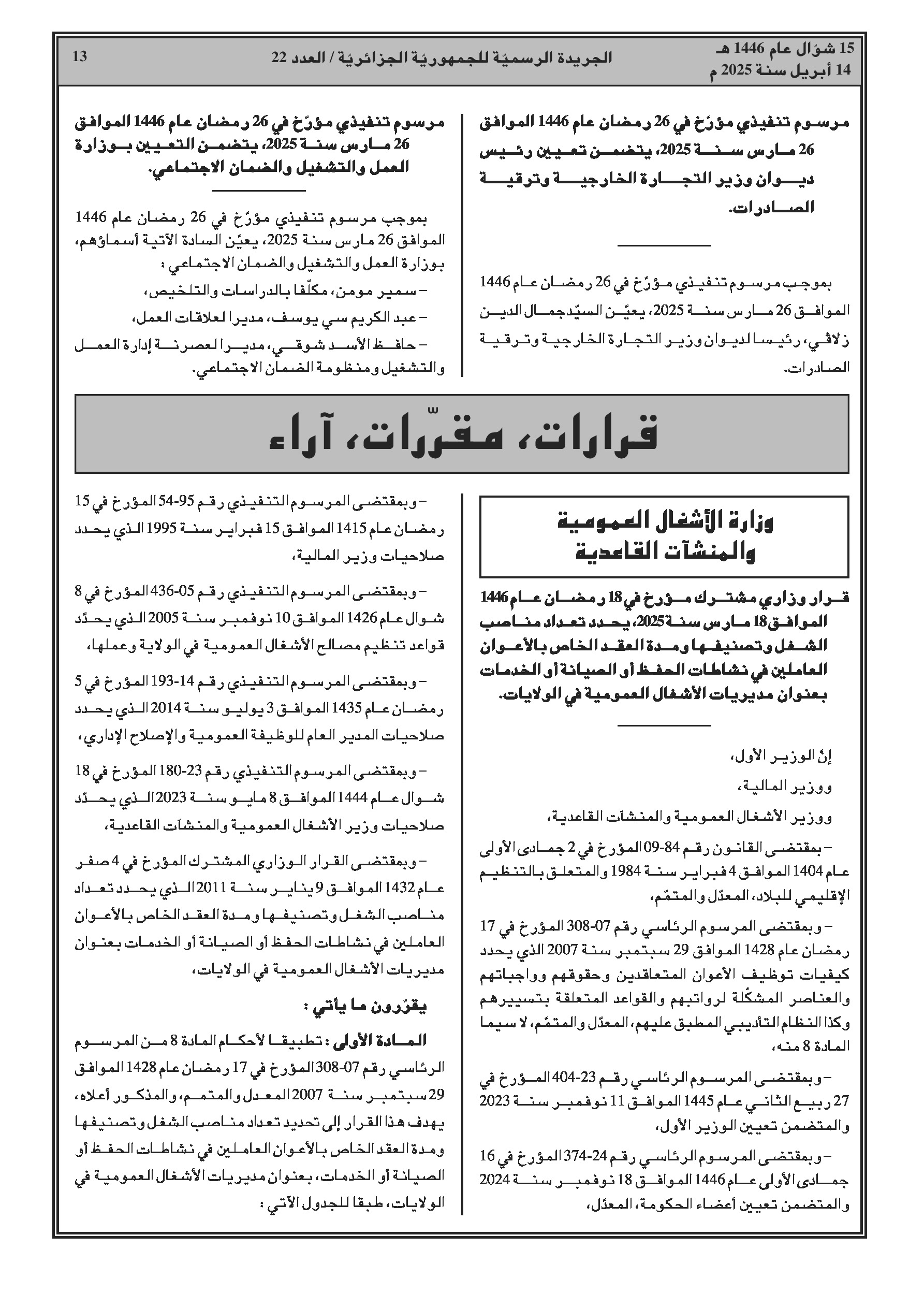 يحدد هذا القرار الوزاري المشترك المؤرخ في 18 مارس 2025، تعدادات الموظفين حسب المنصب، تصنيفهم، ومدة عقود الأعوان الذين يمارسون أنشطة الصيانة، الحفظ أو الخدمة على مستوى مديريات الأشغال العمومية للولايات. يتضمن القرار جداول مفصلة لتوزيع هذه التعدادات حسب طبيعة عقد العمل والفئات والرتب الموافقة لكل منصب.