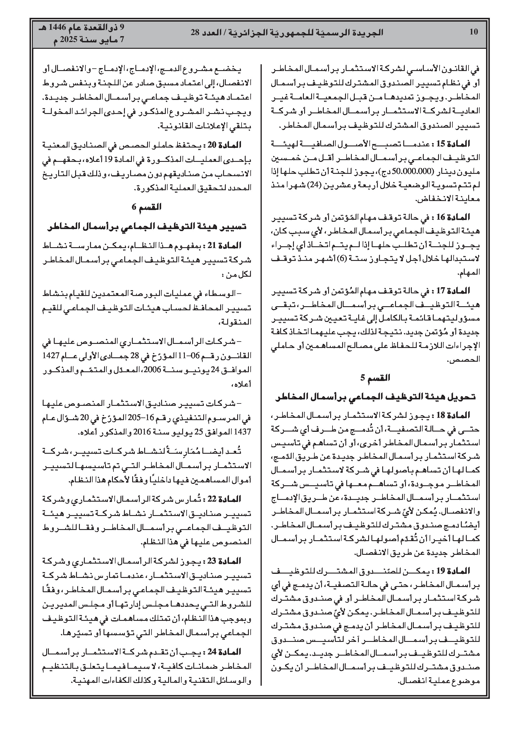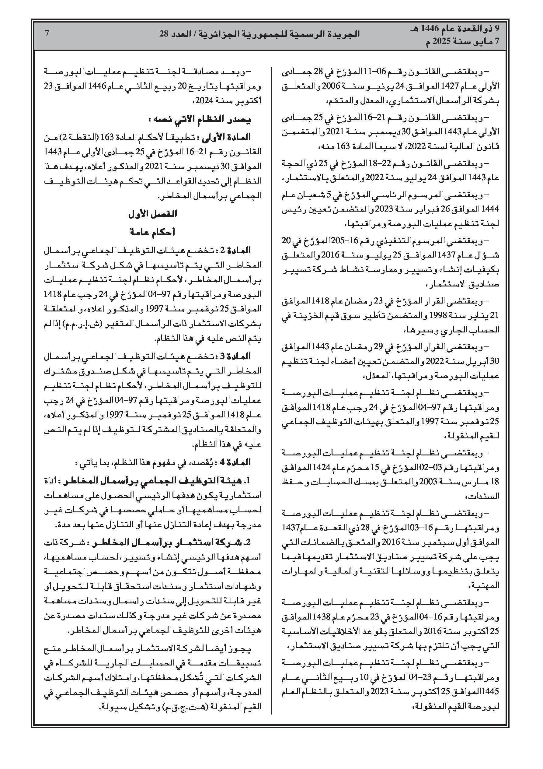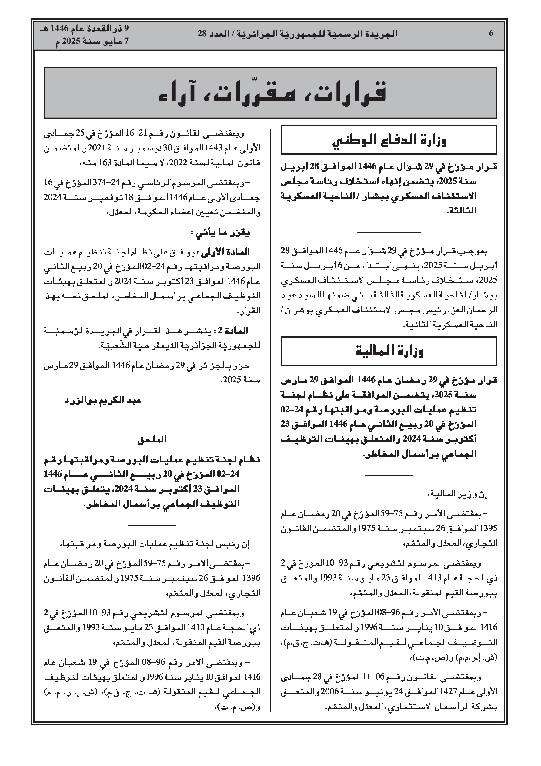 قرار وزاري يصادق على نظام لجنة تنظيم عمليات البورصة ومراقبتها رقم 24-02 المتعلق بهيئات التوظيف الجماعي في رأس المال الاستثماري، محدداً قواعد إنشائها وتشغيلها.