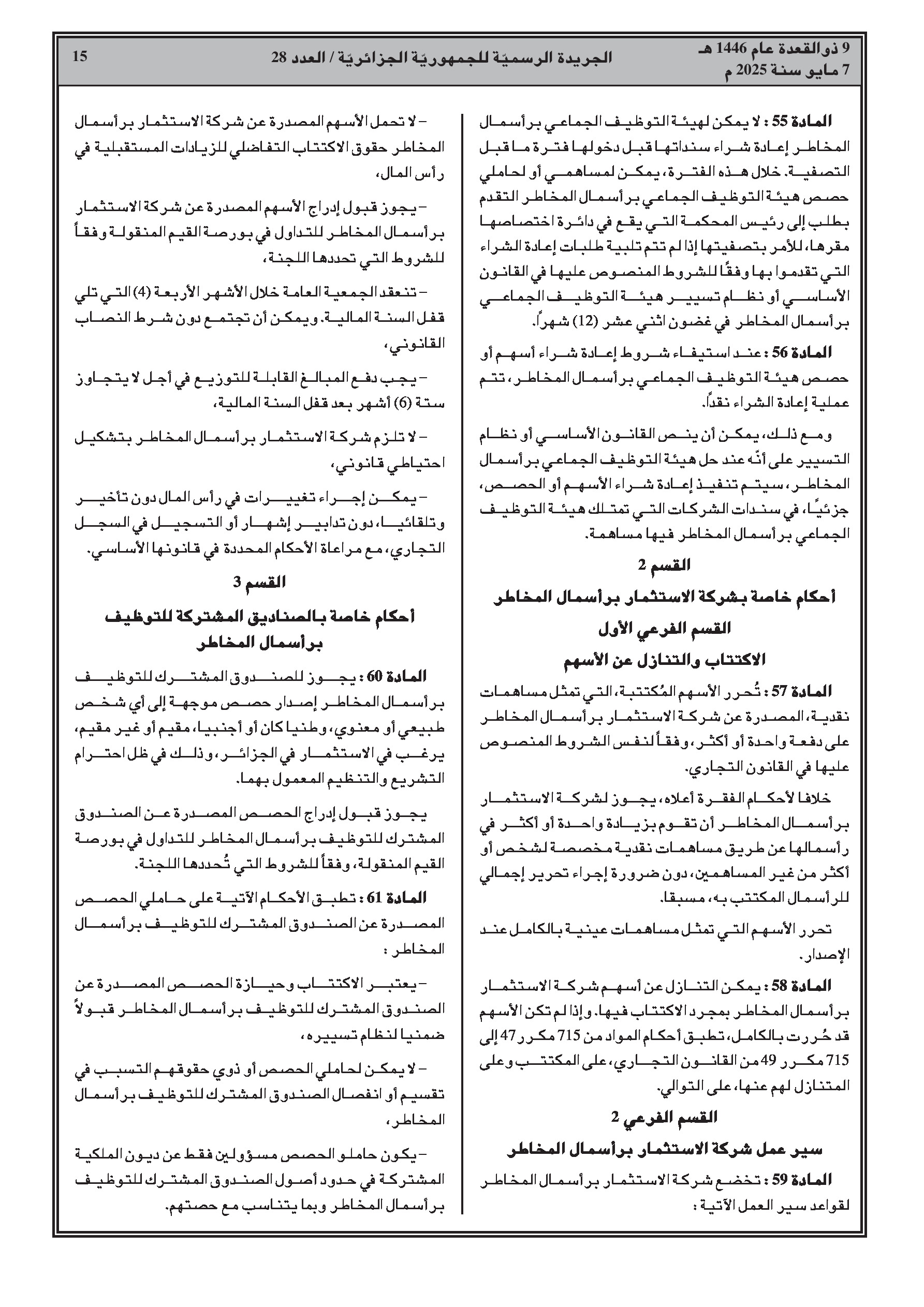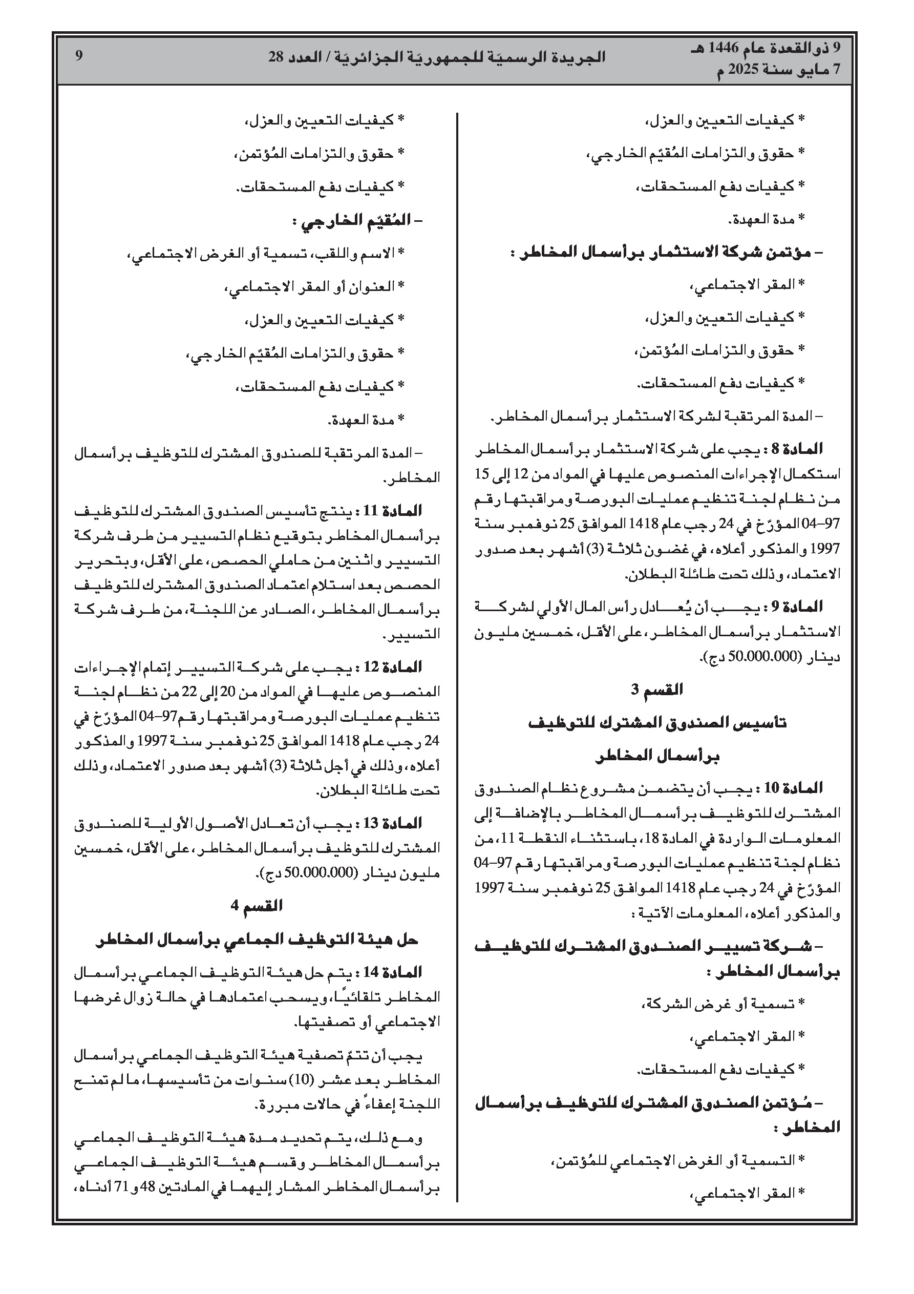 - الحد الأدنى لرأس مال SICAR وصافي أصول FCPR هو 50 مليون دينار جزائري.