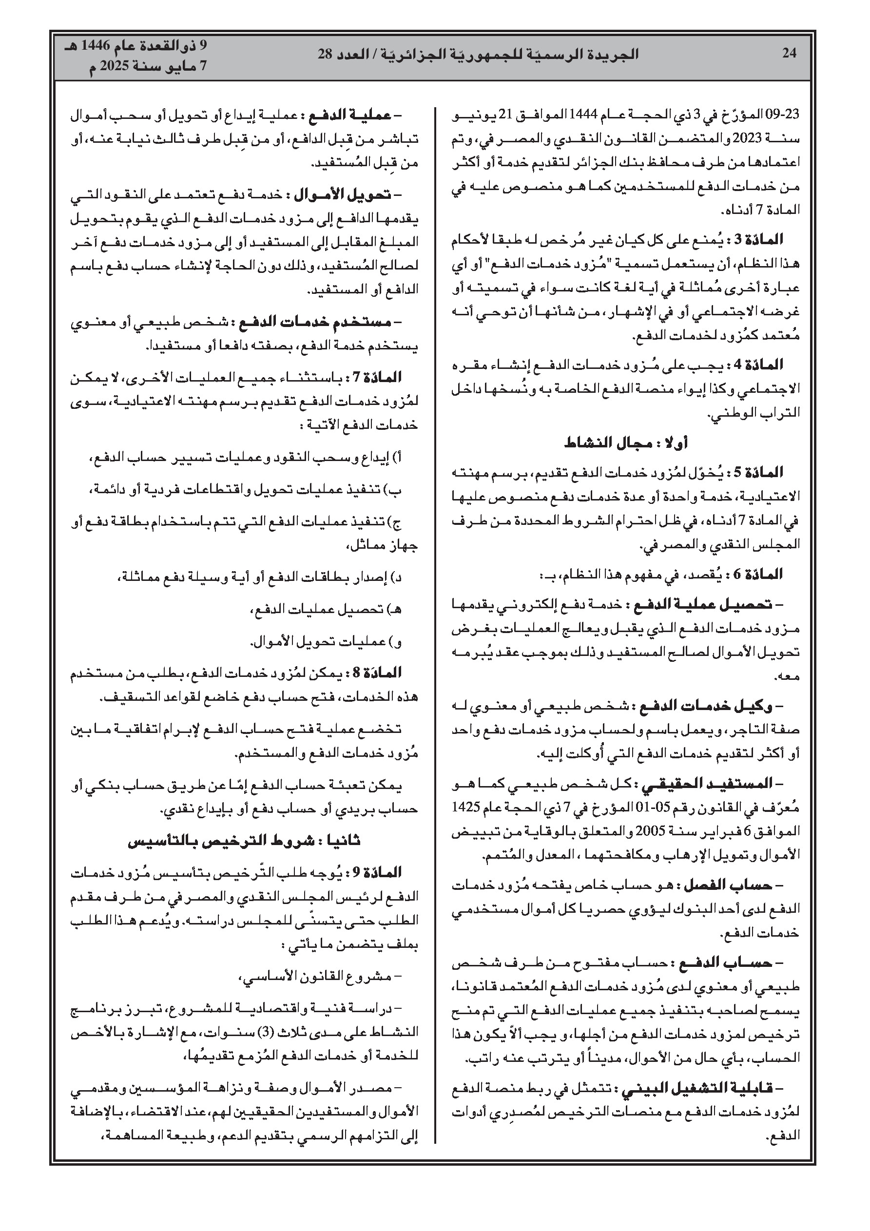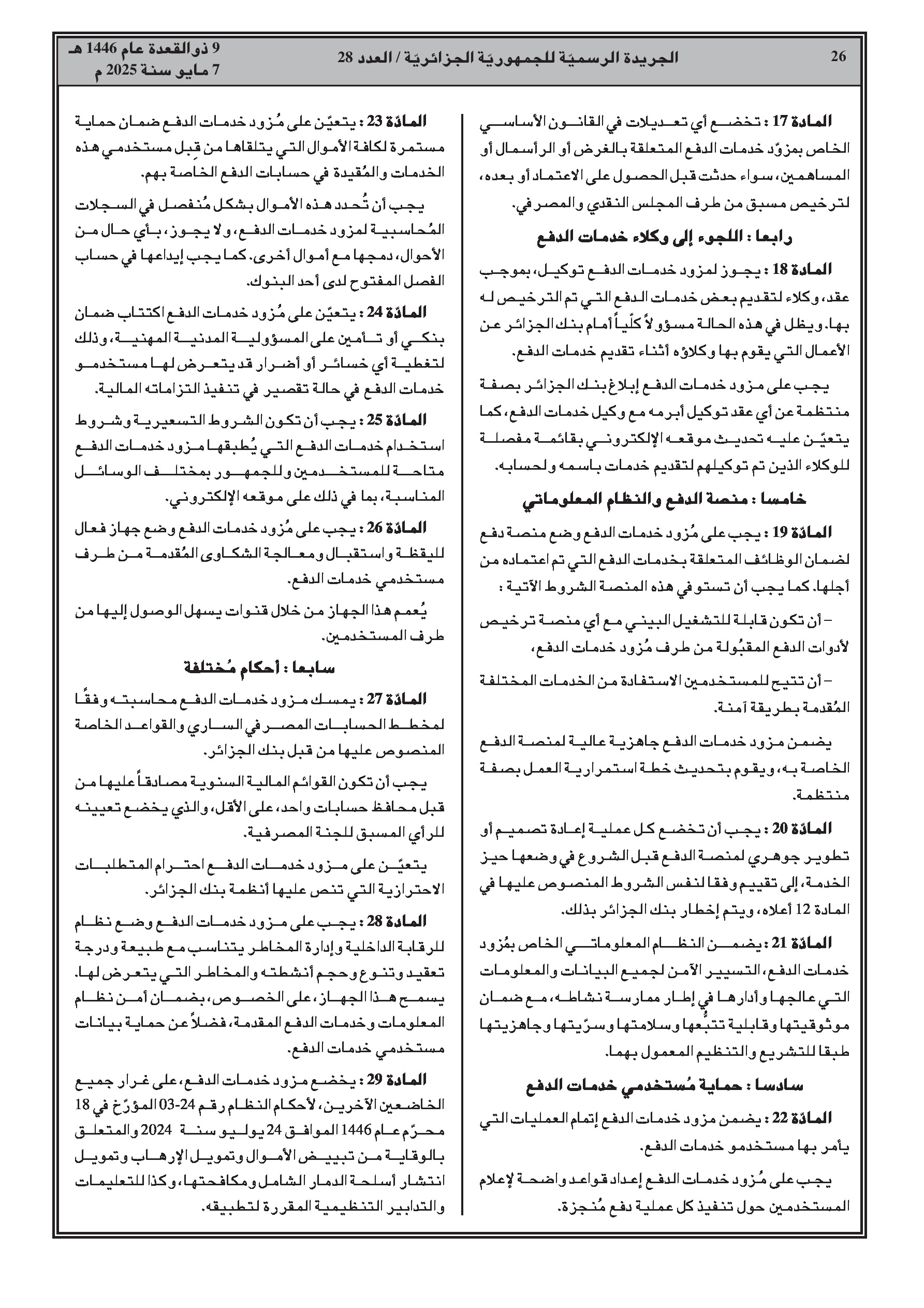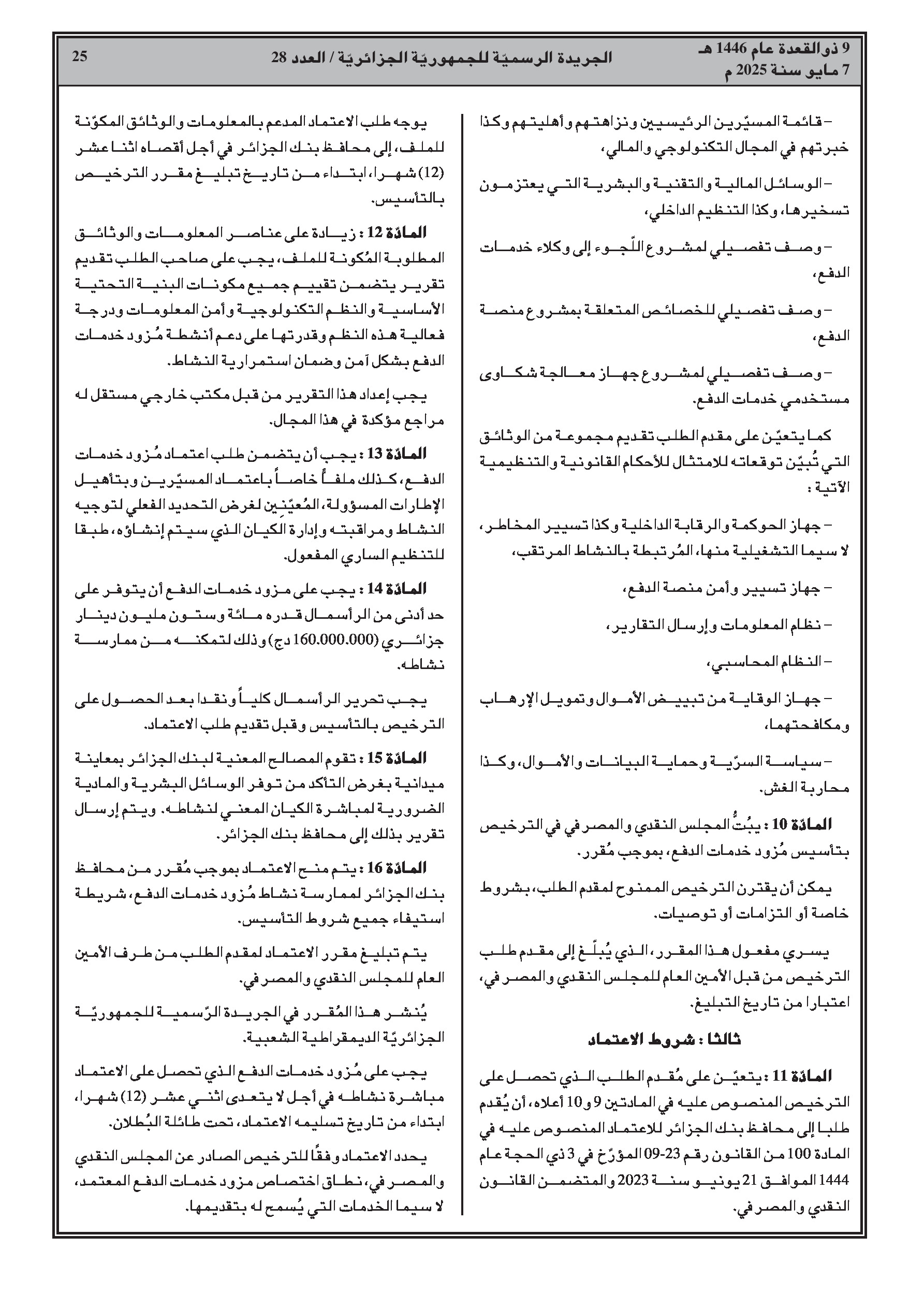 - رأس مال أدنى لمقدمي خدمات الدفع: 160 مليون دينار جزائري.
