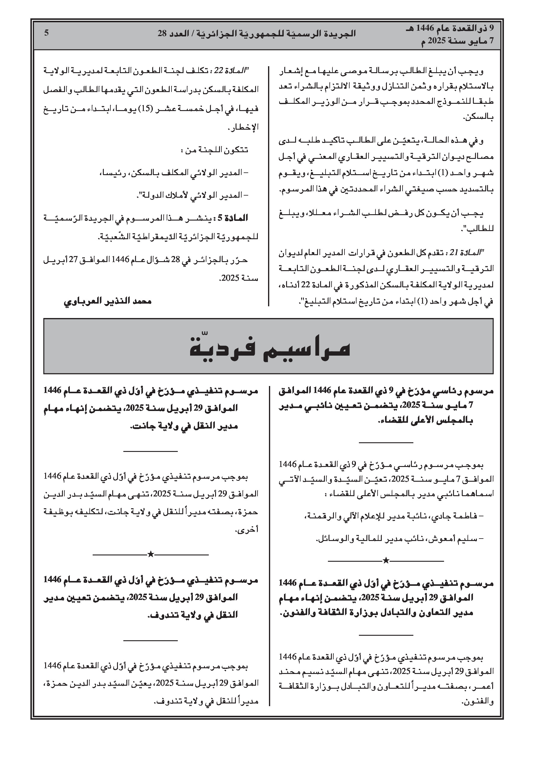 مراسيم رئاسية وتنفيذية تتعلق بتعيين نواب مديرين بالمجلس الأعلى للقضاء، وإنهاء مهام مديرين بوزارة الثقافة والفنون وبقطاع النقل، وتعيين مدير نقل جديد بولاية تندوف.