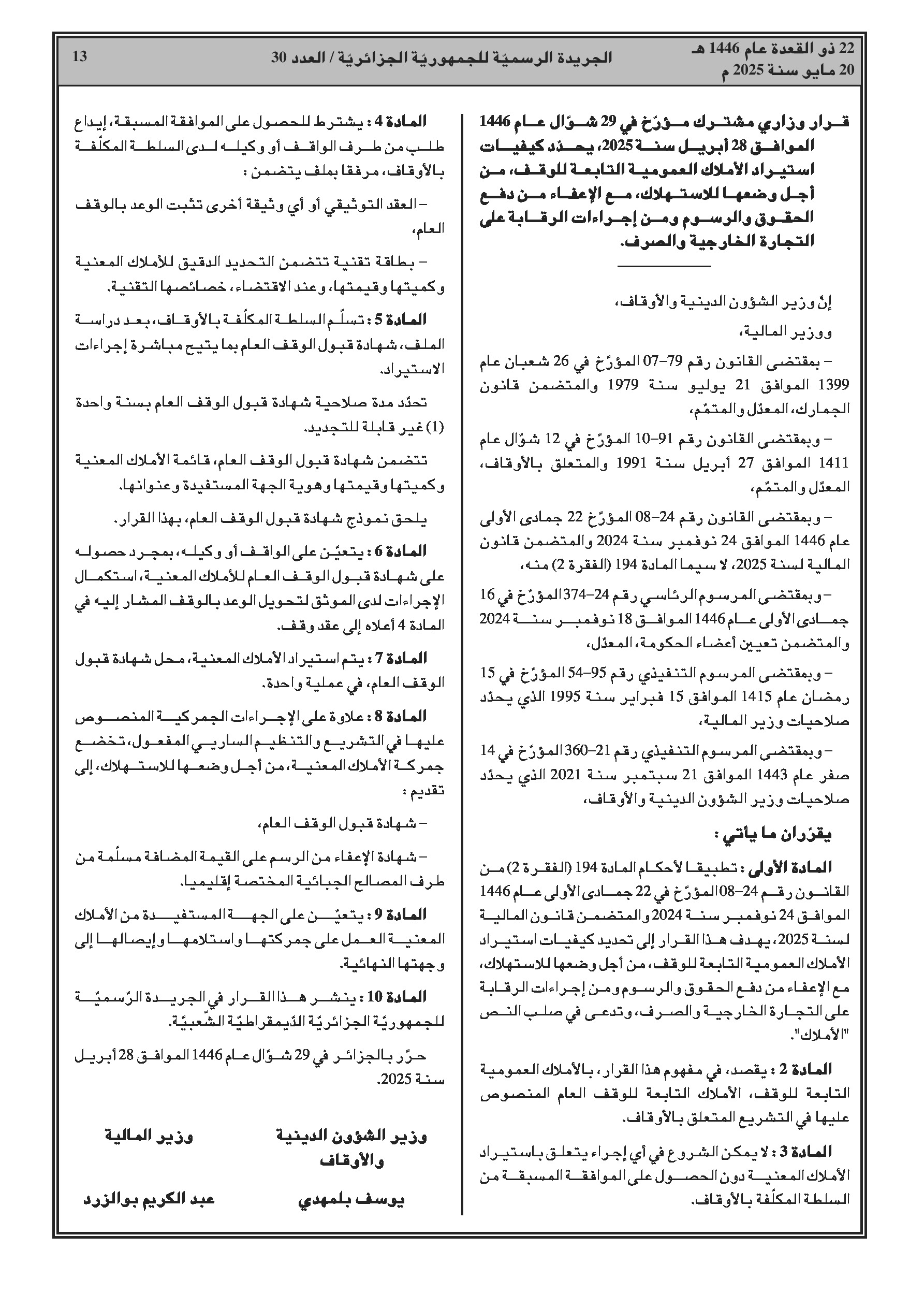 - المالية: تعديل قرار تحديد نفقات البحث والتطوير والابتكار المؤهلة للخصم الضريبي؛ تحديد كيفيات استيراد أموال الوقف العمومي مع الإعفاء من الحقوق والرسوم.