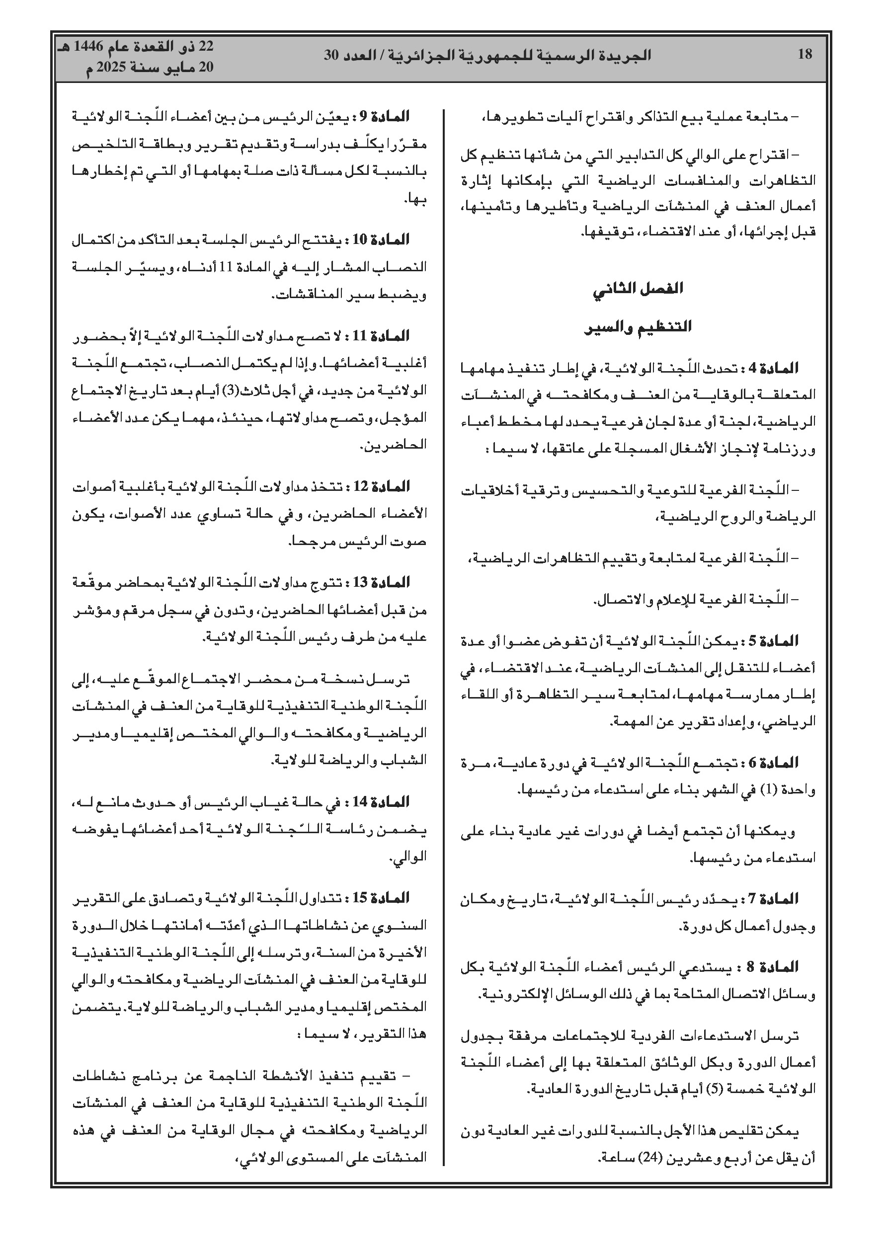 - الرياضة: تحديد النظام الداخلي النموذجي للجنة الولائية للوقاية من العنف في المنشآت الرياضية.