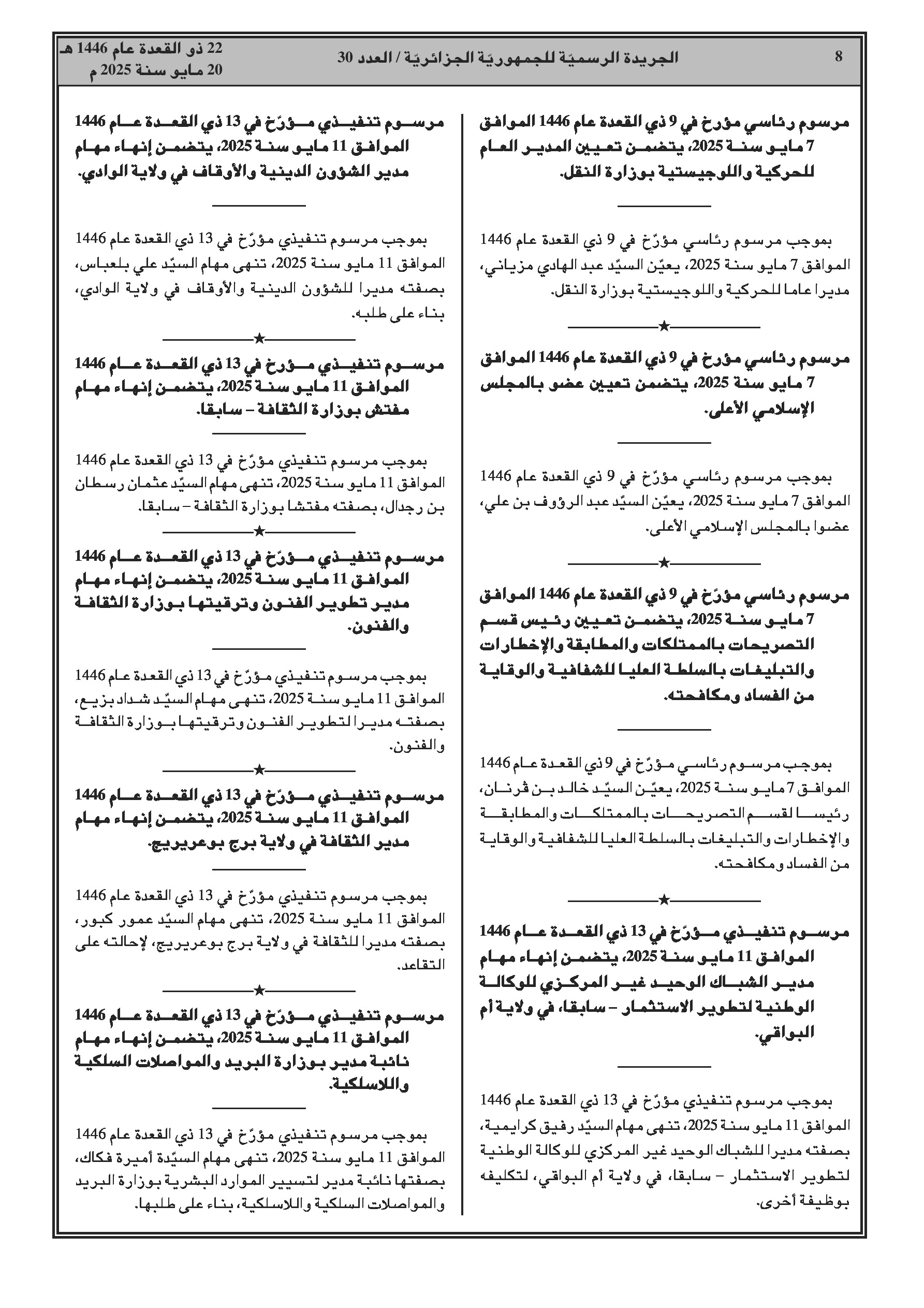 سلسلة مراسيم رئاسية وتنفيذية تتعلق بإنهاء مهام وتعيين مسؤولين جدد في مختلف القطاعات الوزارية والهيئات العمومية.