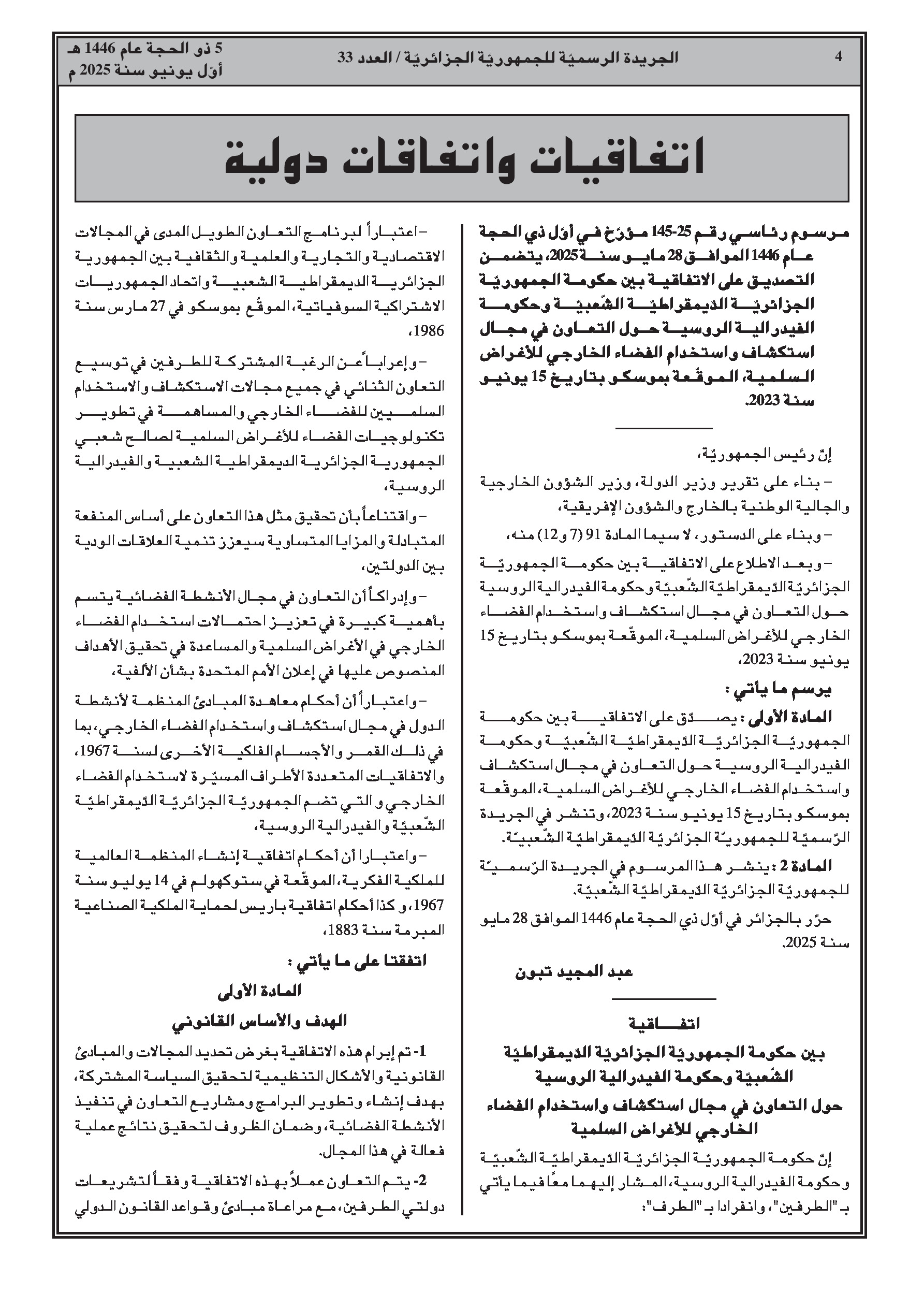 المرسوم الرئاسي رقم 25-145 يصادق على الاتفاقية الجزائرية الروسية بشأن التعاون الفضائي، الموقعة في موسكو بتاريخ 15 جوان 2023. تحدد هذه الاتفاقية إطار التعاون في مجالات مثل علوم الفضاء، الاستشعار عن بعد، الاتصالات الفضائية، الملاحة عبر الأقمار الصناعية، وتكوين المتخصصين.
