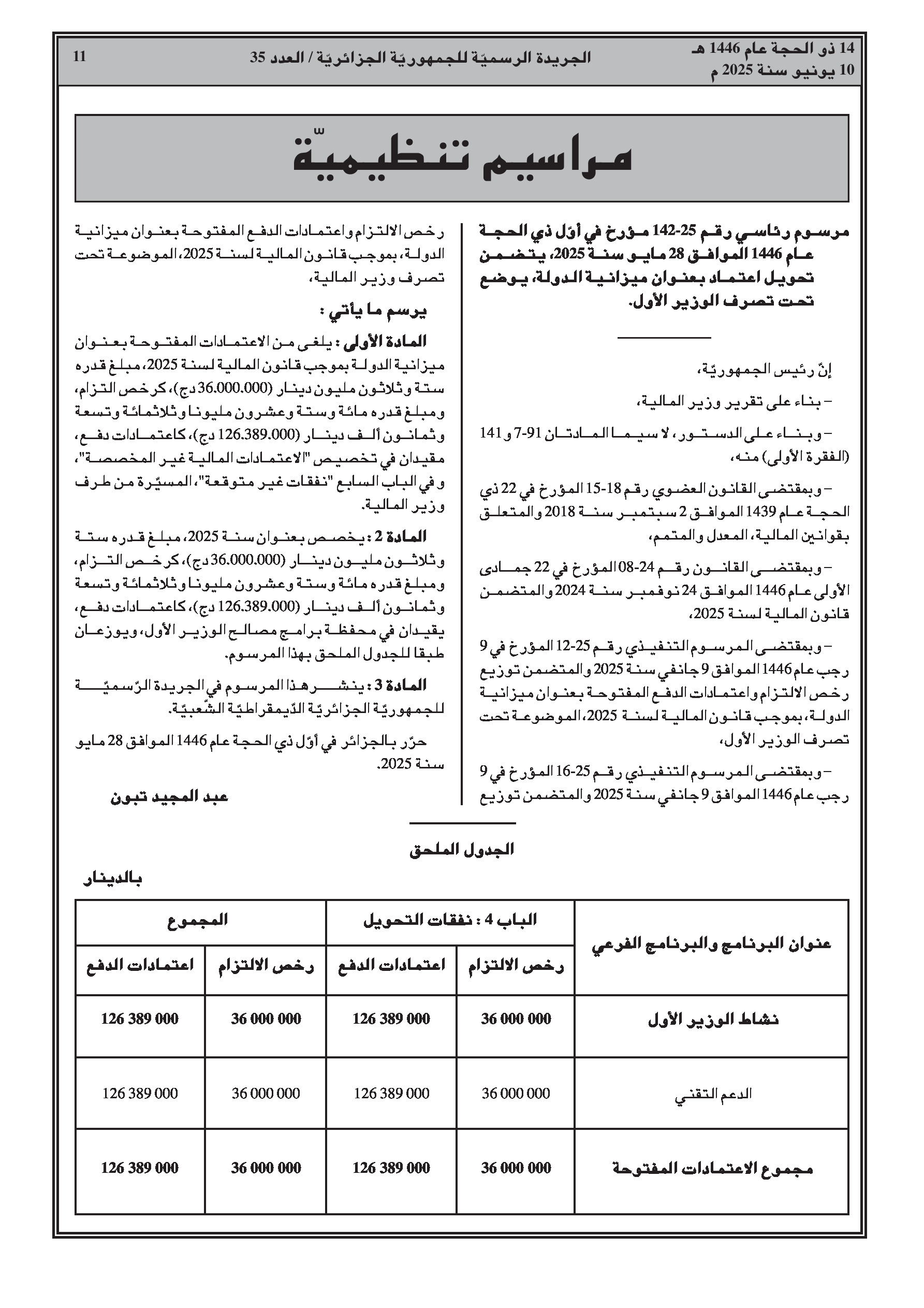 المرسوم الرئاسي رقم 25-142 يرخص بتحويل اعتمادات ضمن ميزانية الدولة لعام 2025، معيدًا تخصيص أموال لمصالح الوزير الأول. المرسوم التنفيذي رقم 25-150 يعدل ويتمم المرسوم رقم 19-196 المتعلق بإنشاء وتحديد مهام وتنظيم وسير اللجنة الوطنية للوقاية من الأمراض المتنقلة عن طريق المياه ومكافحتها، معززًا إطارها العملياتي وتمثيلها.