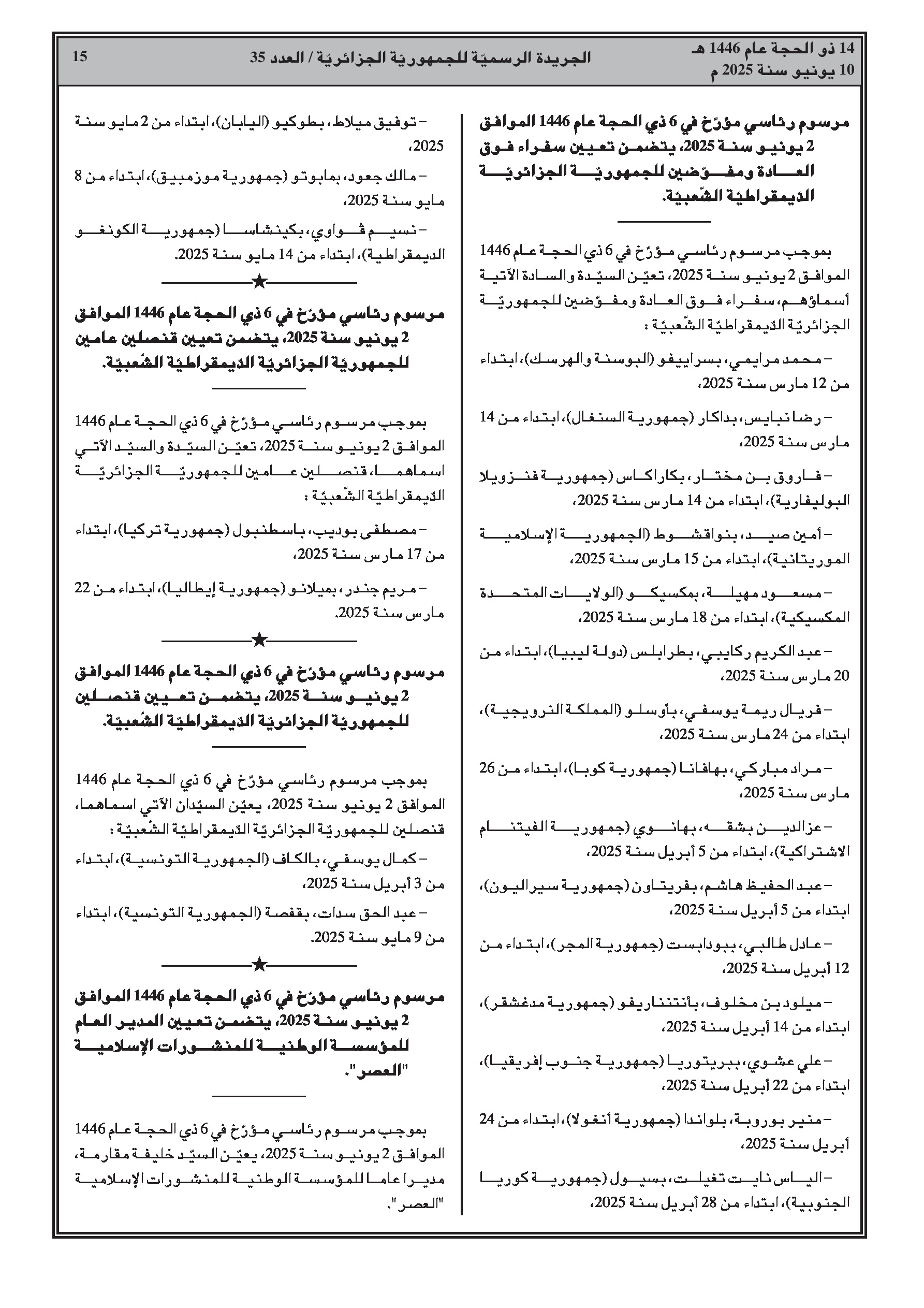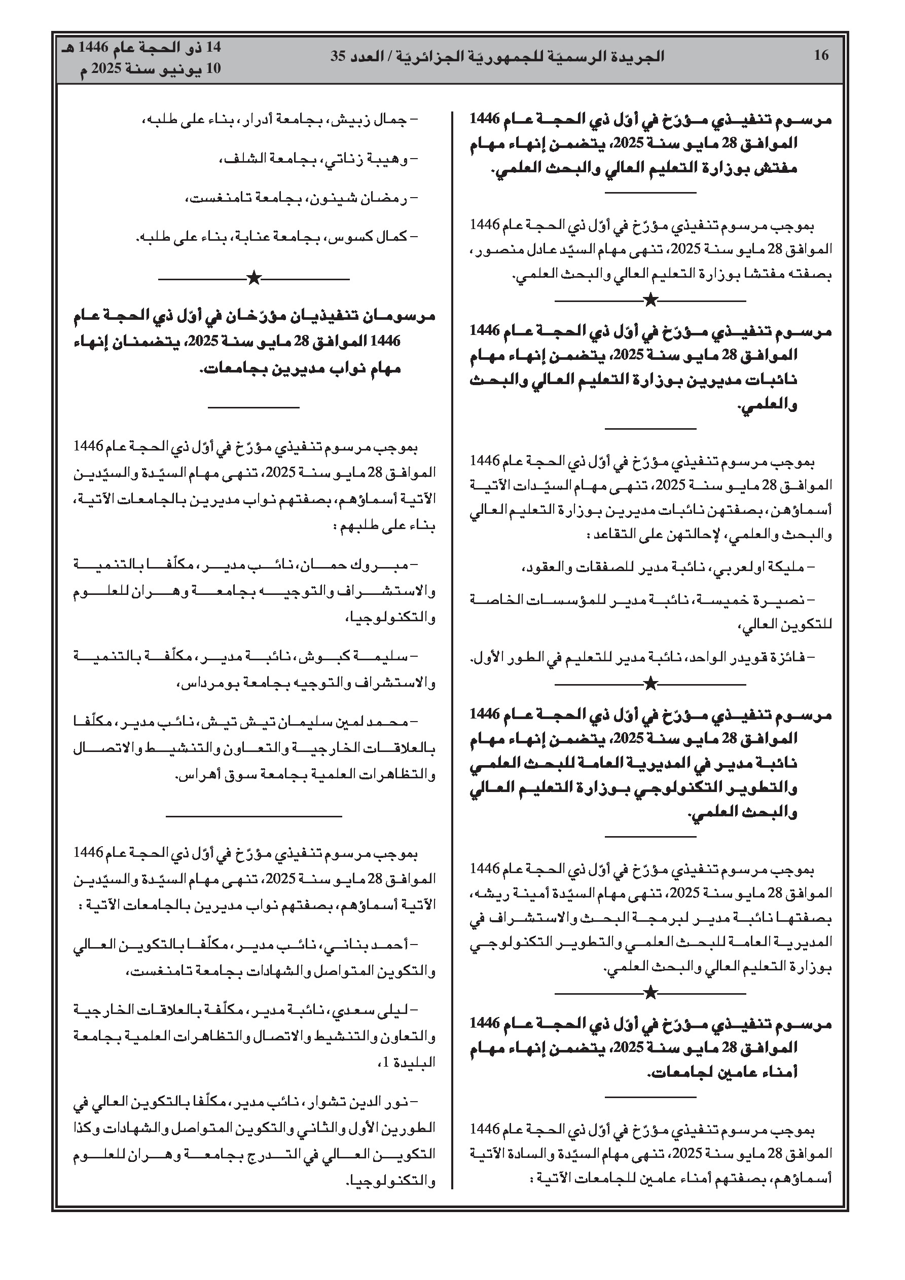مراسيم متعددة تعلن عن تغييرات واسعة في الموظفين، تشمل إنهاء مهام وتعيينات جديدة لـ: مديرين، مدراء فرعيين، سفراء، وقناصل بوزارة الشؤون الخارجية؛ المدير العام لدار النشر الإسلامية 'العصر'؛ مفتش، مديرات فرعيات، أمناء عامين للجامعات، نواب مديري الجامعات، وعمداء كليات في قطاع التعليم العالي. بالإضافة إلى ذلك، لوحظت تغييرات على مستوى المديرين (إنهاء مهام وتعيينات) في قطاعات العلوم البيطرية، الصيد البحري، الموارد المائية، السياحة، الطاقة، الفلاحة، ومديريات الصحة الولائية.