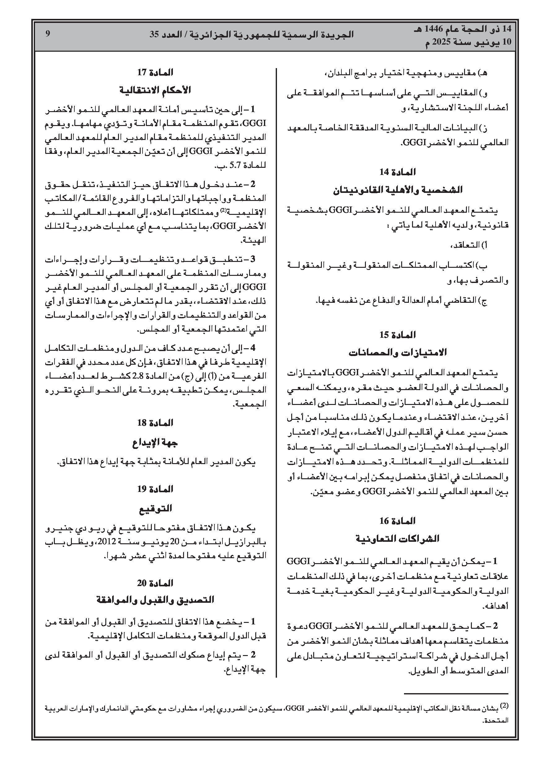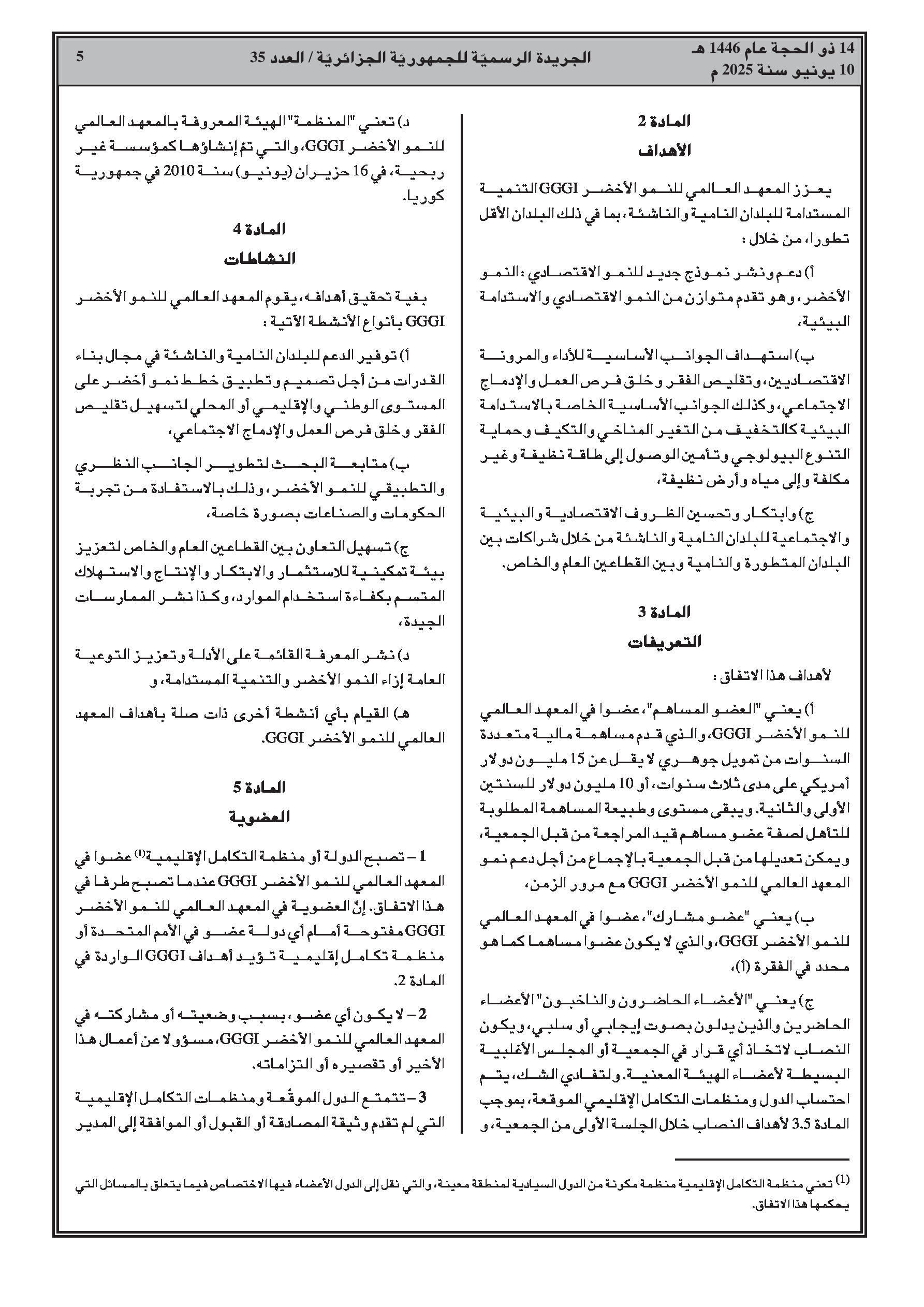 المرسوم الرئاسي رقم 25-146 يضفي الطابع الرسمي على انضمام الجزائر إلى الاتفاق المتعلق بإنشاء المعهد العالمي للنمو الأخضر، الموقع في ريو دي جانيرو بتاريخ 20 جوان 2012. يهدف المعهد إلى دعم البلدان النامية في انتقالها إلى نموذج نمو أخضر، يركز على الأداء الاقتصادي، والحد من الفقر، وخلق فرص العمل، والإدماج الاجتماعي، والاستدامة البيئية.