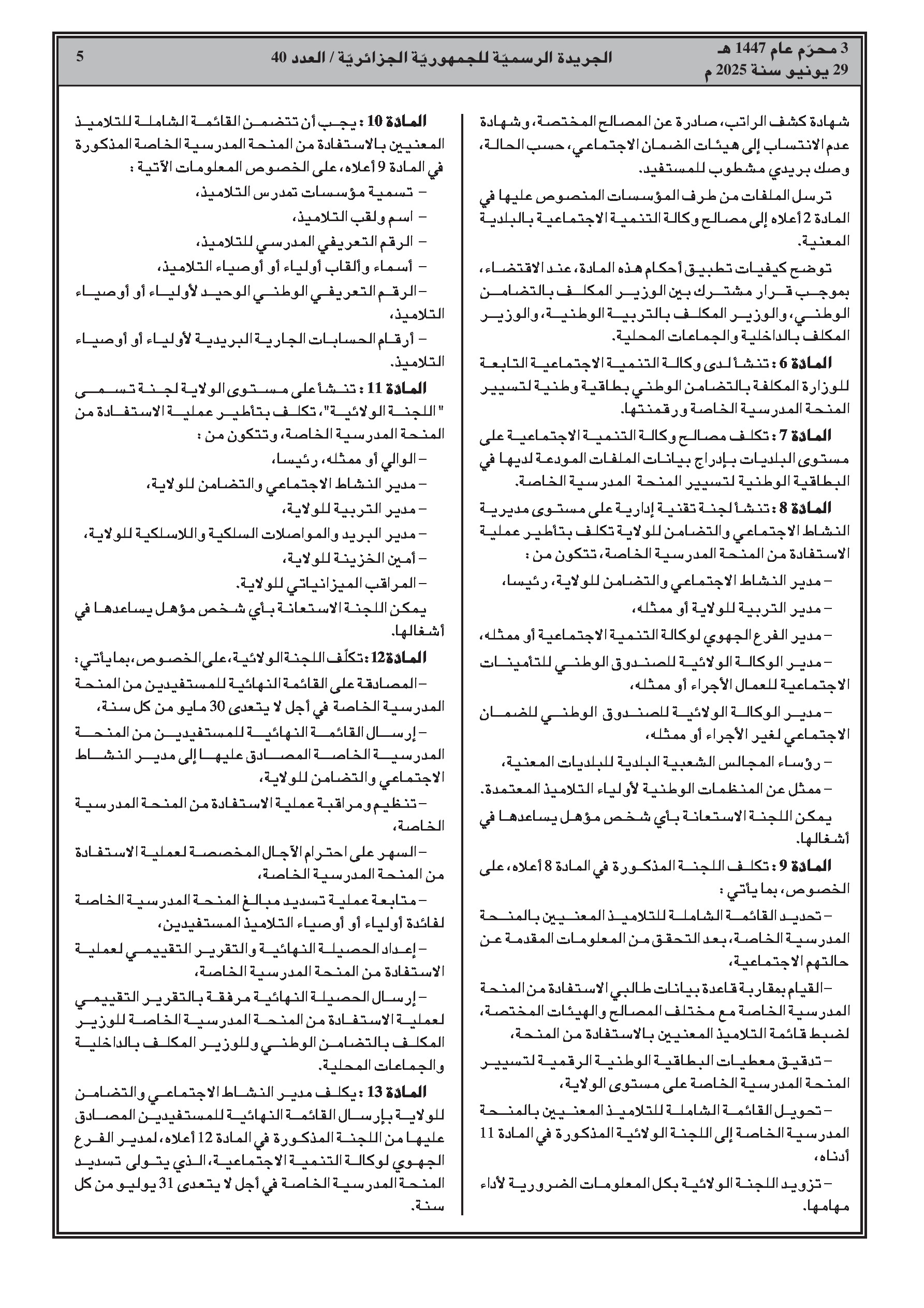 مرسوم تنفيذي يحدد شروط وكيفيات الاستفادة من المنحة المدرسية الخاصة التي تهدف إلى دعم الأسر المعوزة في بداية كل عام دراسي.