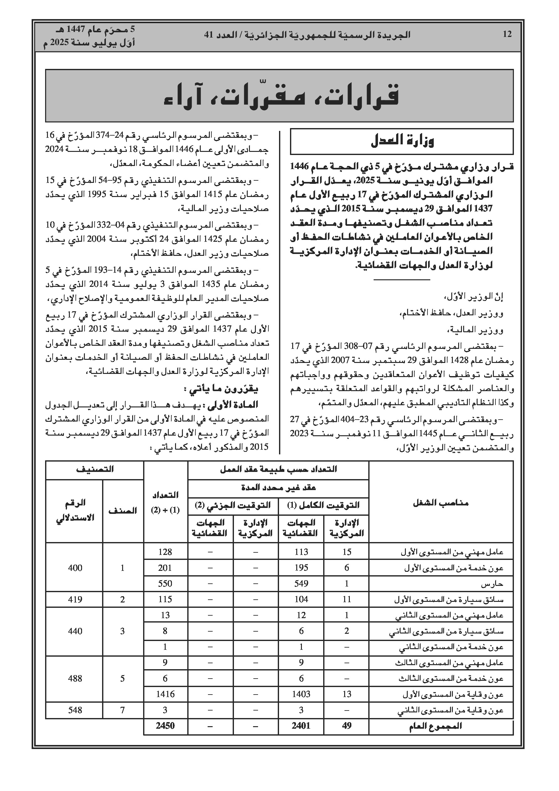 يحدد مرسوم تنفيذي تنظيم ومهام المفتشية العامة لوزارة الشباب. بالتزامن مع ذلك، يقوم قرار وزاري مشترك بتحديث تعداد وتصنيف أعوان الصيانة والخدمة المتعاقدين في وزارة العدل.
