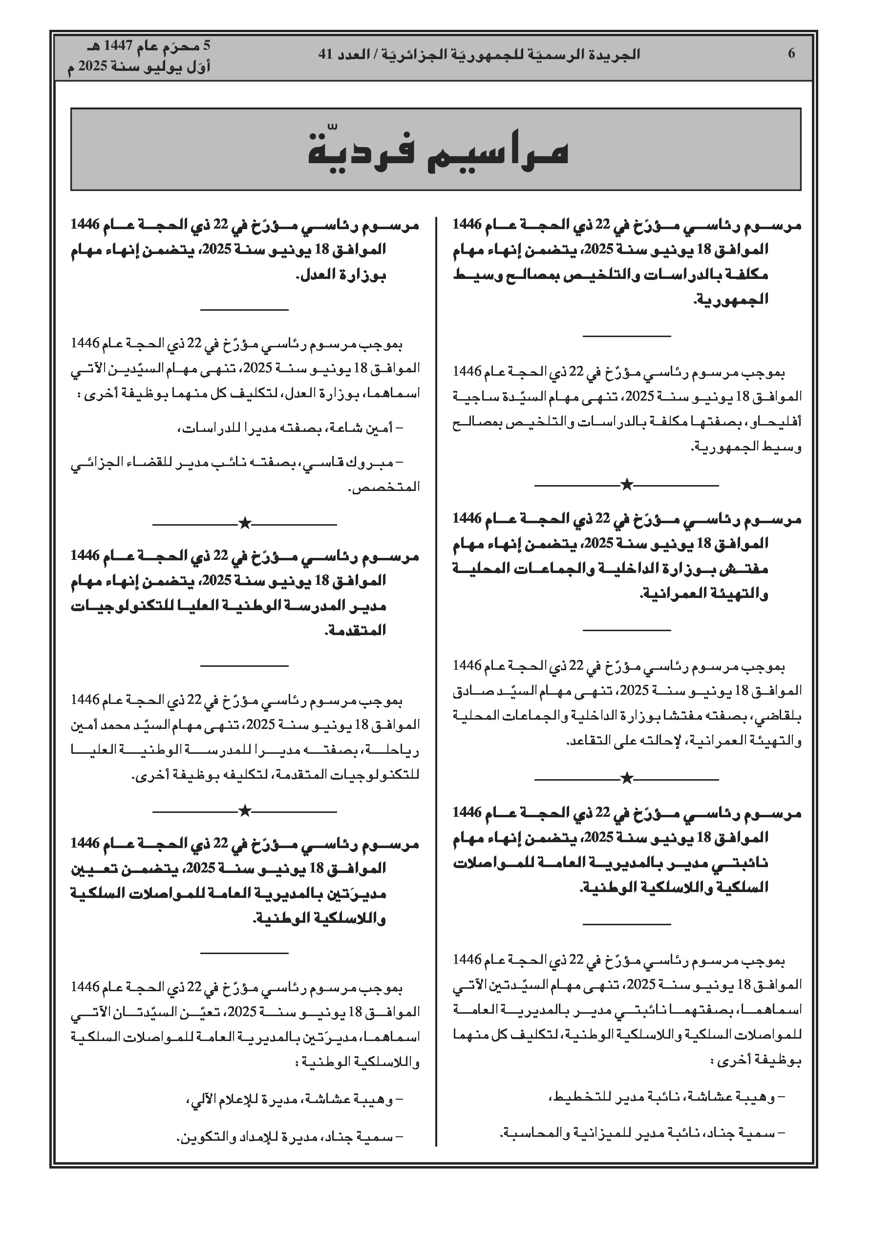 صدور عدة مراسيم رئاسية وتنفيذية تتضمن تعيين وإنهاء مهام مسؤولين سامين في مختلف القطاعات الحكومية.