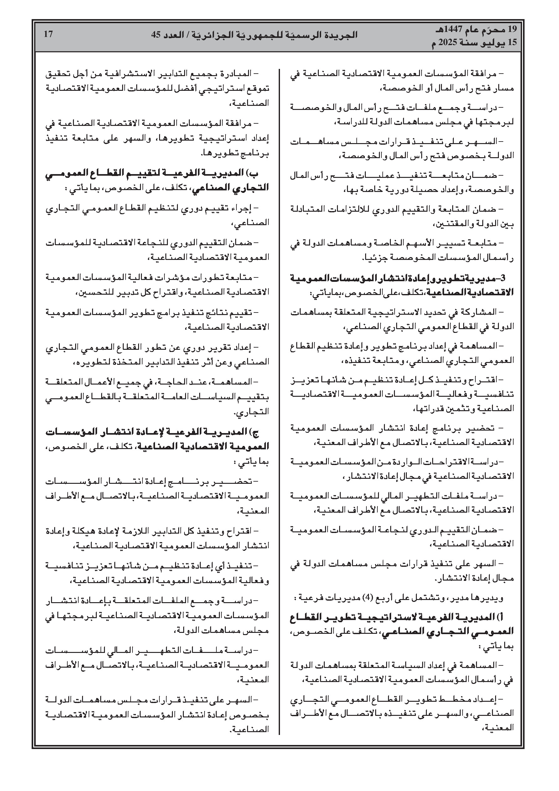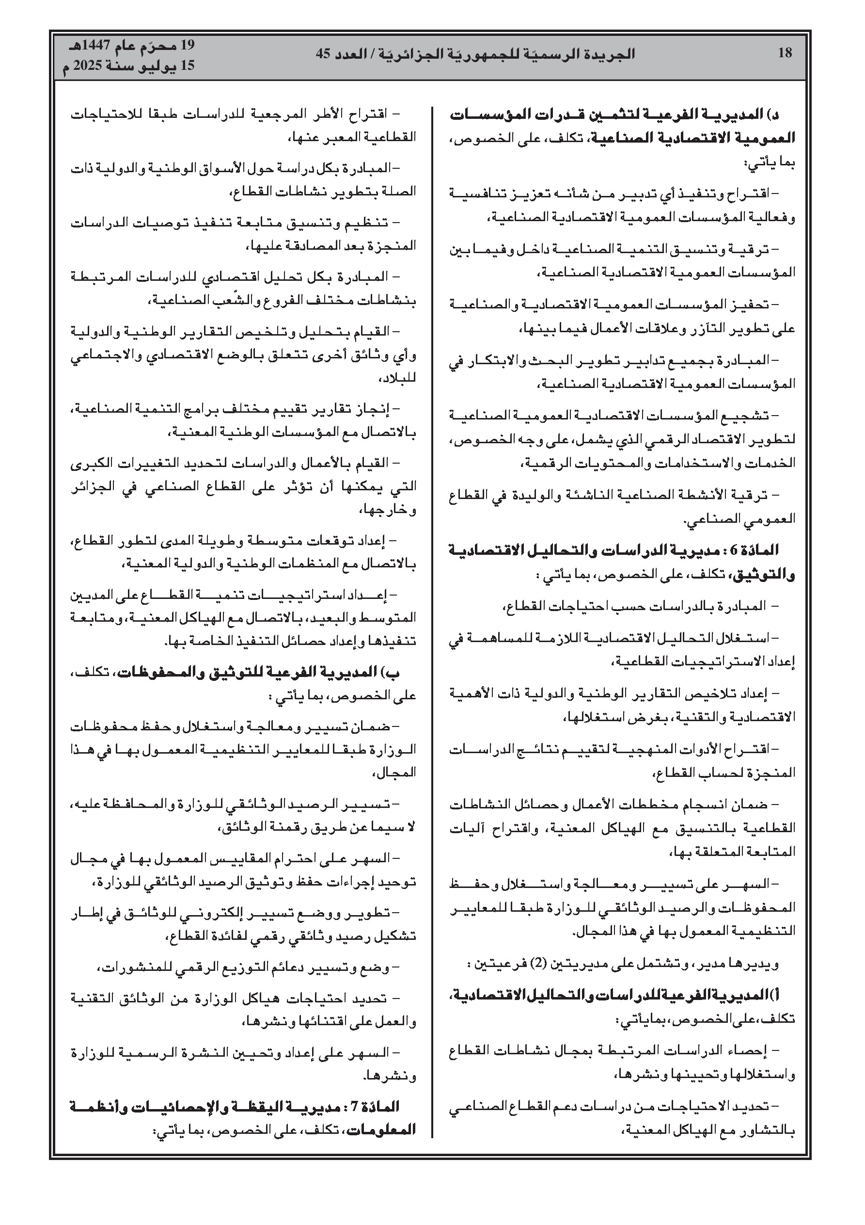 إعادة تنظيم شاملة لوزارة الصناعة بعد فصلها عن قطاع الإنتاج الصيدلاني. تحدد النصوص الجديدة مهام الوزارة وهيكلها الإداري، مع التركيز على تطوير الصناعة، الاستثمار، والمؤسسات الصغيرة والمتوسطة.