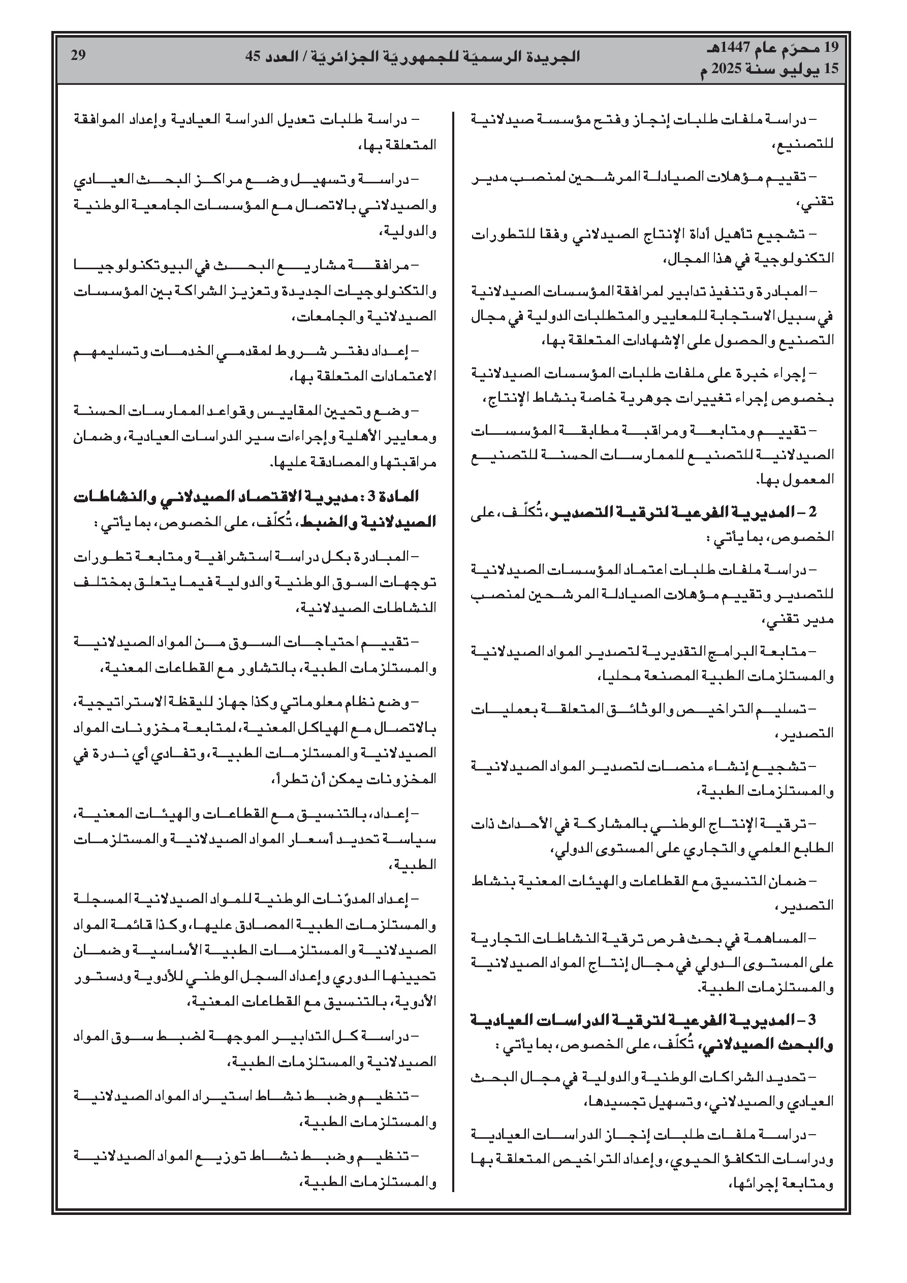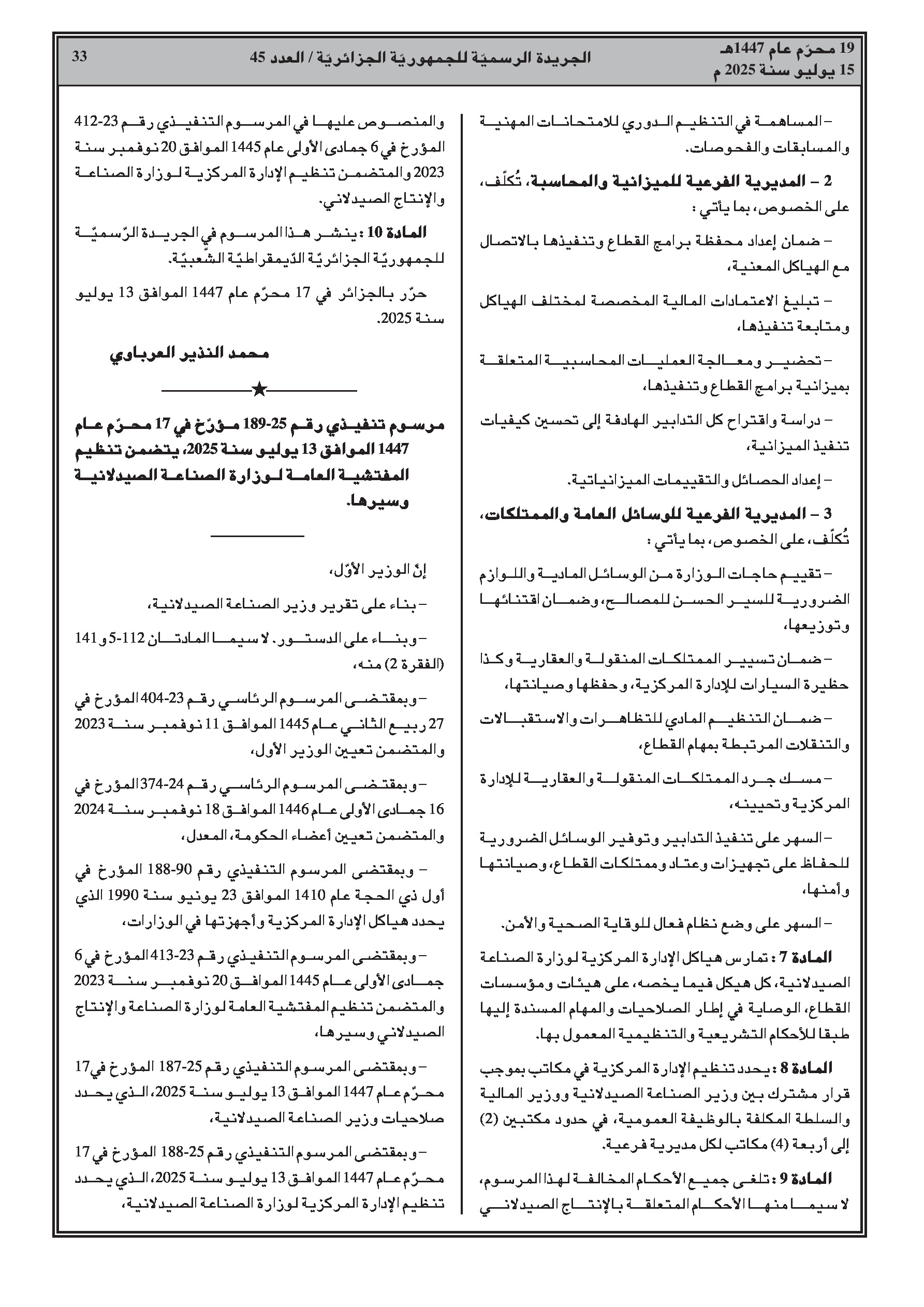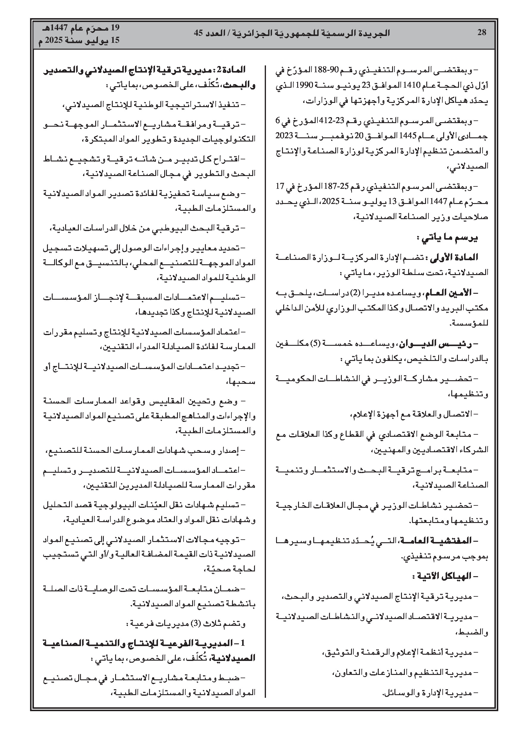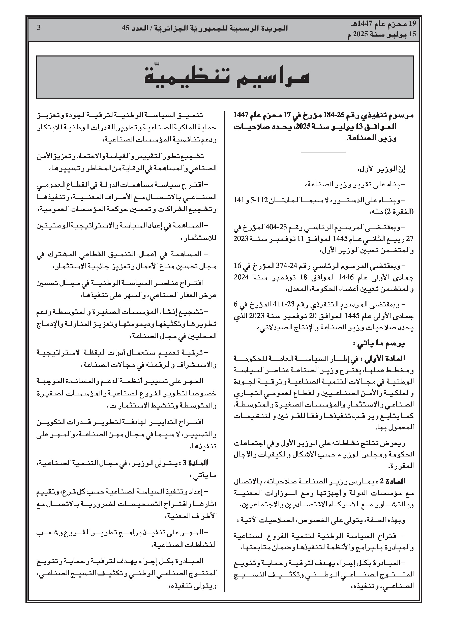 بموجب المراسيم التنفيذية 25-184، 25-185 و 25-186، تم تحديد صلاحيات وزير الصناعة، وتنظيم الإدارة المركزية للوزارة، بالإضافة إلى تنظيم وسير المفتشية العامة. تلغي هذه النصوص الأحكام السابقة المتعلقة بالهيكل المدمج مع الإنتاج الصيدلاني.
