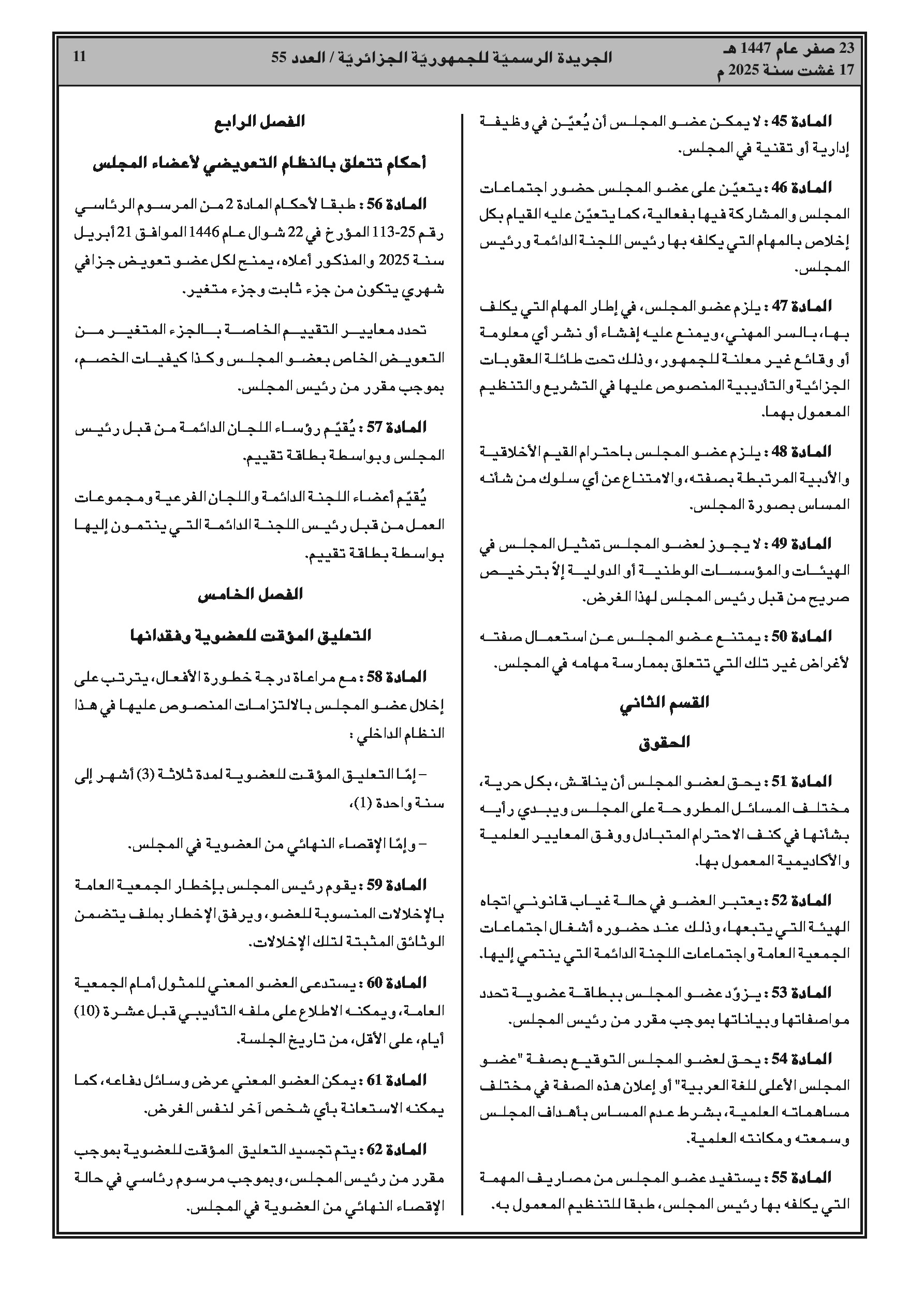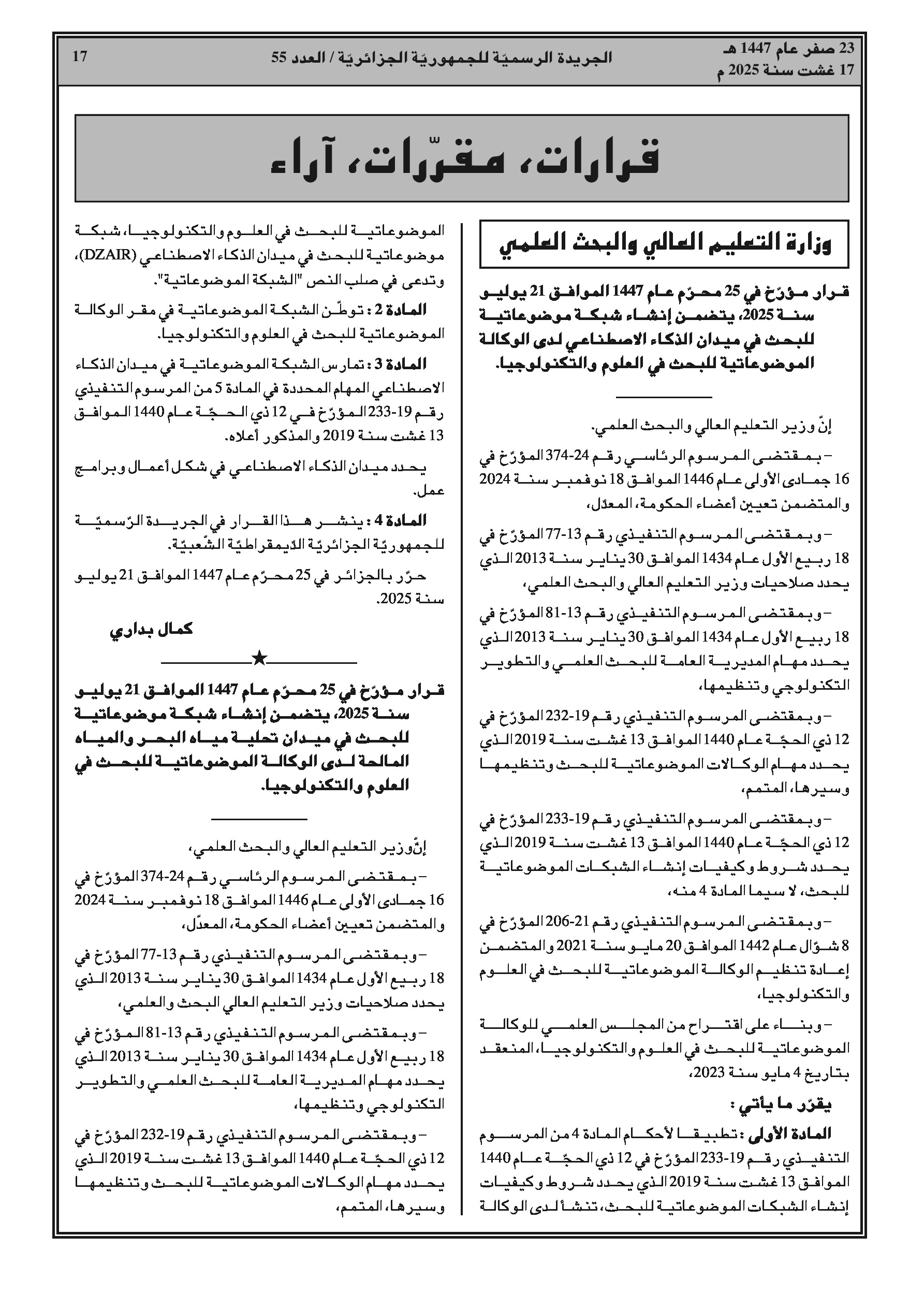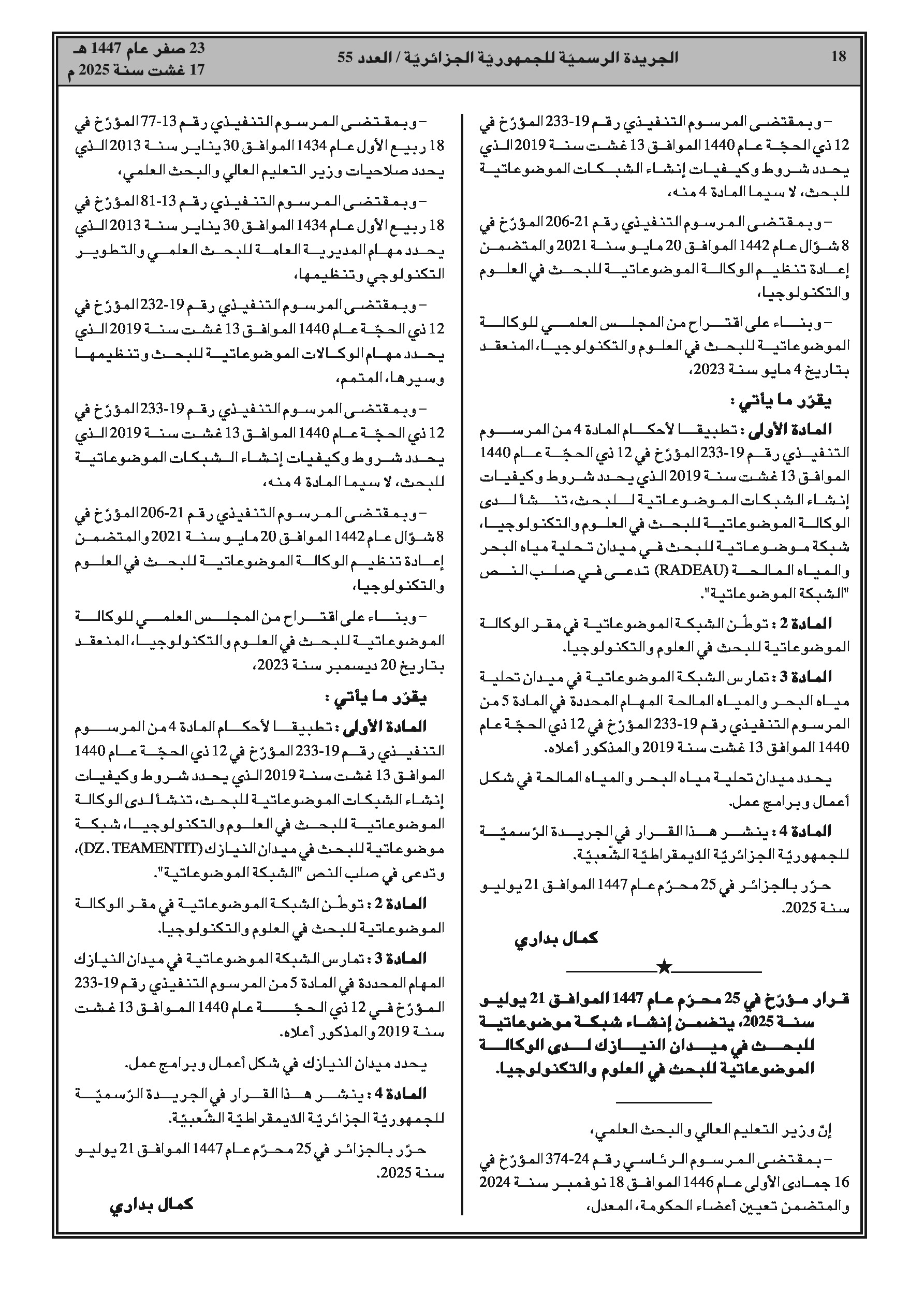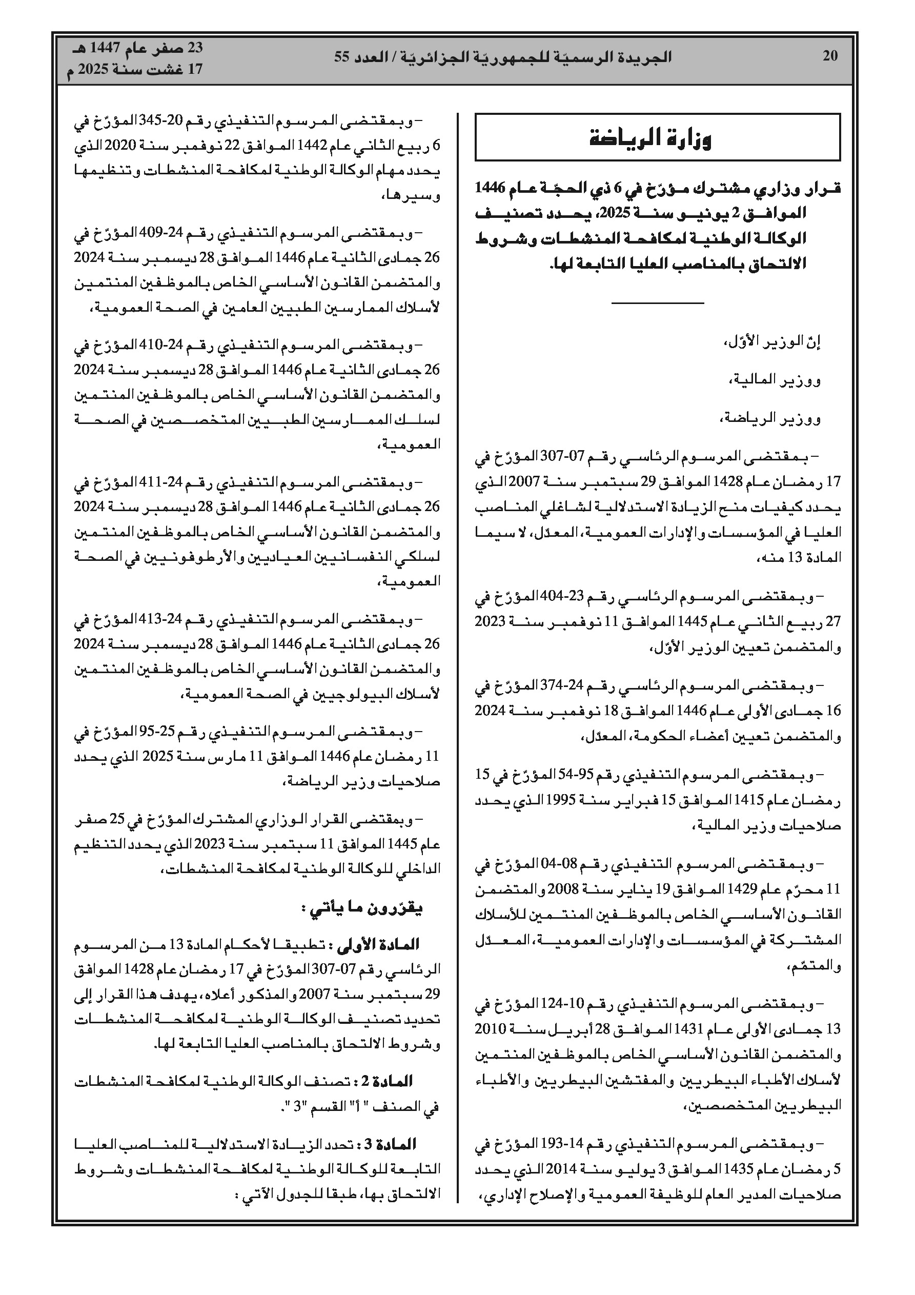 إصدار قرارات تنظيمية هامة تشمل المصادقة على النظام الداخلي للمجلس الأعلى للغة العربية، إنشاء مكتبات عمومية جديدة، تحديد تصنيف الوكالة الوطنية لمكافحة المنشطات، وتعديل تشكيلة هيئات رئيسية في قطاع الأدوية.