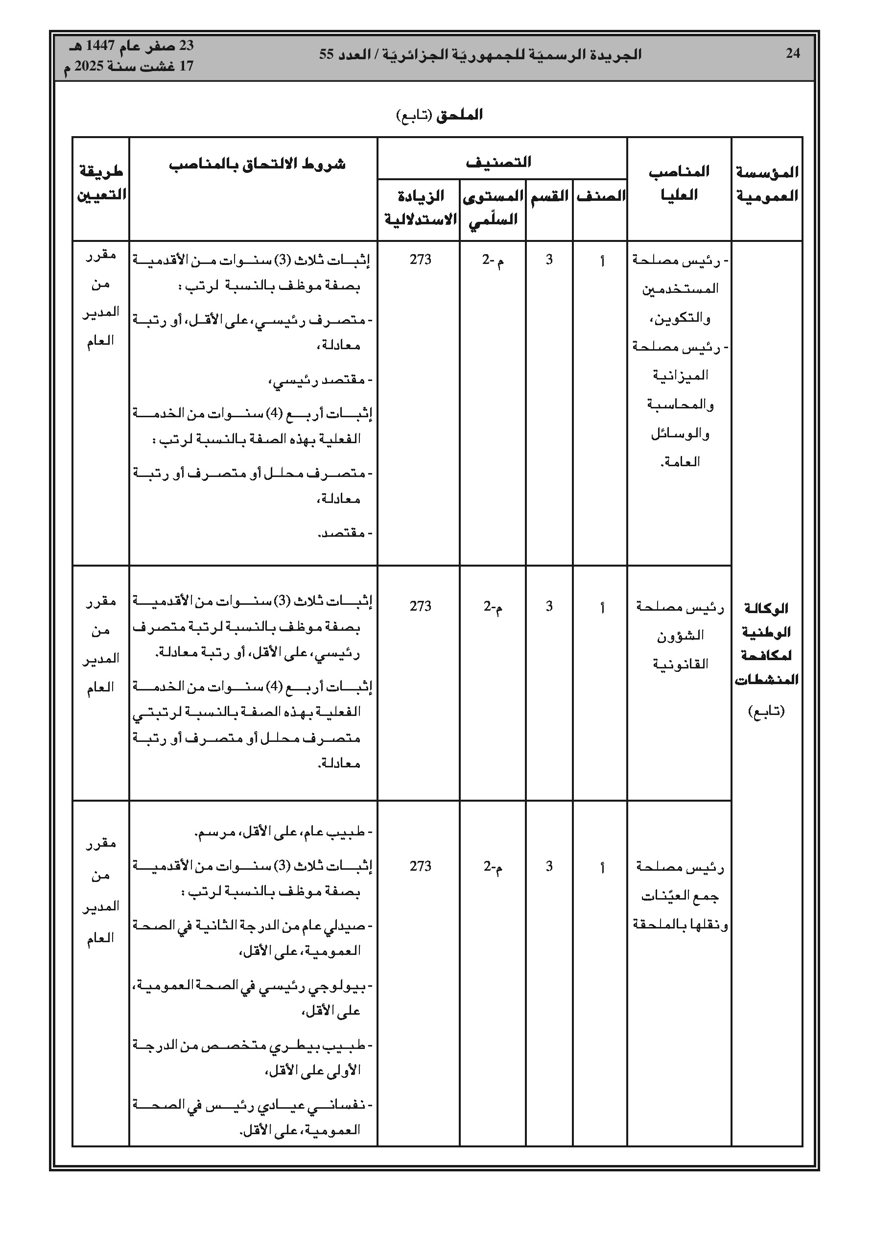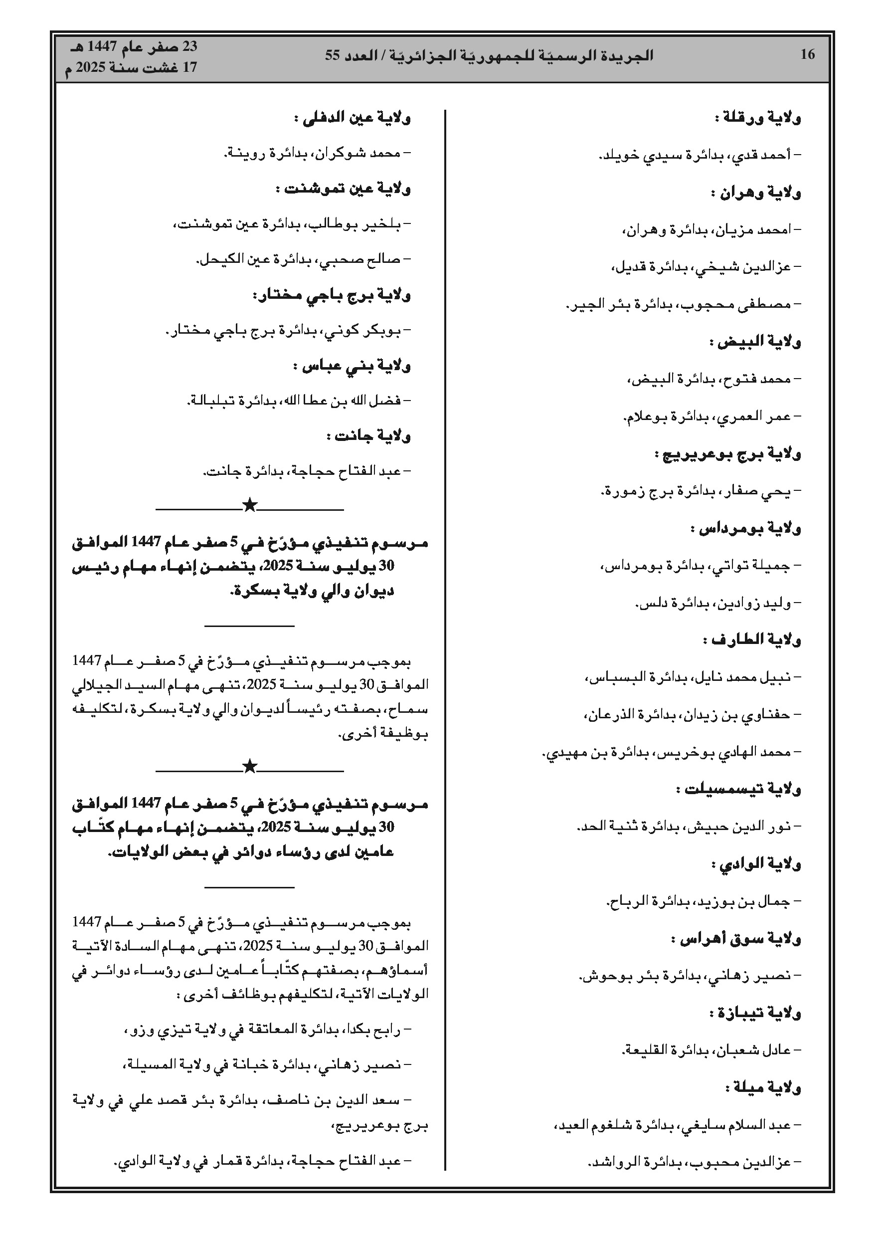 مراسيم رئاسية تتضمن إنهاء مهام وتعيين عدد كبير من رؤساء الدوائر في مختلف ولايات الوطن. كما تم تعيين قائد جديد للحرس الجمهوري ومدعين عامين عسكريين في البليدة وقسنطينة.