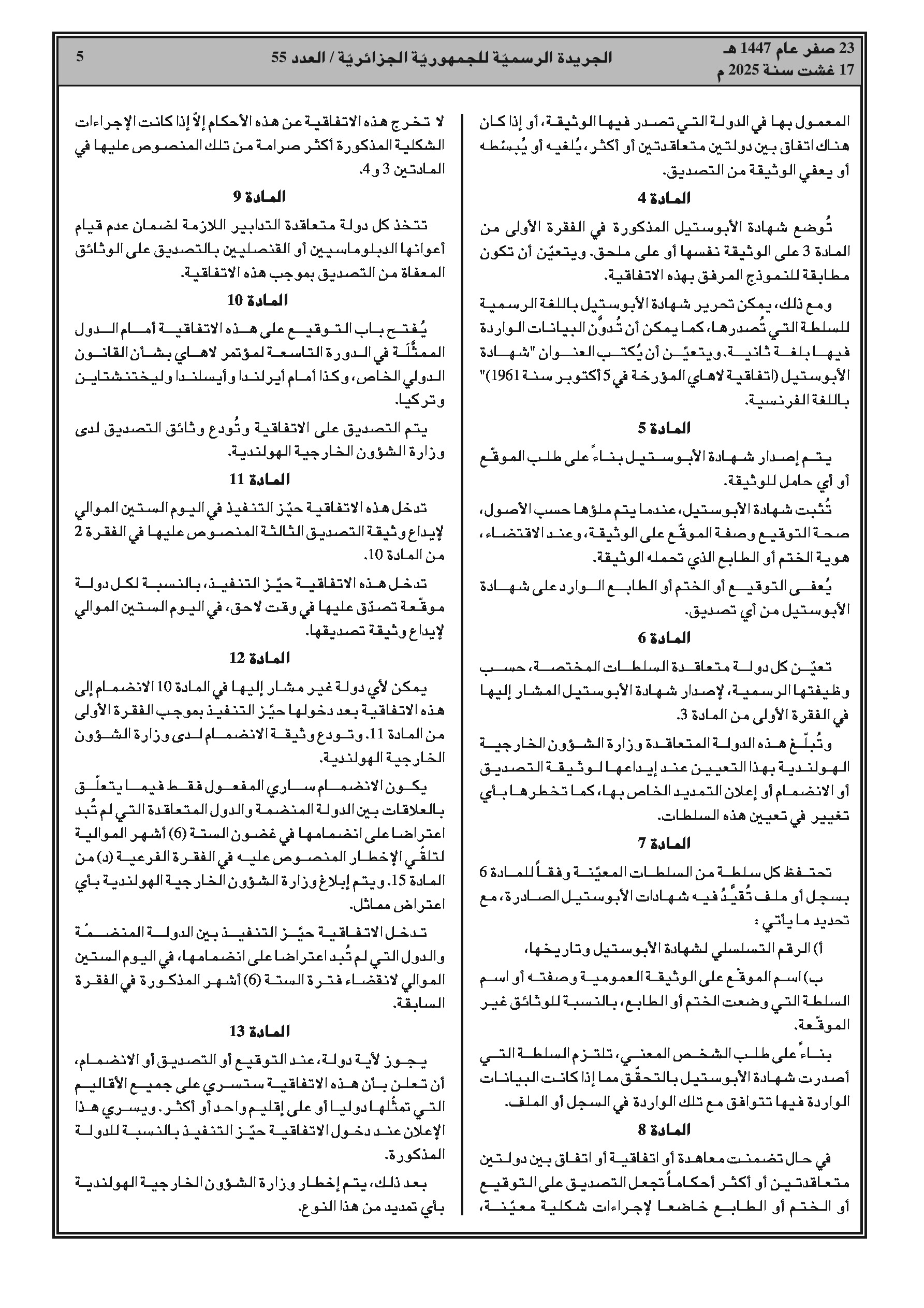 انضمام الجزائر إلى اتفاقية لاهاي ('الأبوستيل') لتبسيط التعامل بالوثائق الرسمية الأجنبية، ورفع التحفظ على مادة تضمن للمرأة المساواة أمام القانون وحرية التنقل.