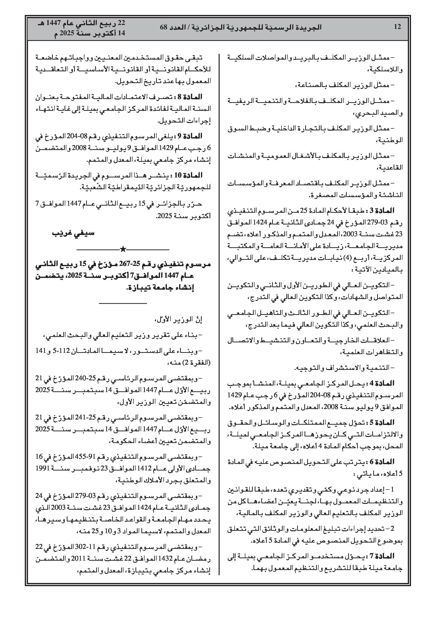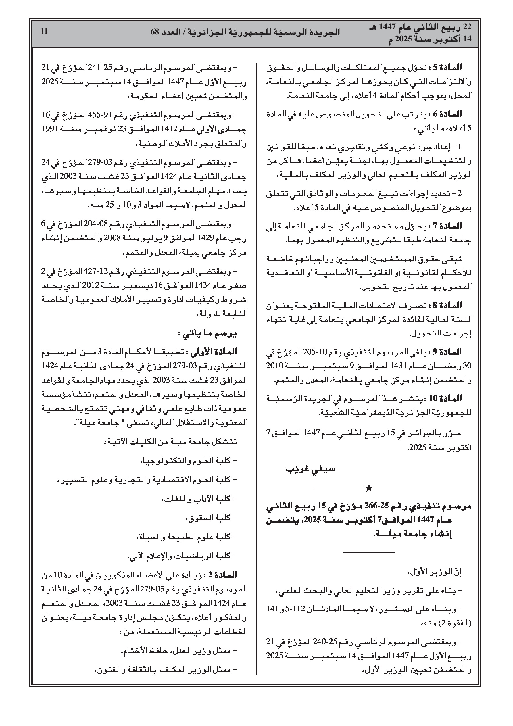 ترقية المراكز الجامعية في تندوف، النعامة، ميلة، وتيبازة إلى مصاف جامعات كاملة، مع تحديث الهيكل التنظيمي لجامعتي تلمسان وسيدي بلعباس لتعزيز العرض التكويني.