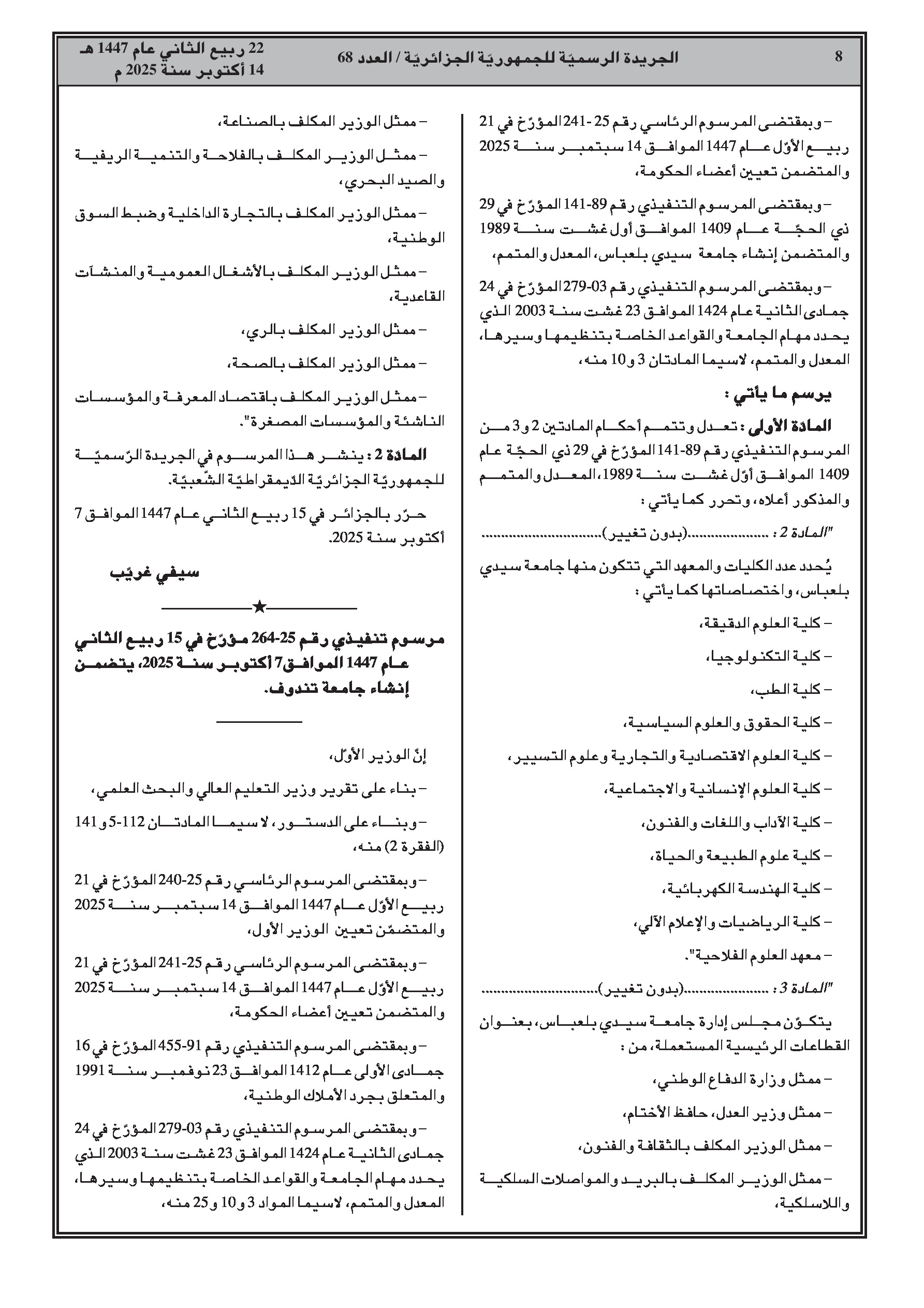 - تعديل وتتميم المراسيم المتعلقة بإنشاء جامعتي تلمسان وسيدي بلعباس، مع إعادة تحديد عدد الكليات والمعاهد المكونة لهما.