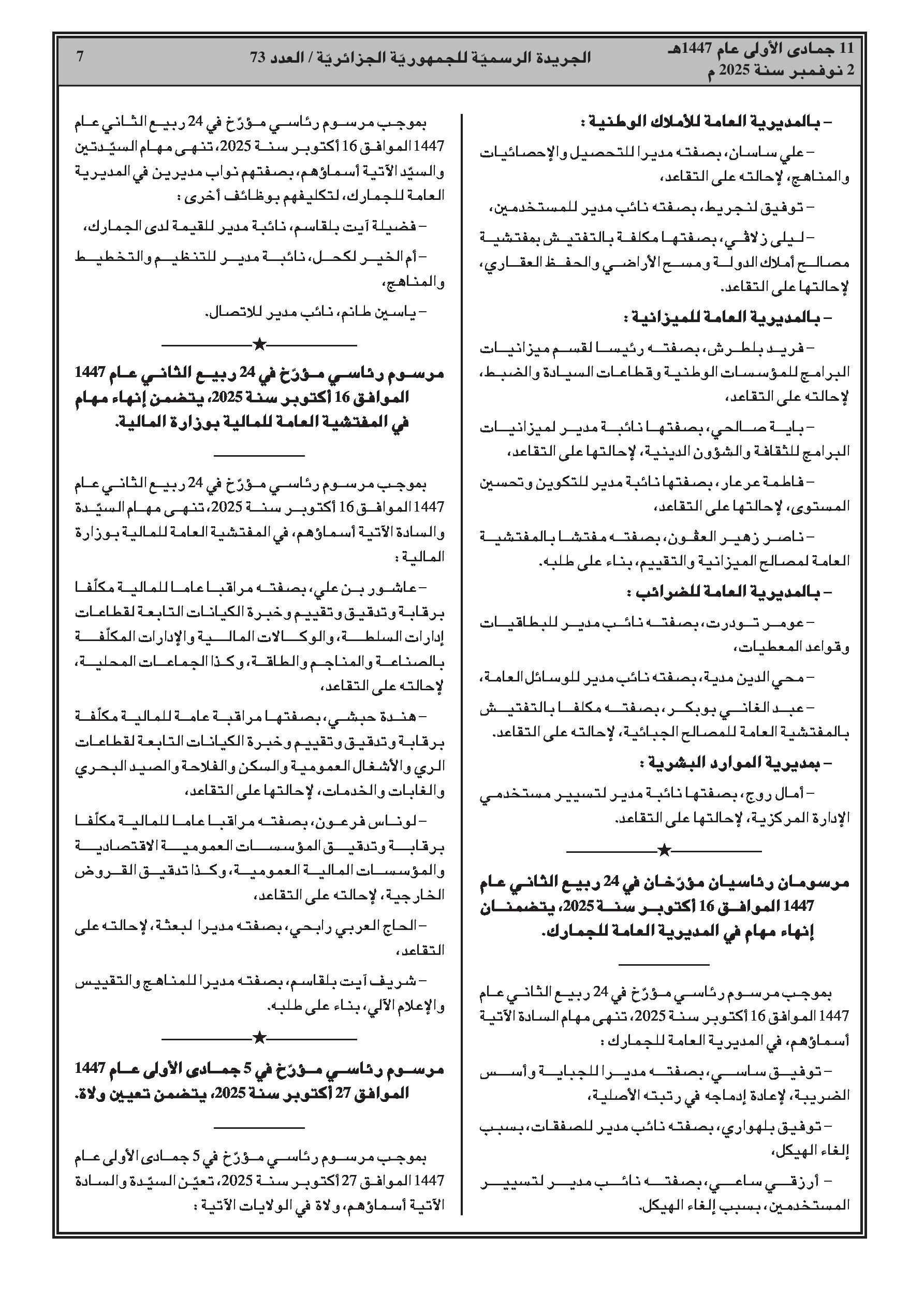 بموجب مراسيم رئاسية، تم إنهاء مهام وتعيين عدد من الولاة والولاة المنتدبين وكبار المسؤولين في مصالح الوزير الأول ووزارة المالية.