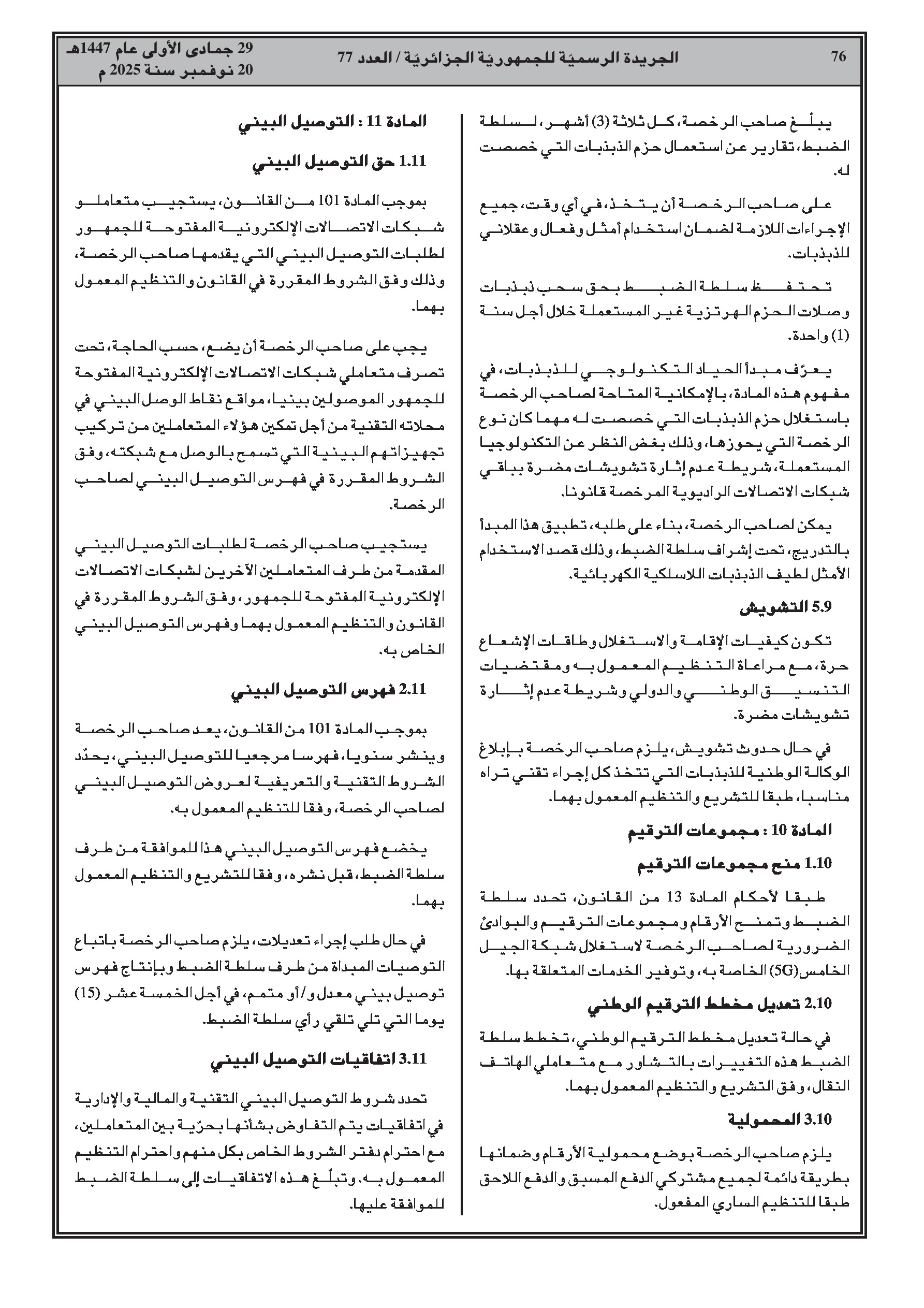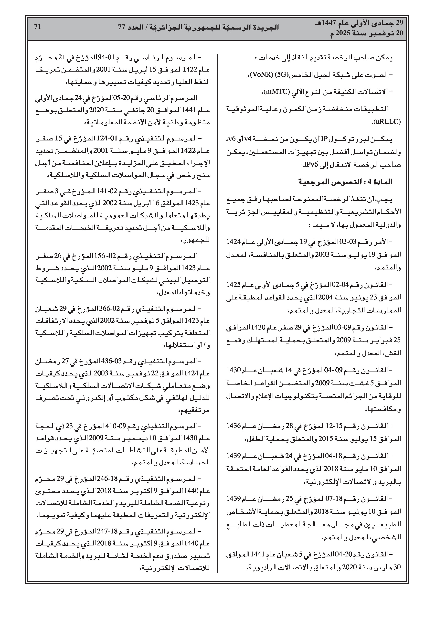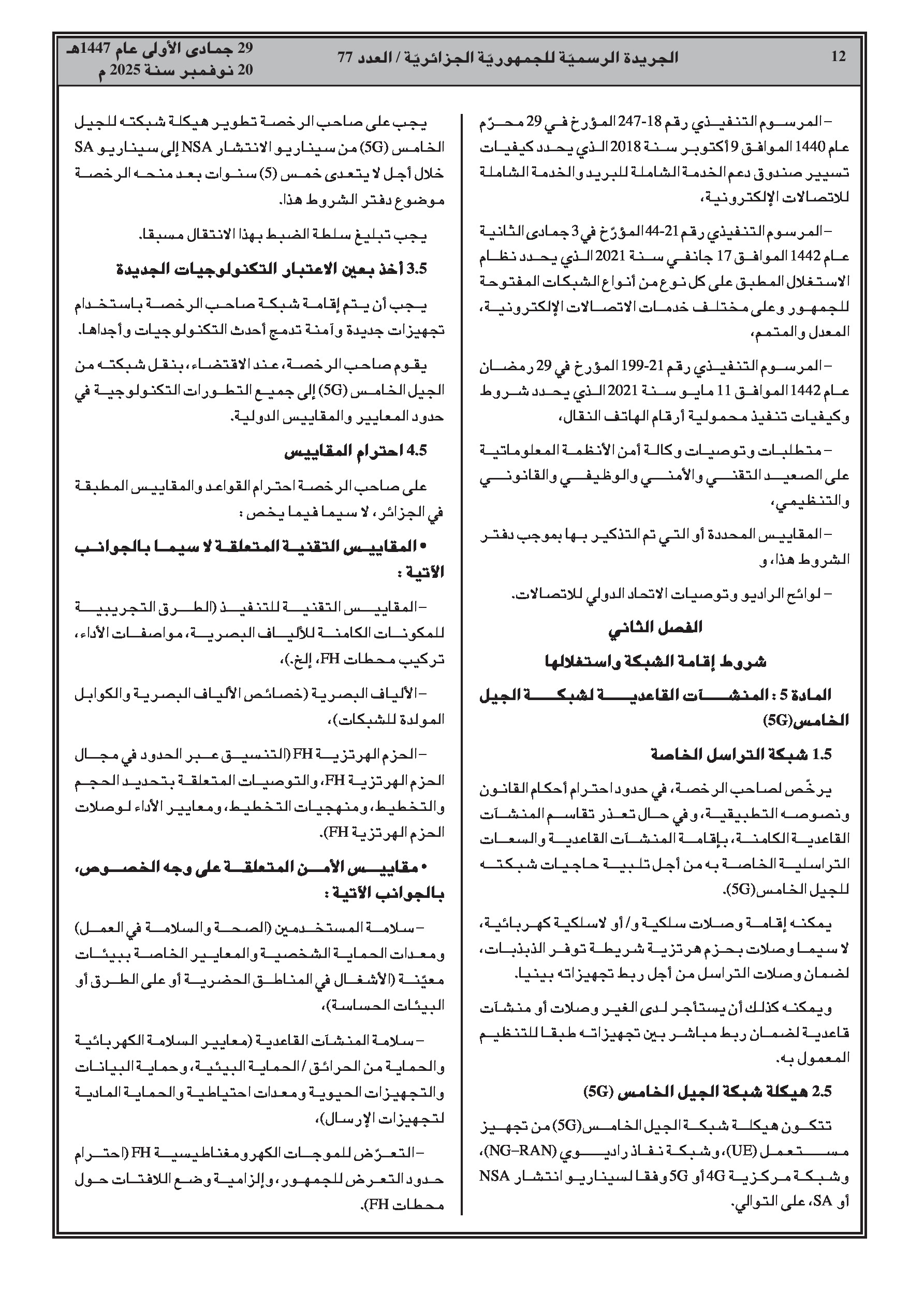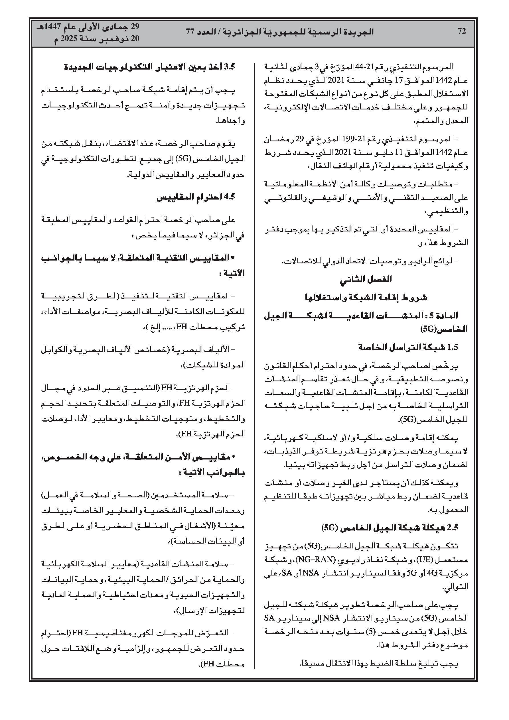 مراسيم تنفيذية توافق على منح تراخيص الجيل الخامس لشركات ATM Mobilis، Wataniya Télécom Algérie (Ooredoo)، و Optimum Télécom Algérie (Djezzy)، محددةً الشروط التقنية، المالية، ونطاق التغطية.