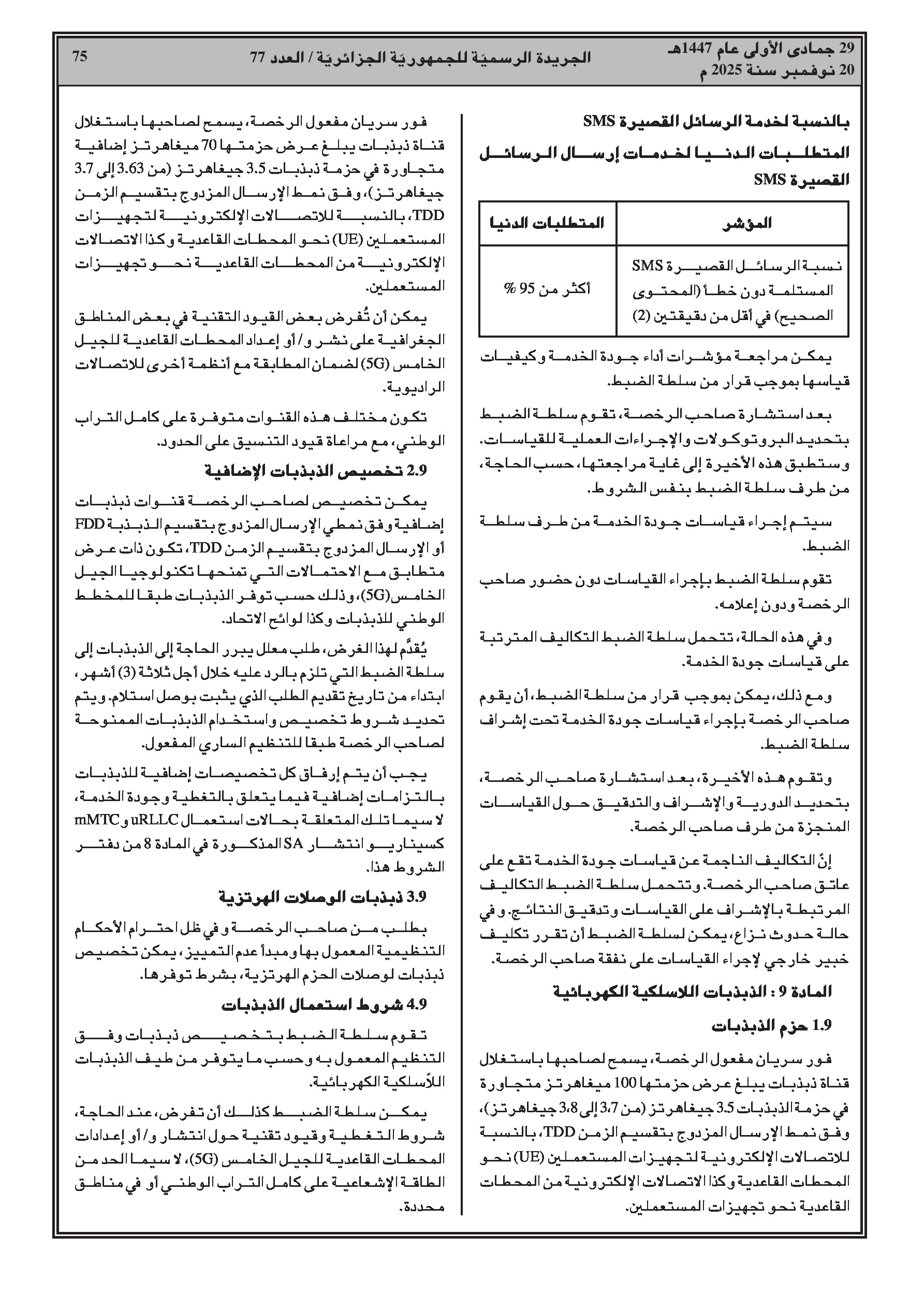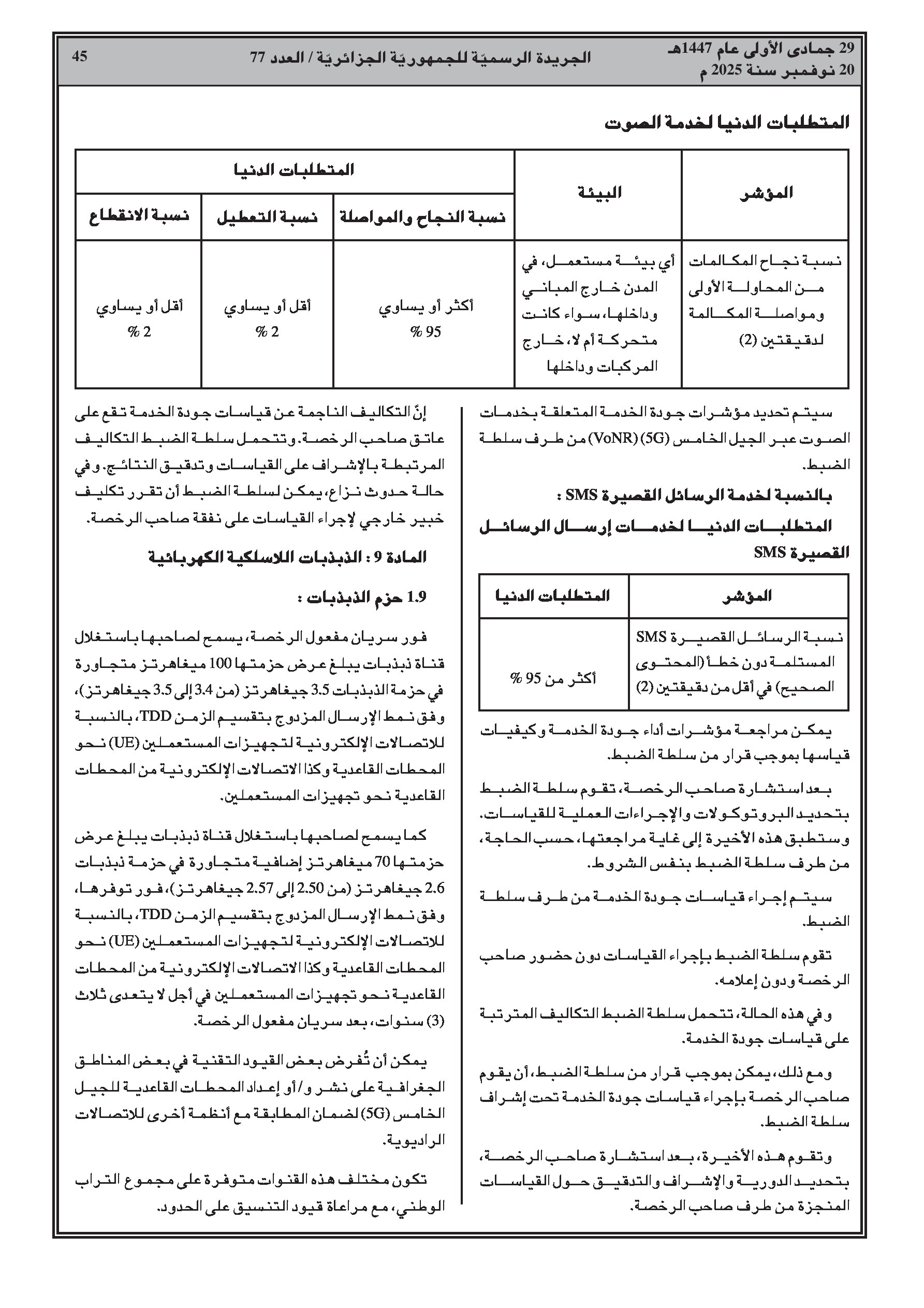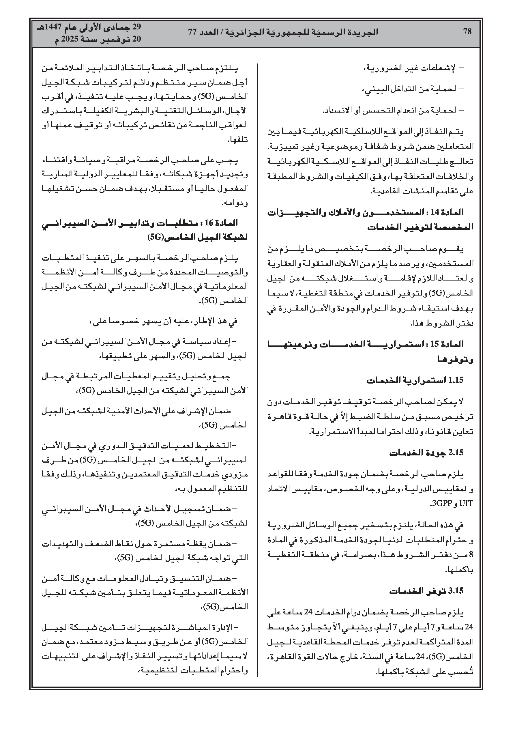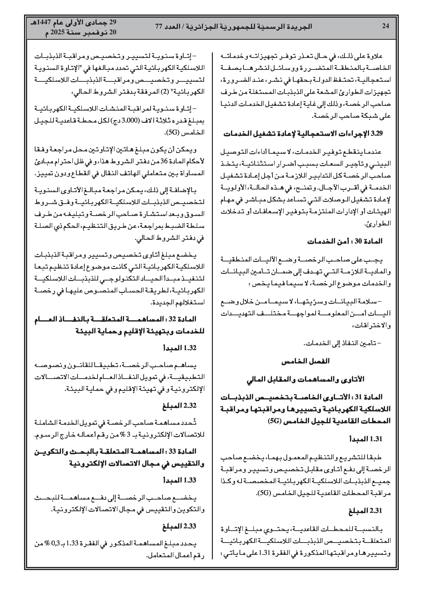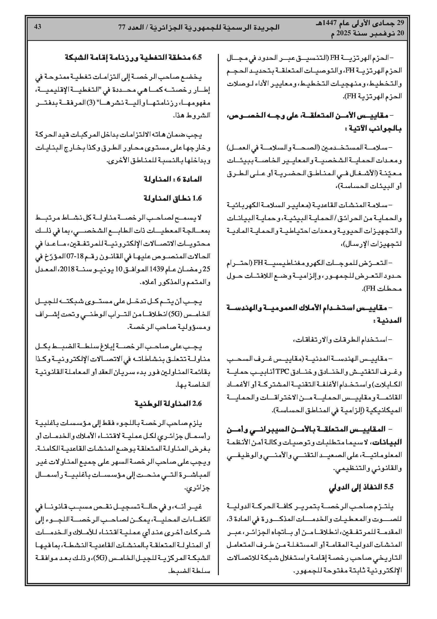 مراسيم تنفيذية توافق على منح تراخيص الجيل الخامس لشركات ATM Mobilis، Wataniya Télécom Algérie (Ooredoo)، و Optimum Télécom Algérie (Djezzy)، محددةً الشروط التقنية، المالية، ونطاق التغطية.