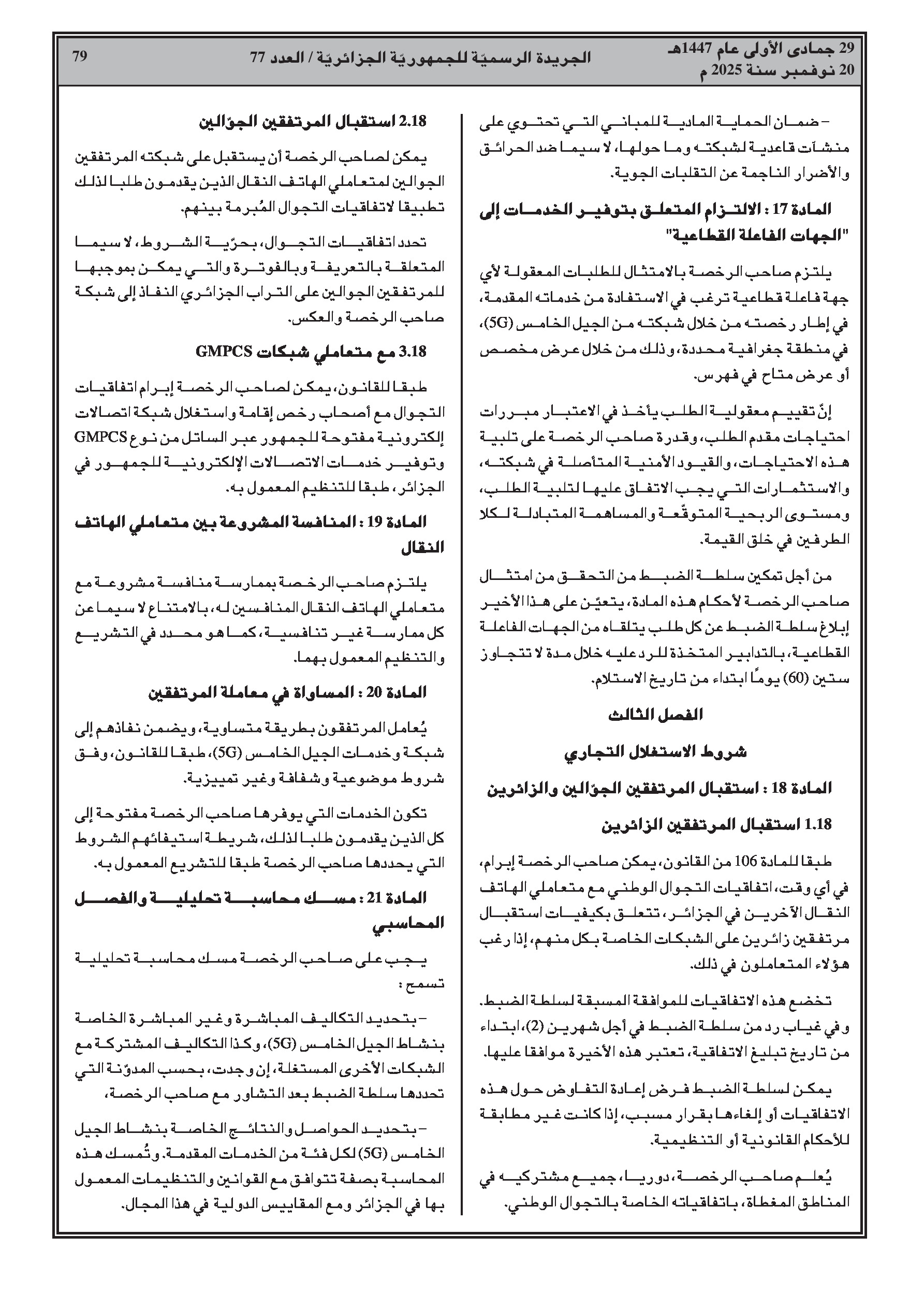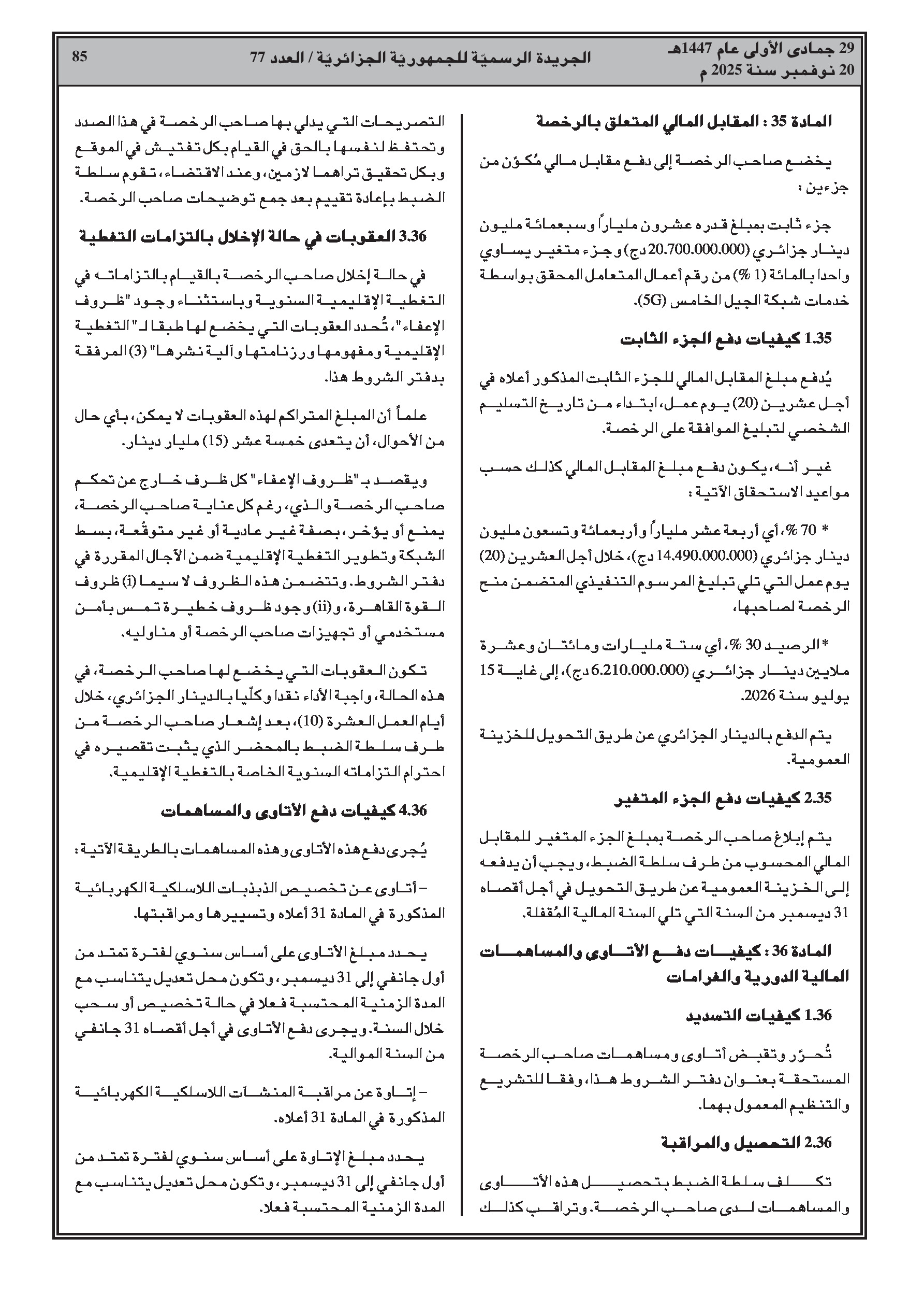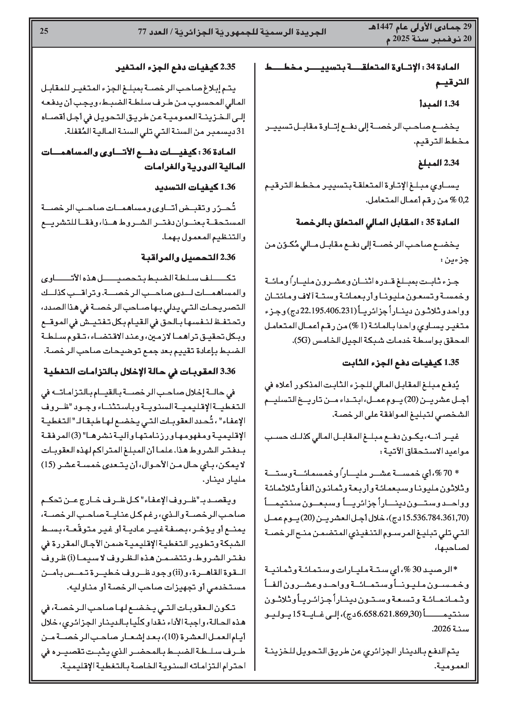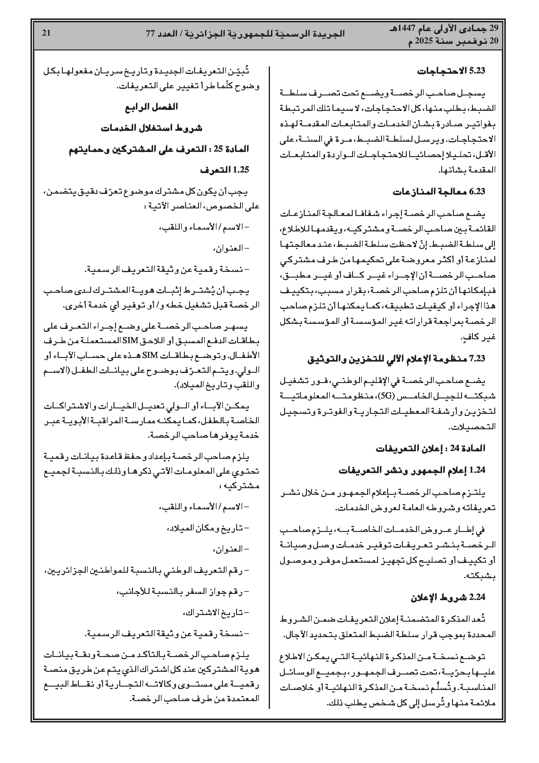 مراسيم تنفيذية توافق على منح تراخيص الجيل الخامس لشركات ATM Mobilis، Wataniya Télécom Algérie (Ooredoo)، و Optimum Télécom Algérie (Djezzy)، محددةً الشروط التقنية، المالية، ونطاق التغطية.