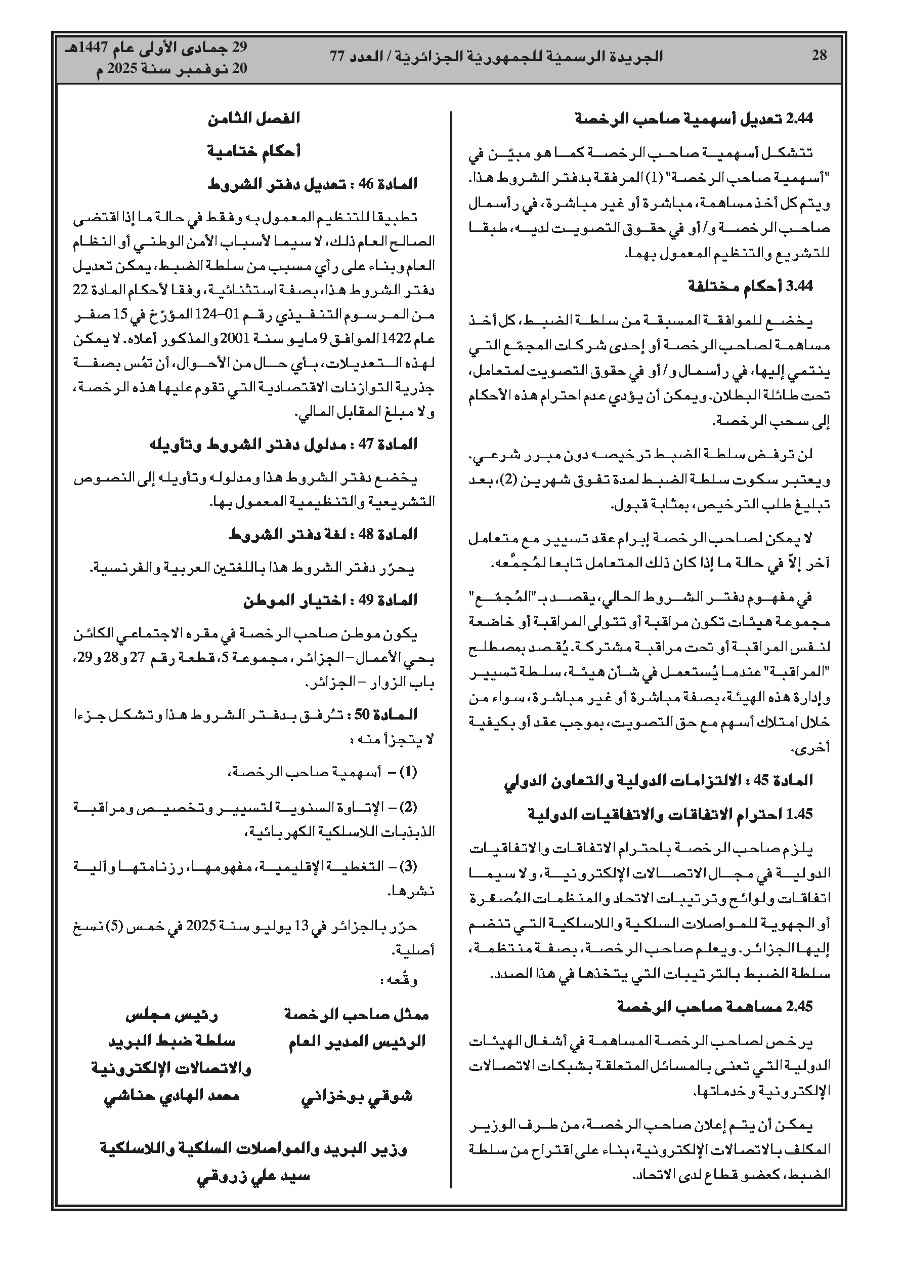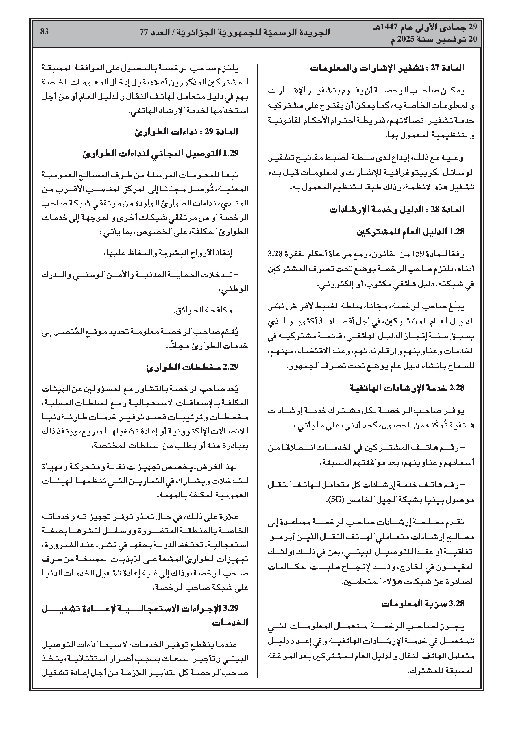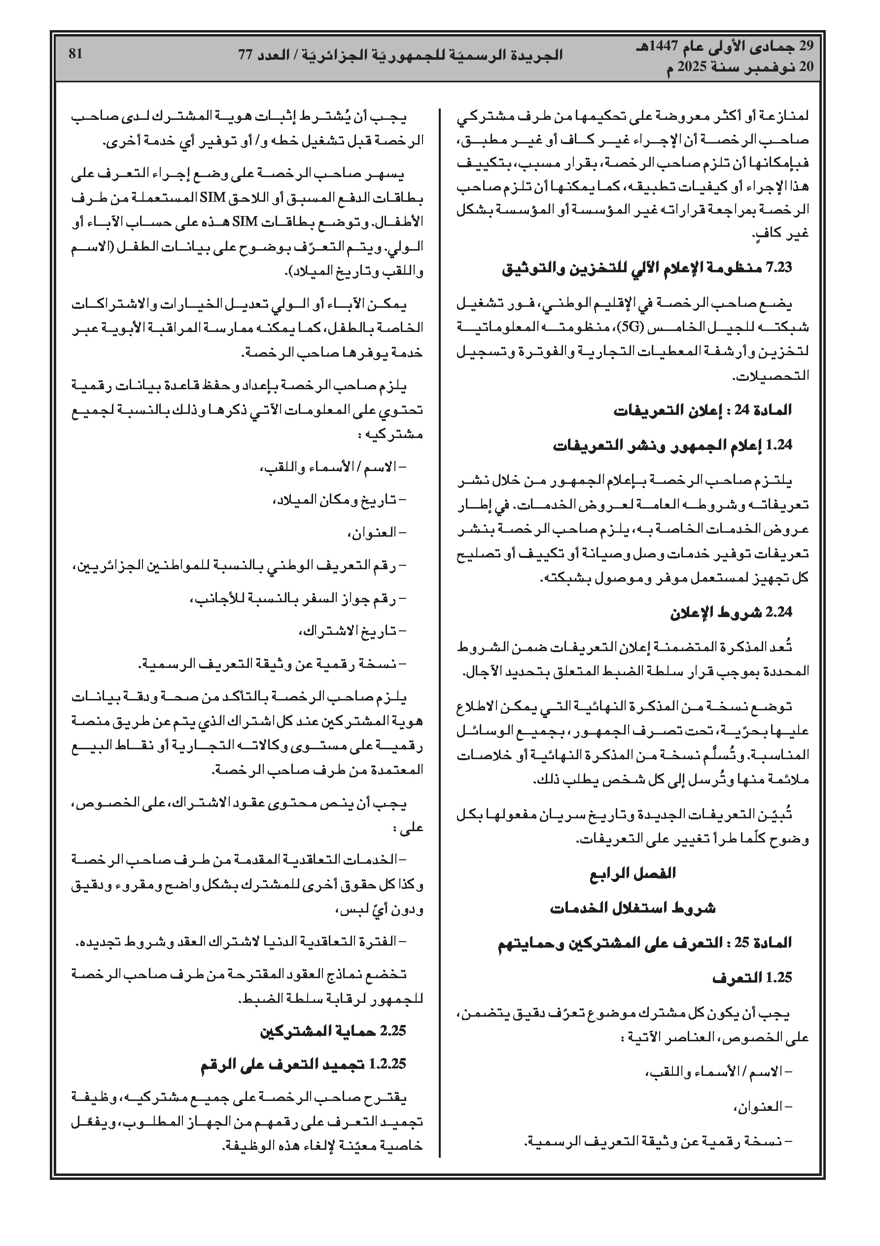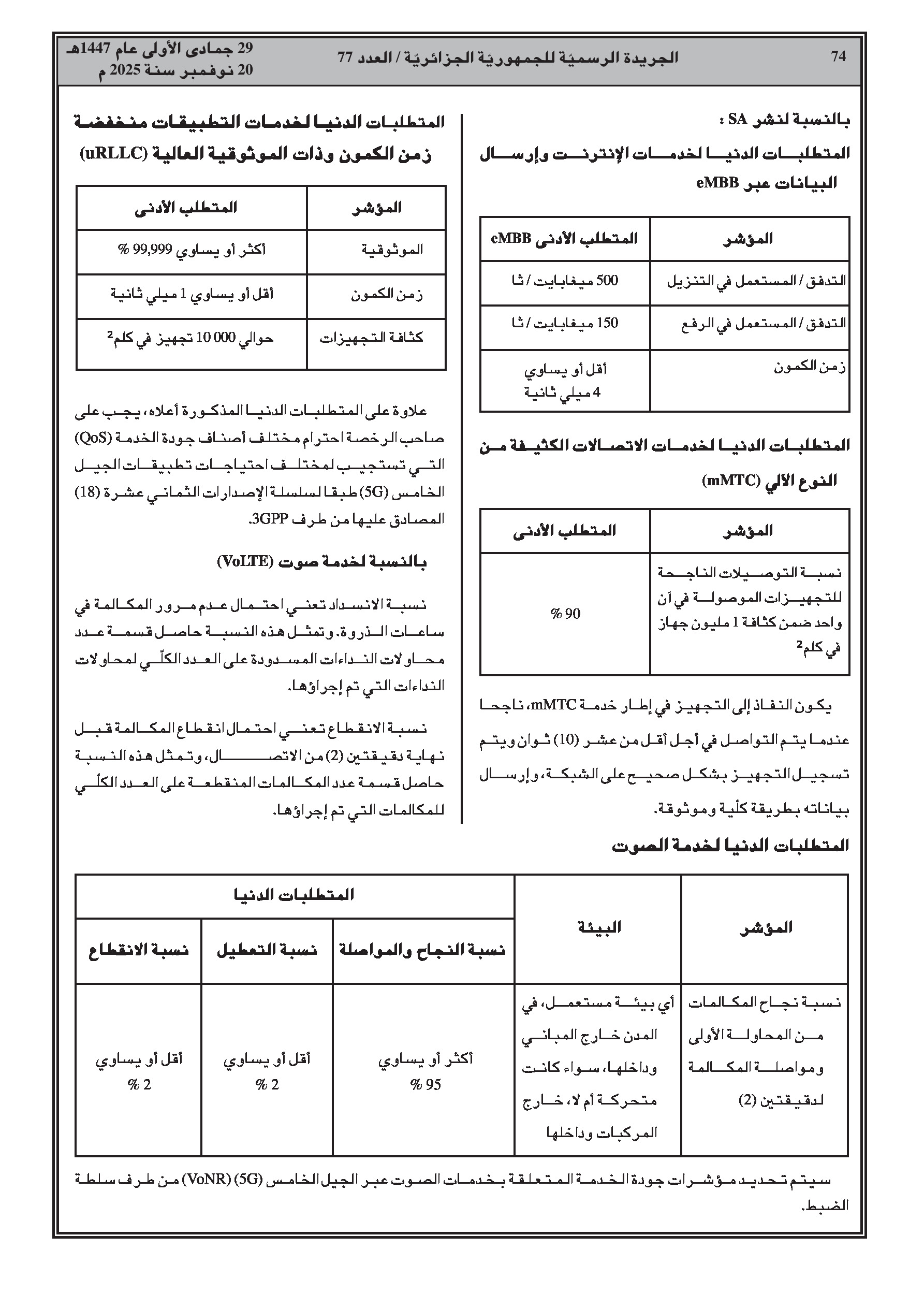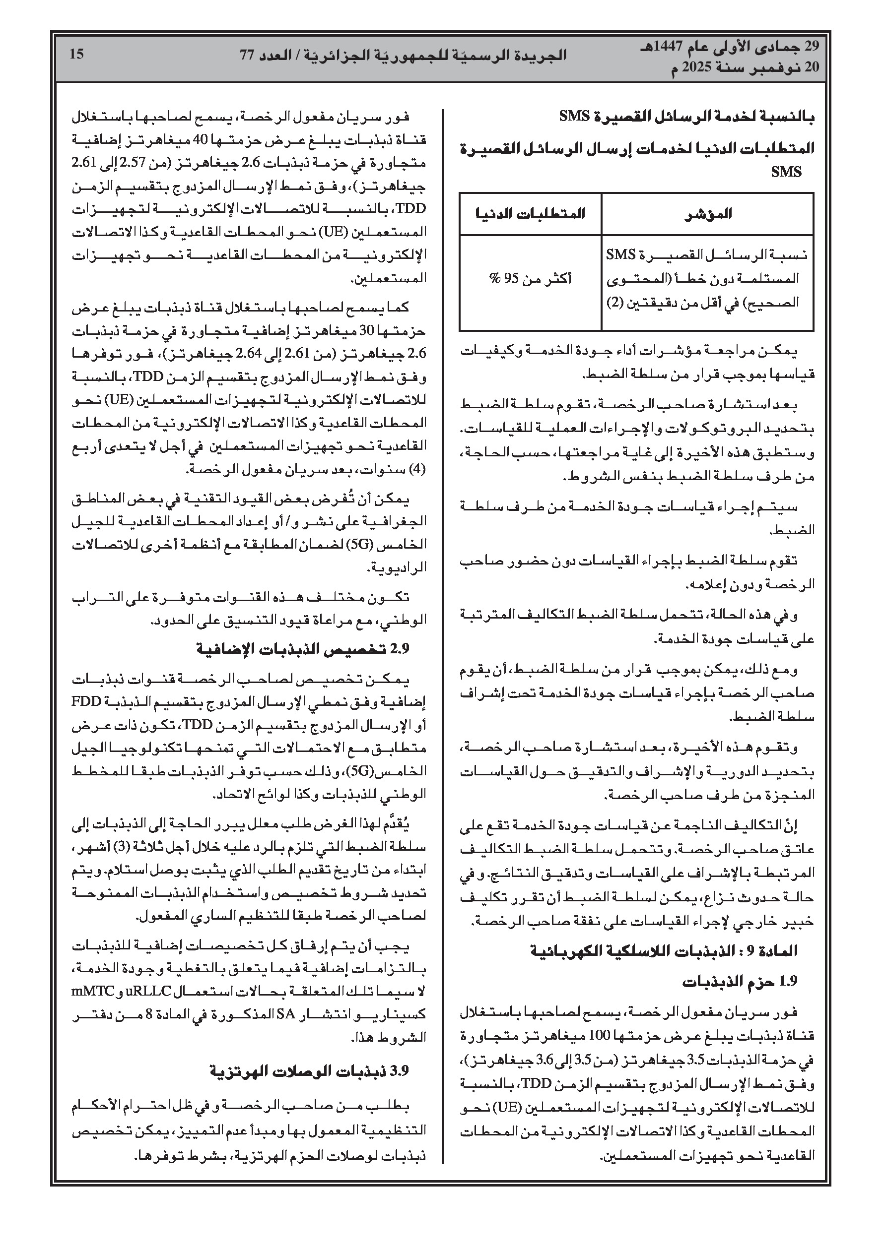 مراسيم تنفيذية توافق على منح تراخيص الجيل الخامس لشركات ATM Mobilis، Wataniya Télécom Algérie (Ooredoo)، و Optimum Télécom Algérie (Djezzy)، محددةً الشروط التقنية، المالية، ونطاق التغطية.