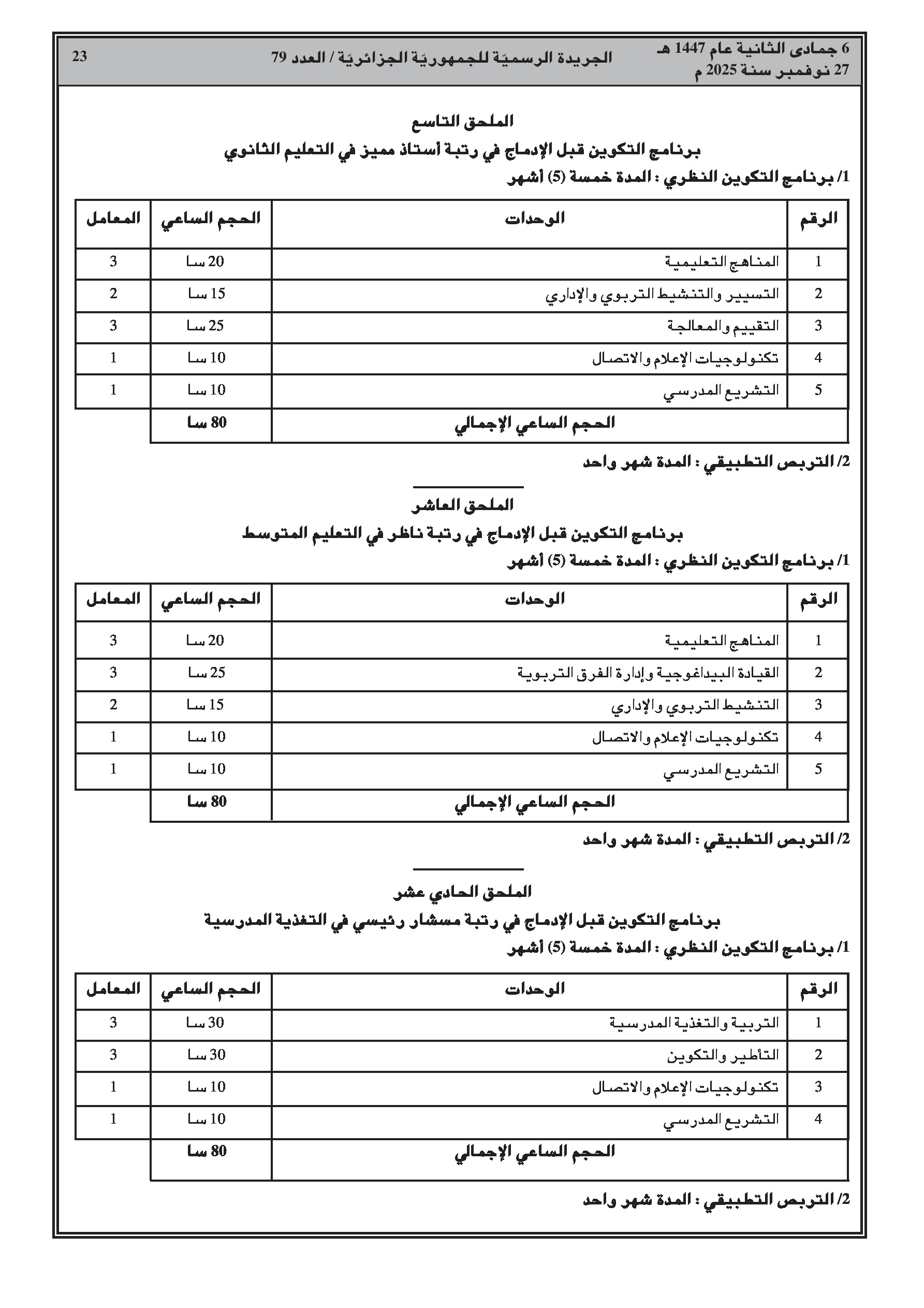 - ضبط مدة ومحتوى التكوين المسبق للإدماج في رتب أساتذة التعليم (ابتدائي، متوسط، ثانوي) والمفتشين.