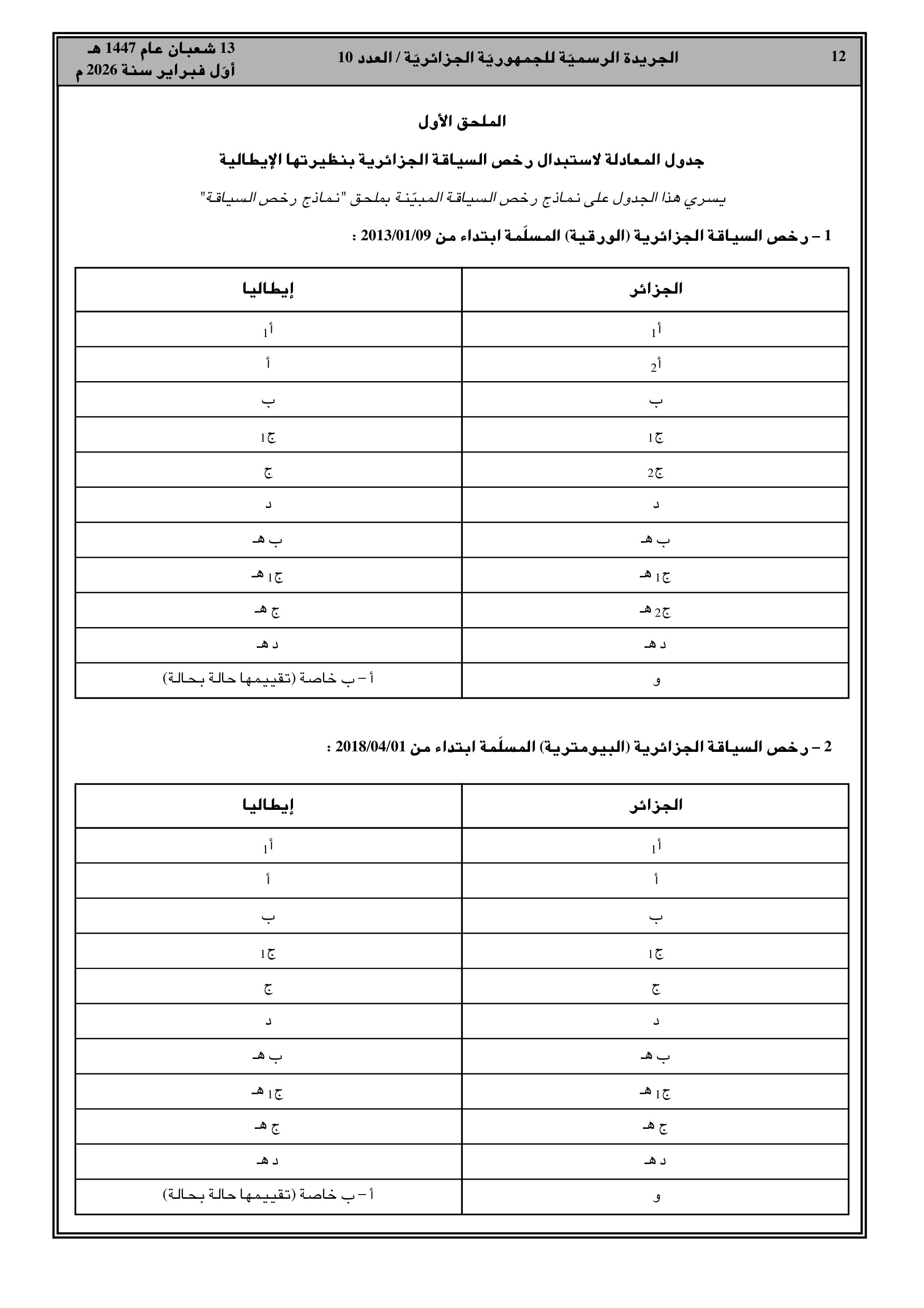 تحديد جداول المعادلة بين أصناف الرخص الجزائرية والإيطالية (الملاحق).