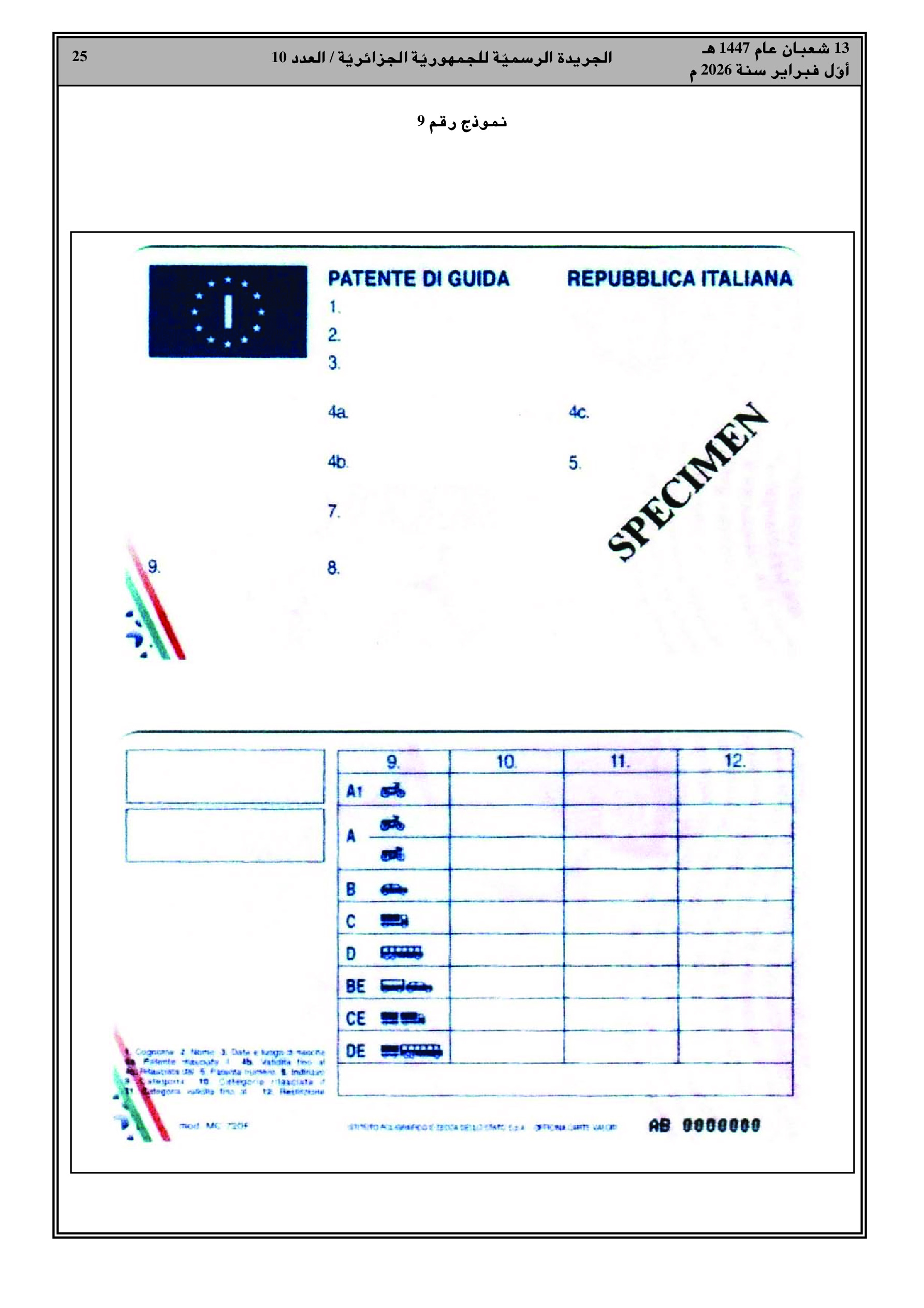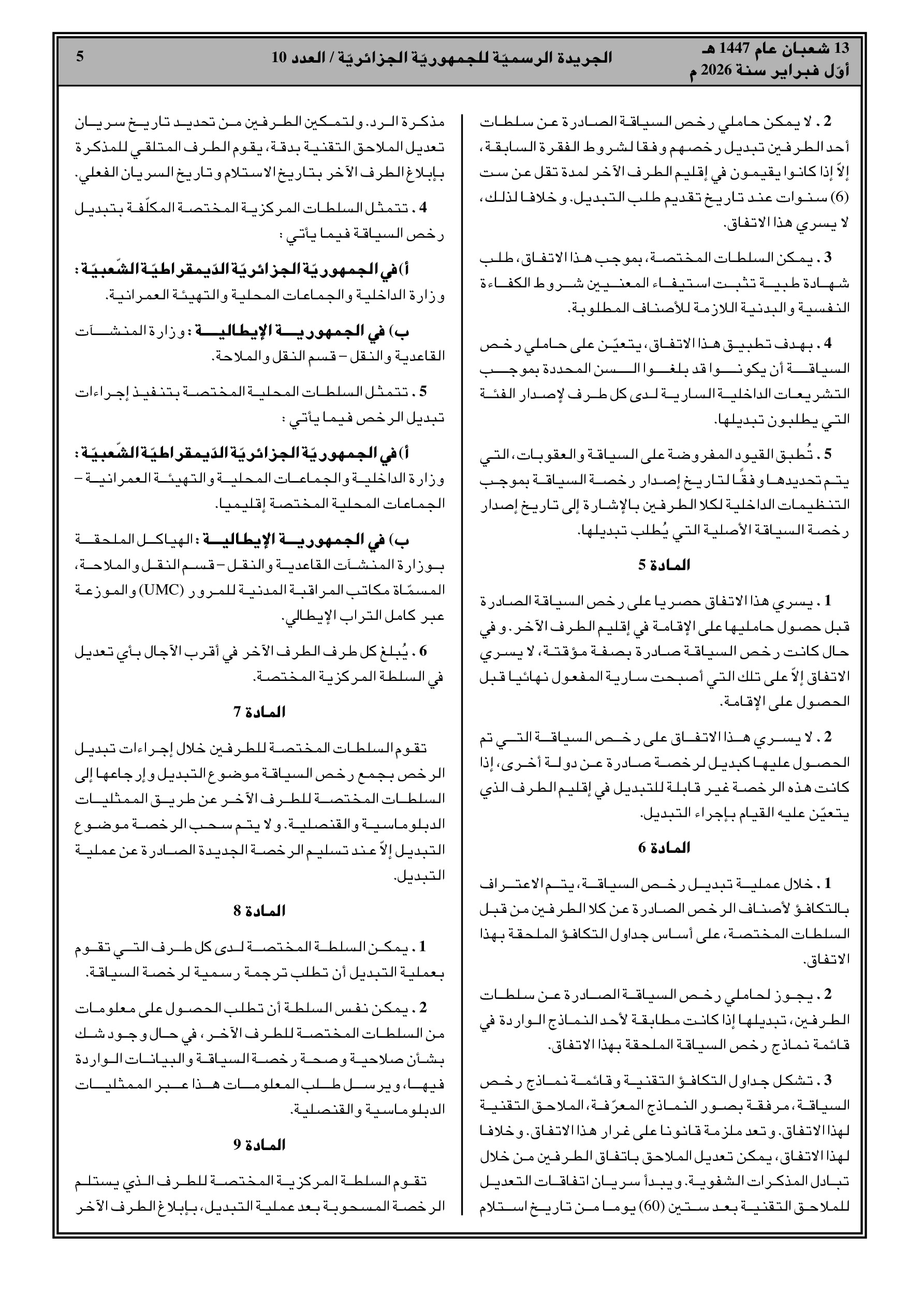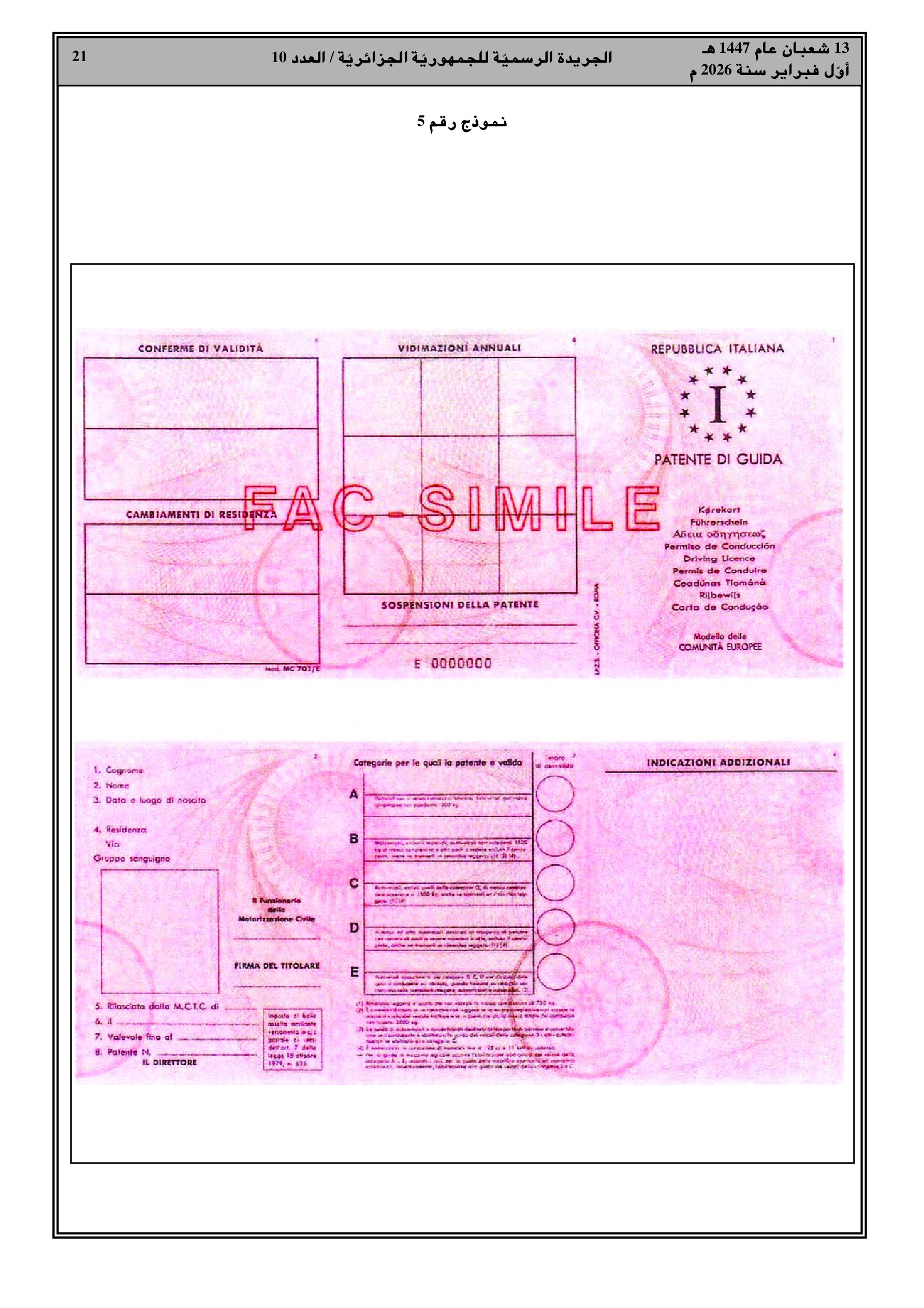 مرسوم رئاسي يصادق على الاتفاقية بين الجزائر وإيطاليا حول الاعتراف المتبادل برخص السياقة واستبدالها.