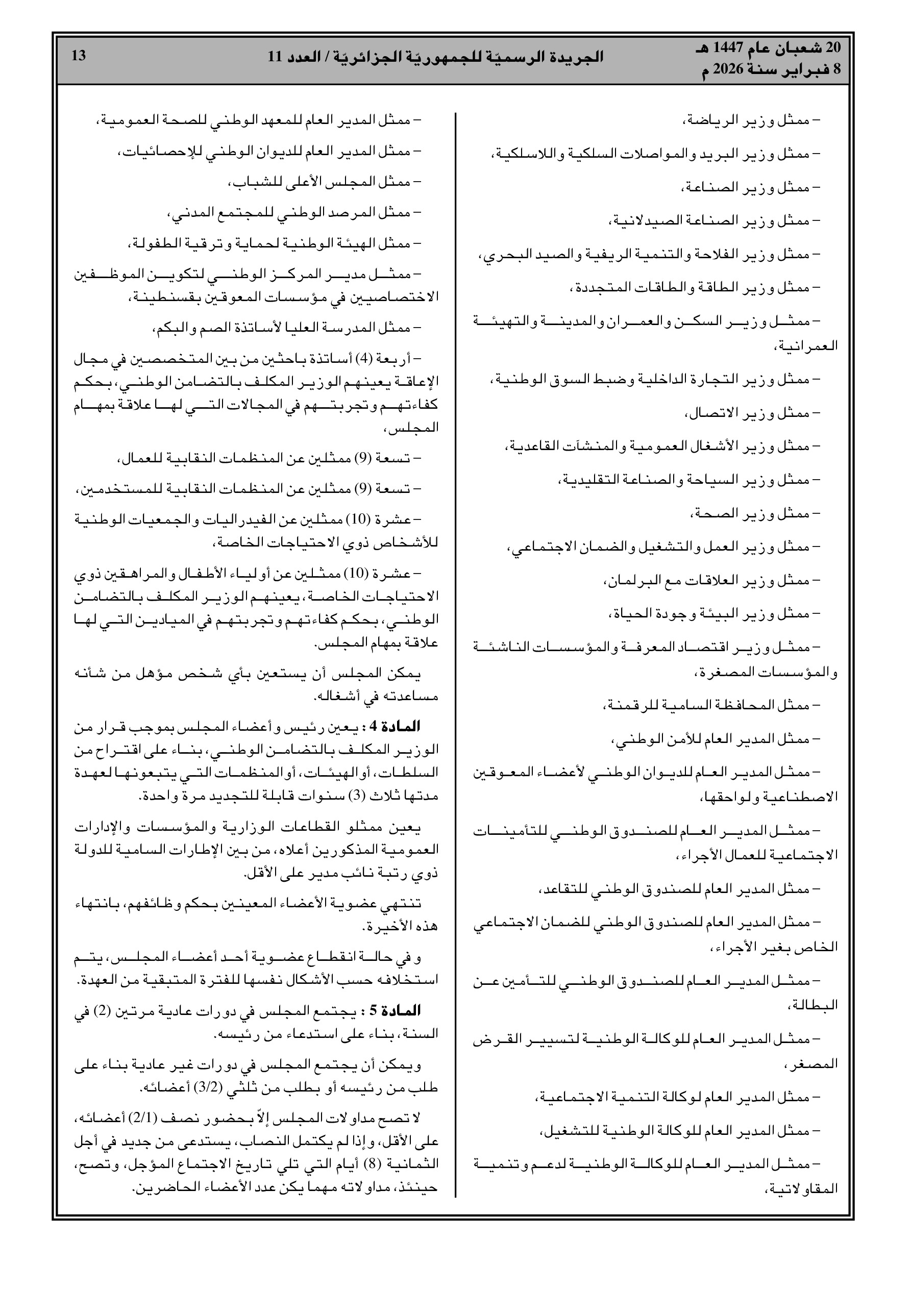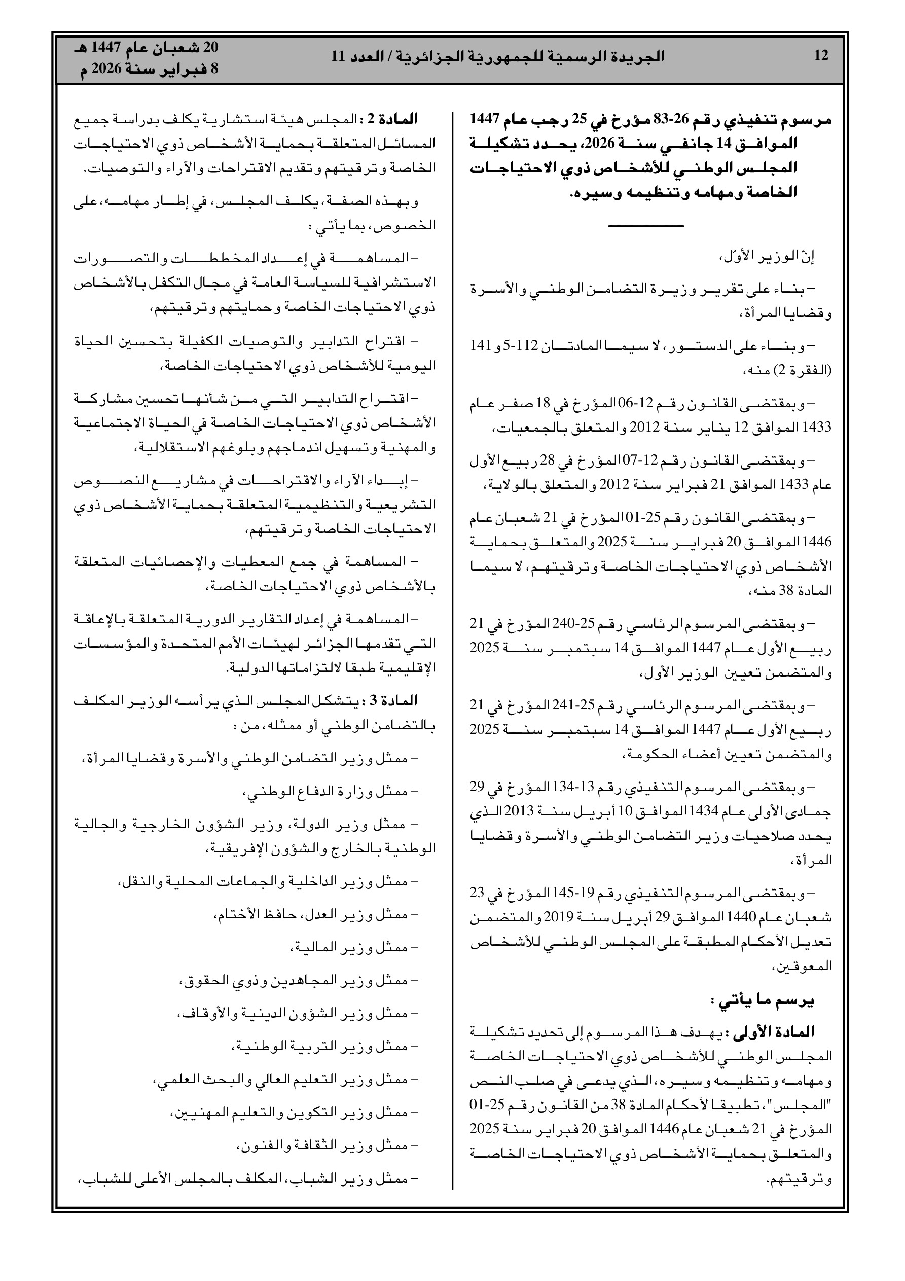 مرسوم تنفيذي رقم 26-83: تأسيس المجلس الوطني للأشخاص ذوي الاحتياجات الخاصة كهيئة استشارية لدراسة سياسات الحماية والادماج المهني والاجتماعي.