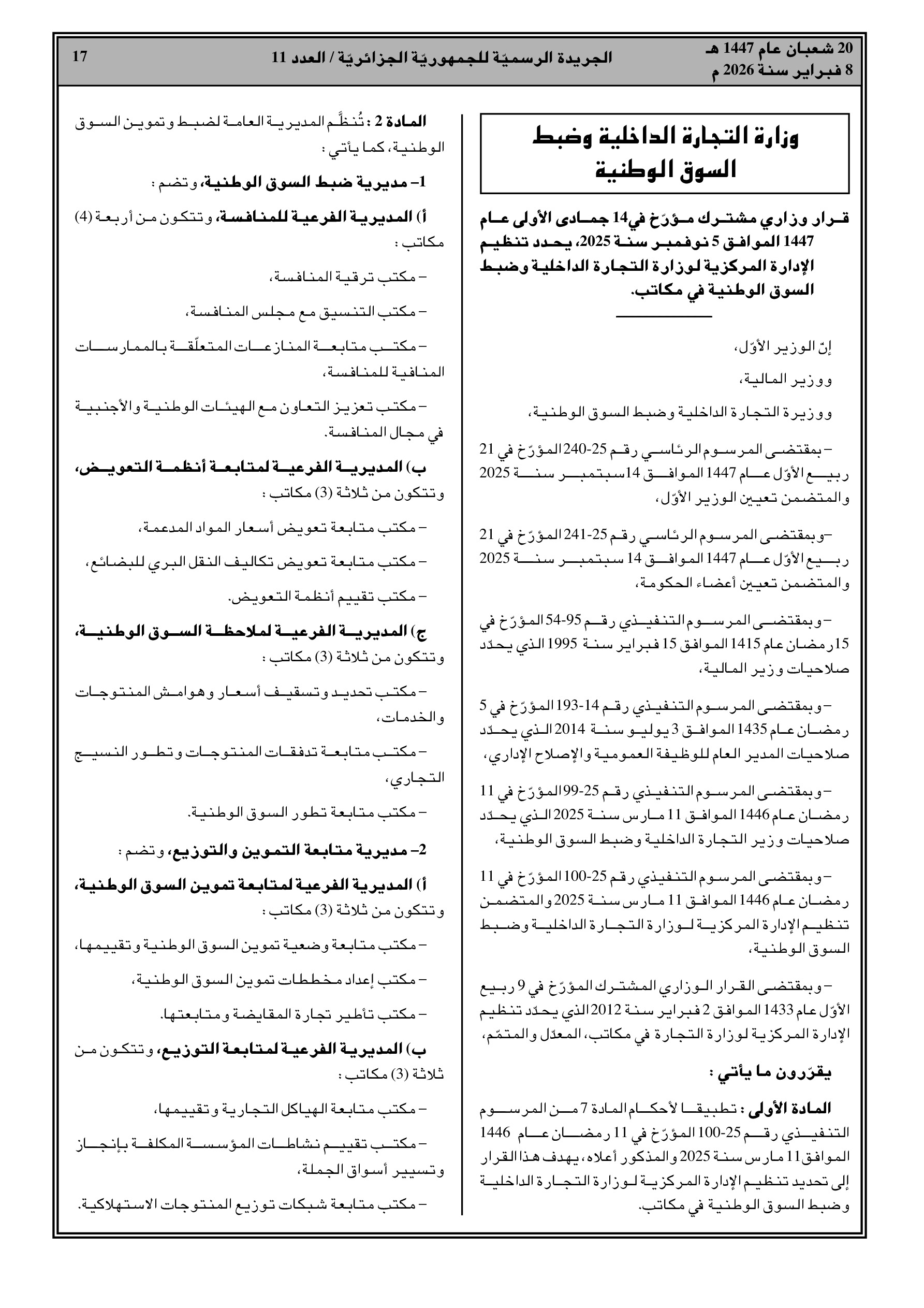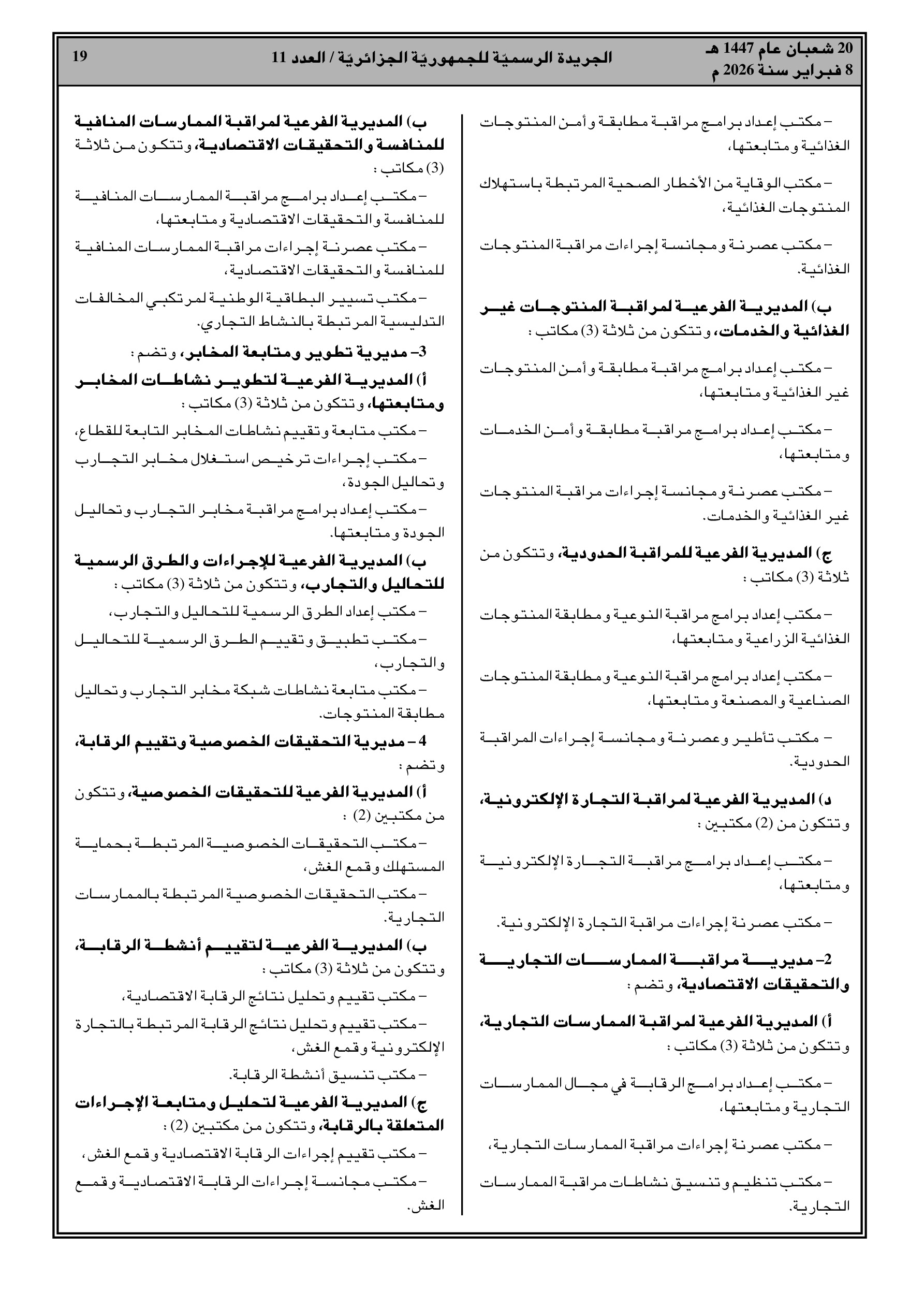 قرار وزاري مشترك يحدد المديريات العامة: ضبط السوق، التموين، الرقابة الاقتصادية وقمع الغش.