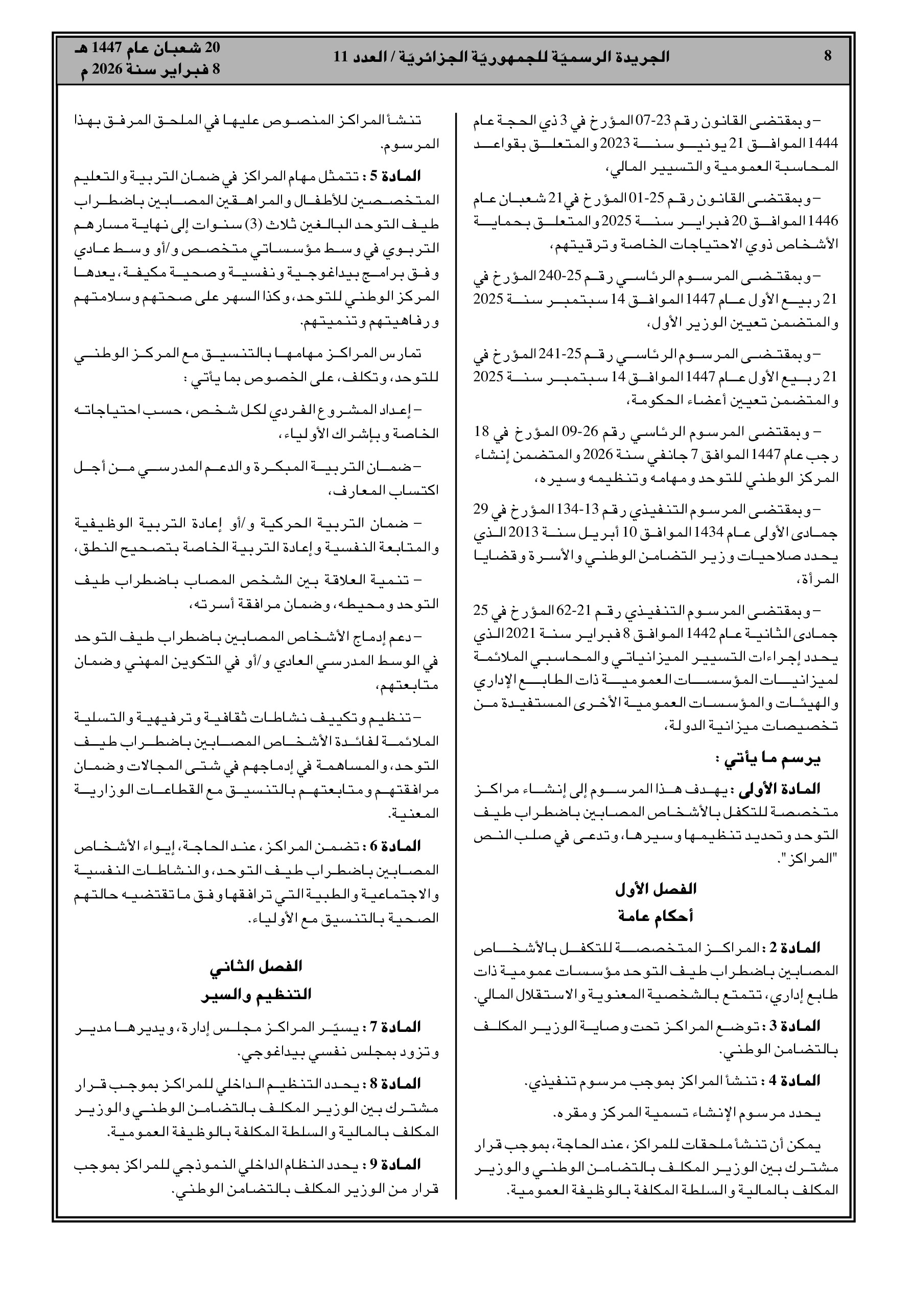 مرسوم تنفيذي رقم 26-82: إنشاء مراكز متخصصة للتكفل بالأطفال (من 3 سنوات) والمراهقين المصابين بطيف التوحد في تيبازة، وهران، تبسة، وبشار.