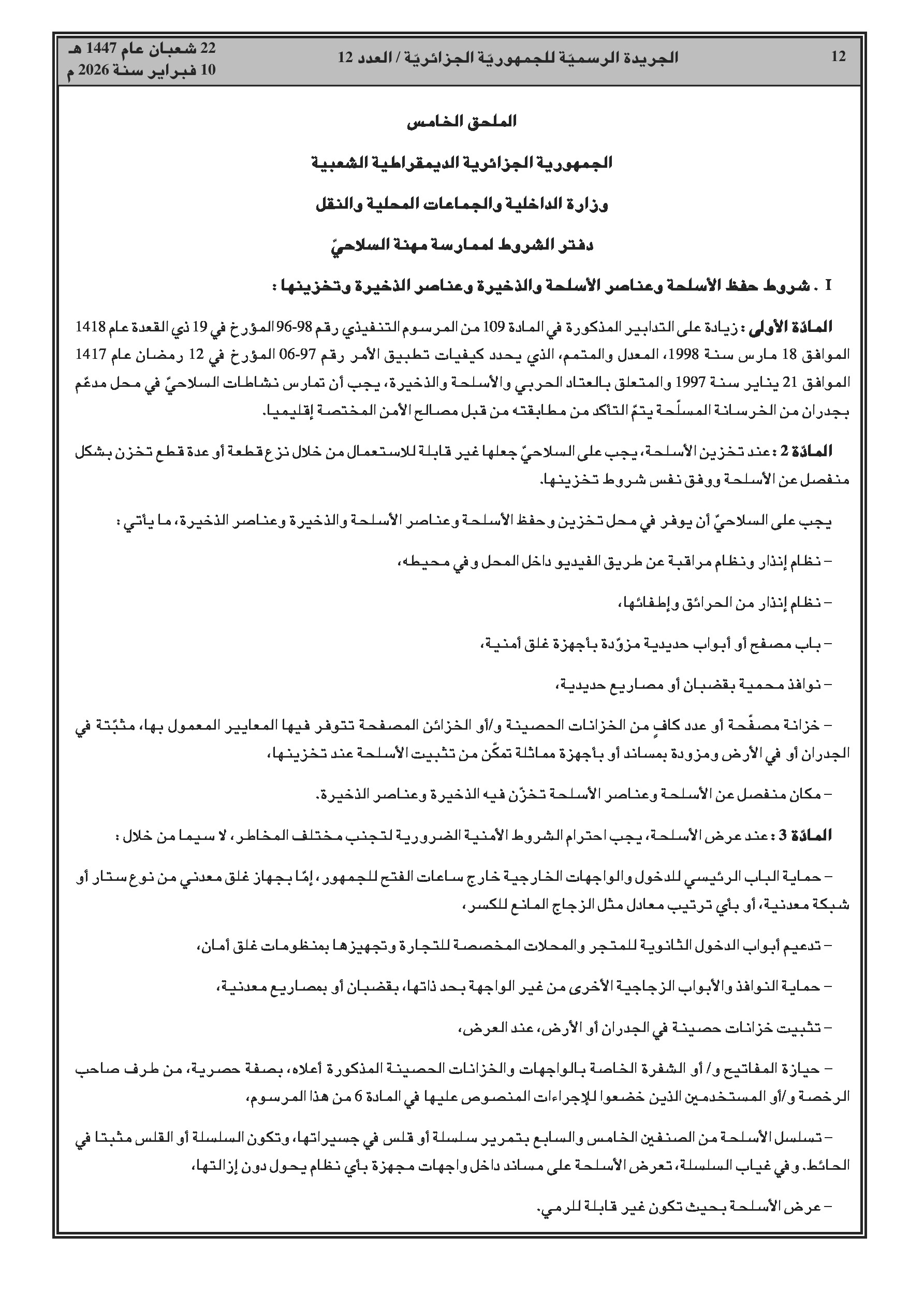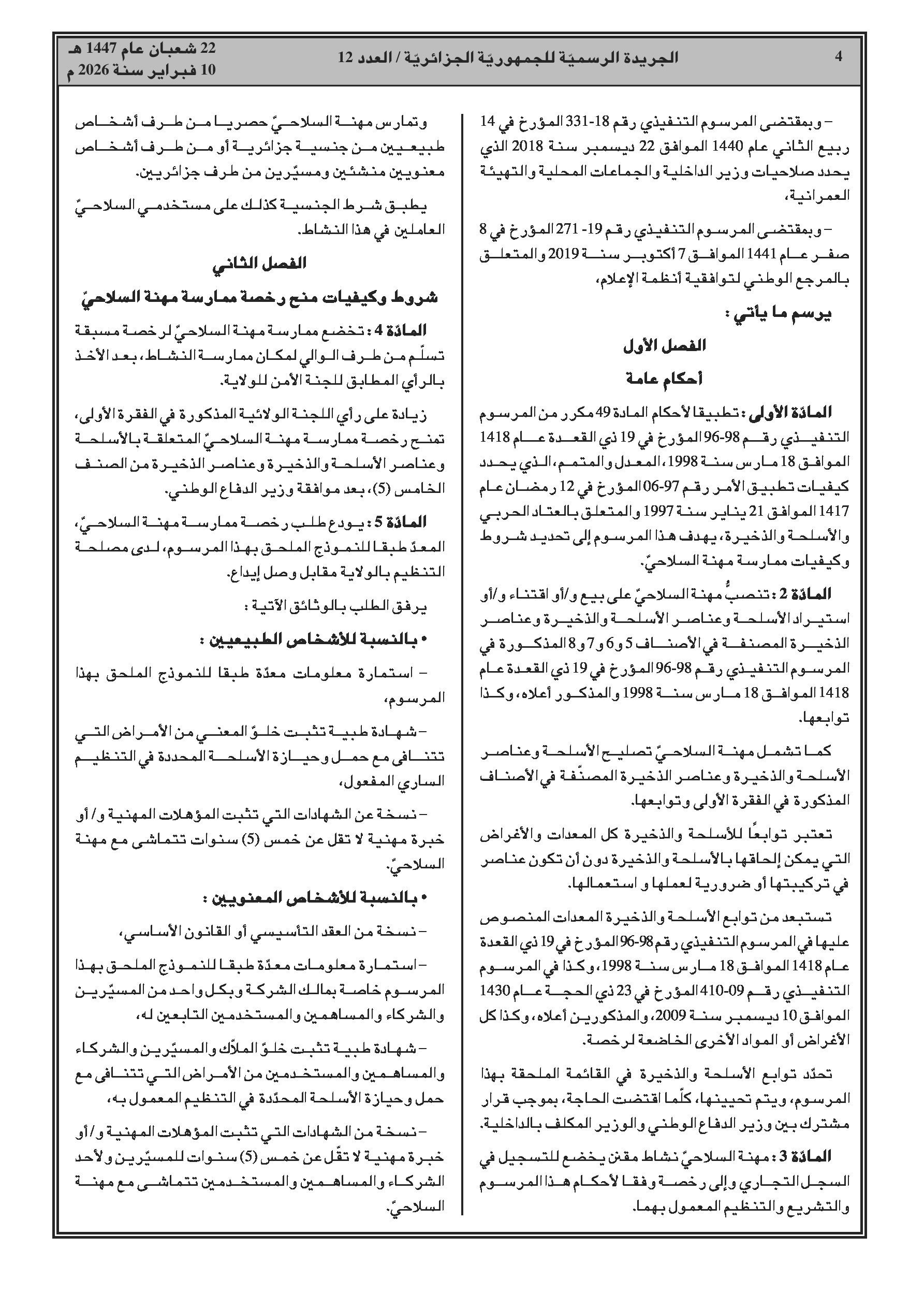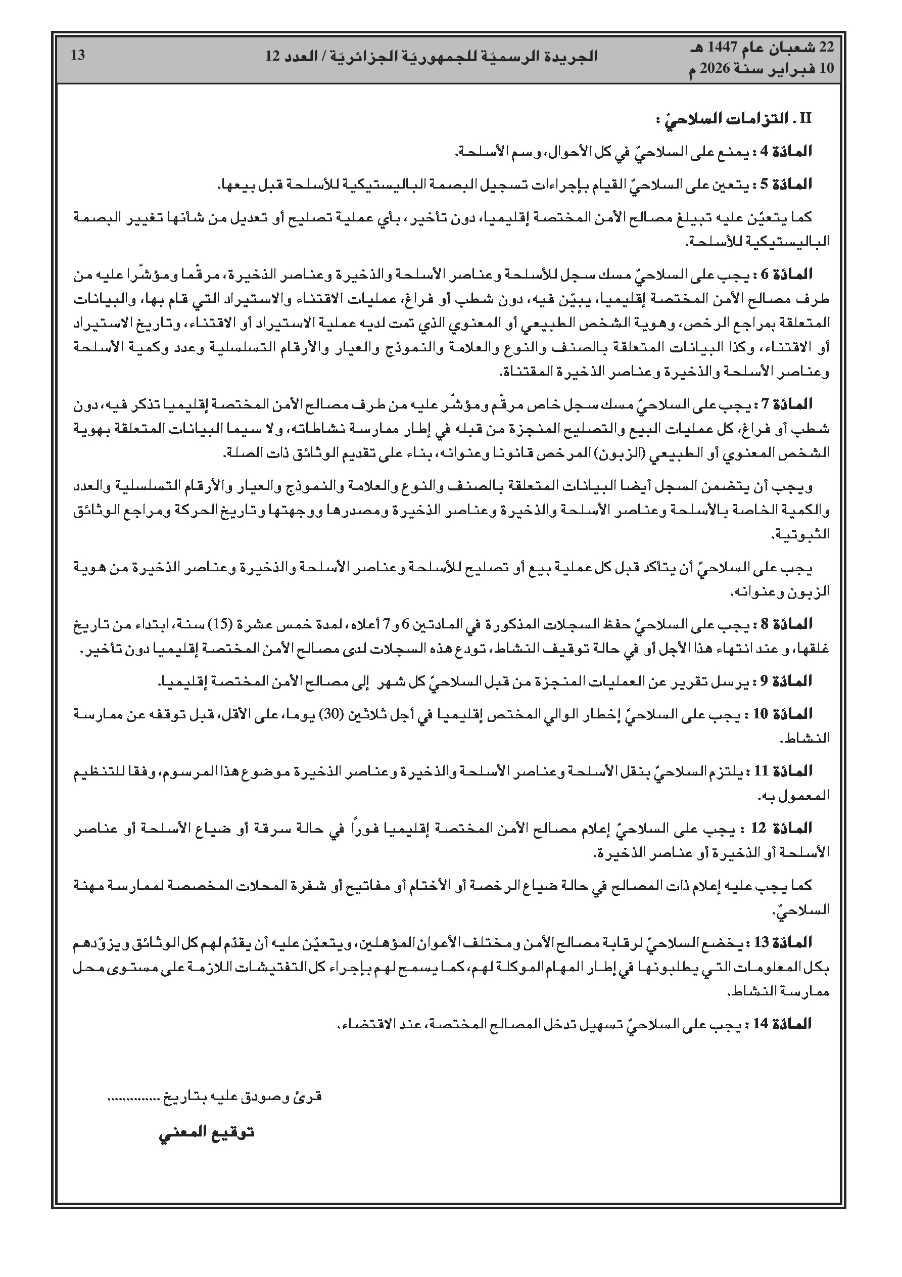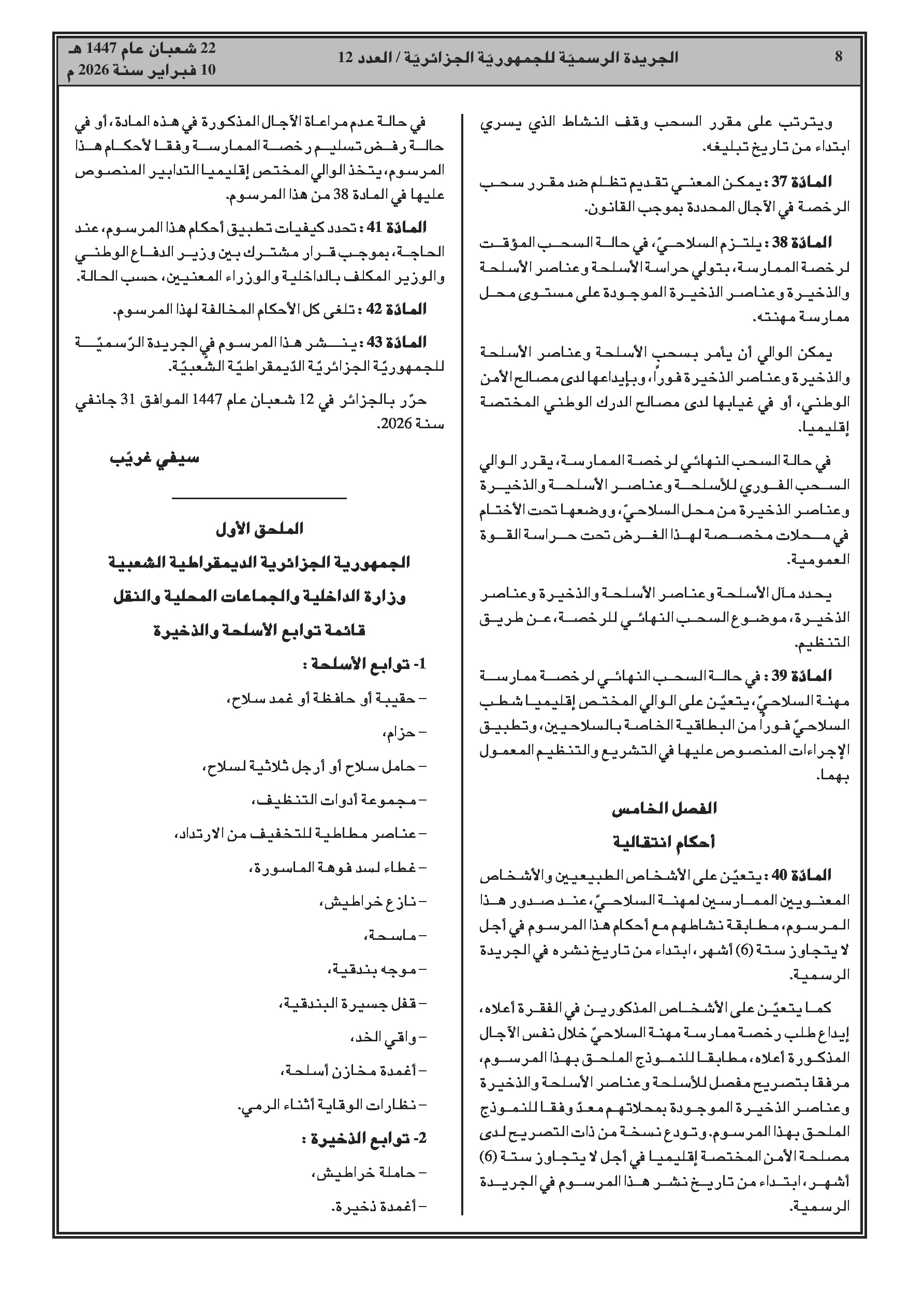 مرسوم تنفيذي يحدد القواعد الصارمة لبيع، شراء، استيراد، وإصلاح الأسلحة والذخيرة، وشروط الأمن المطلوبة.